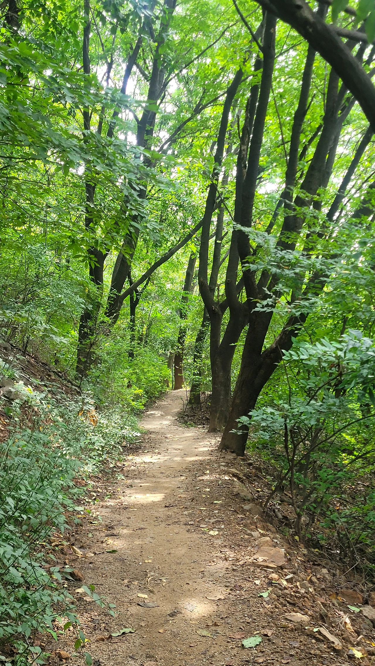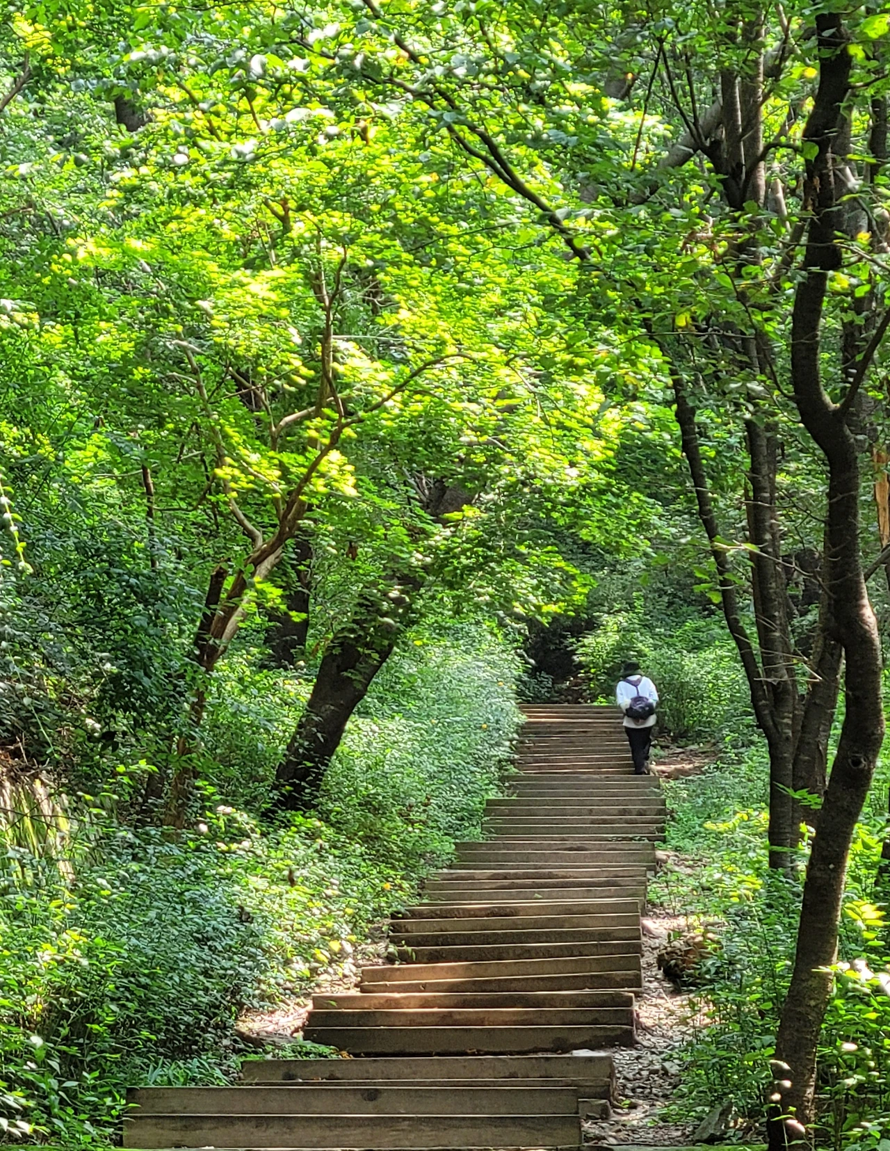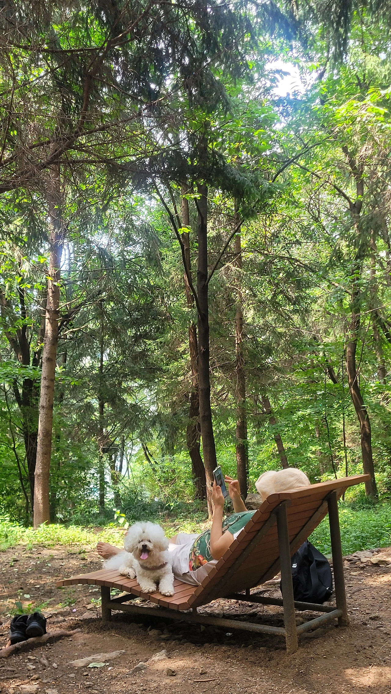 도심에 이런 좋은 숲이 있다는 사실이 감사하다. 이곳에는 맨발로 걷는 황톳길이 세심하게 관리되어 최상의 수준이다. 안산 자락에는 무장애 길뿐 아니라 반려견과 걸을 수 있는 숲길도 조성되어 있다. 그곳에서 강아지와 함께 산책을 하다 쉬는 시간에 누린 여유다. 여름날 좋은 추억 하나를 얻었다.