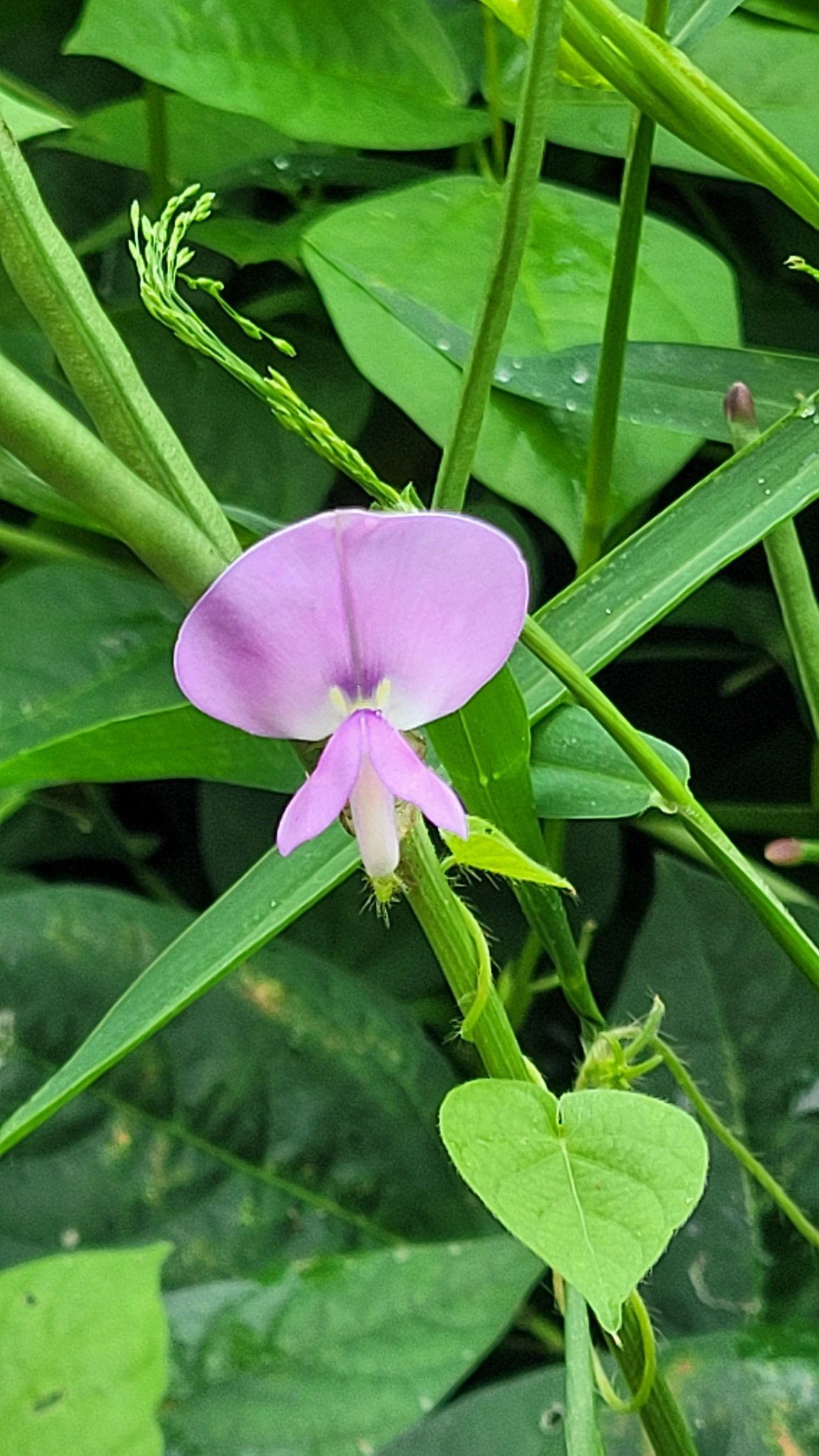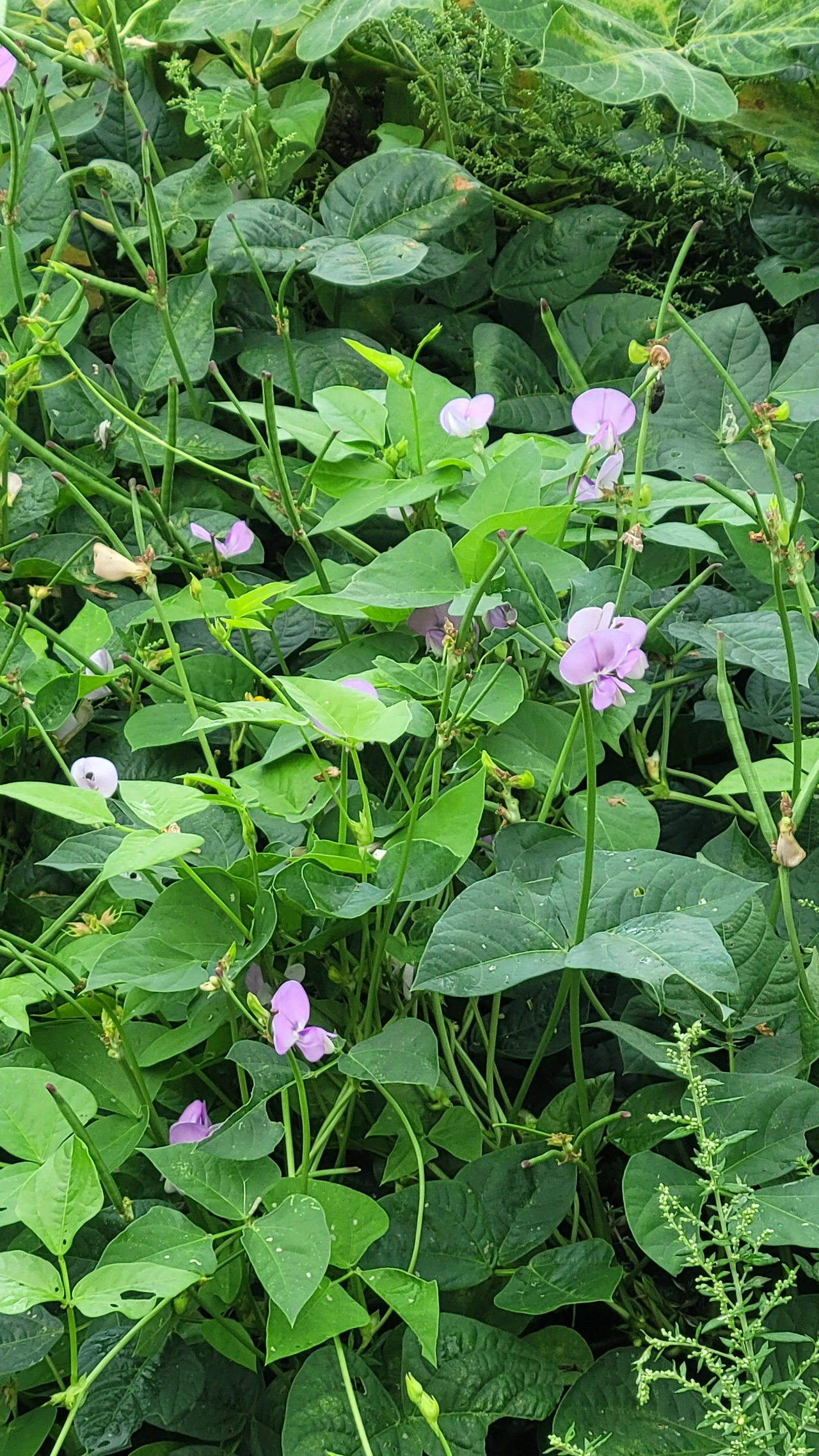 창문을 모두 열어놓고 잤다. 이곳은 대지 200평으로 100평씩 나누어 집을 지을 수 있게 기초공사가 되어있다. 두 공간 사이에는 맨땅이 있어 수풀이 무성하게 자란다. 일어나자마자 창밖을 보니 콩꼬투리를 달고 있는 덩굴 식물이 분홍빛 꽃을 피워 아예 꽃밭을 이뤘다. 야생콩인가 했더니 콩 꼬투리에 아주 작은 콩들이 들어있는 동부란다. 이 아이들도 나팔꽃처럼 아침에 꽃이 벙글어지고 낮에는 꽃봉오리가 닫힌다. 물기를 머금어 금방 세수를 하고 난 것처럼 싱그럽고 어린아이가 생글거리며 웃는 것 같이 앙증맞다. 생각지 못한 꽃밭에 마음이 환해진다. 콩꽃 너머 하늘에는 구름이 뒤덮인 사이로 푸른 하늘이 슬쩍슬쩍 내비친다.