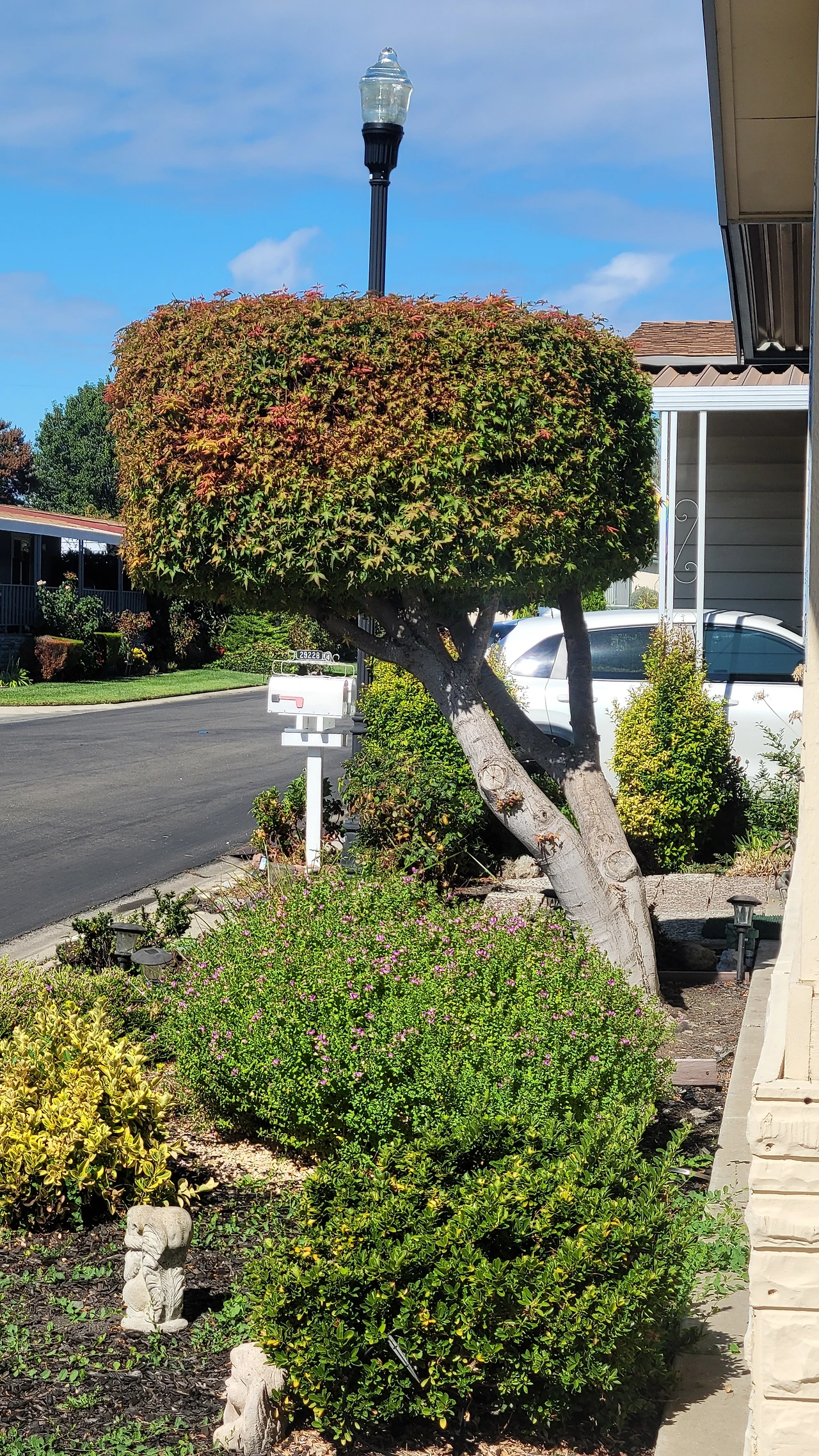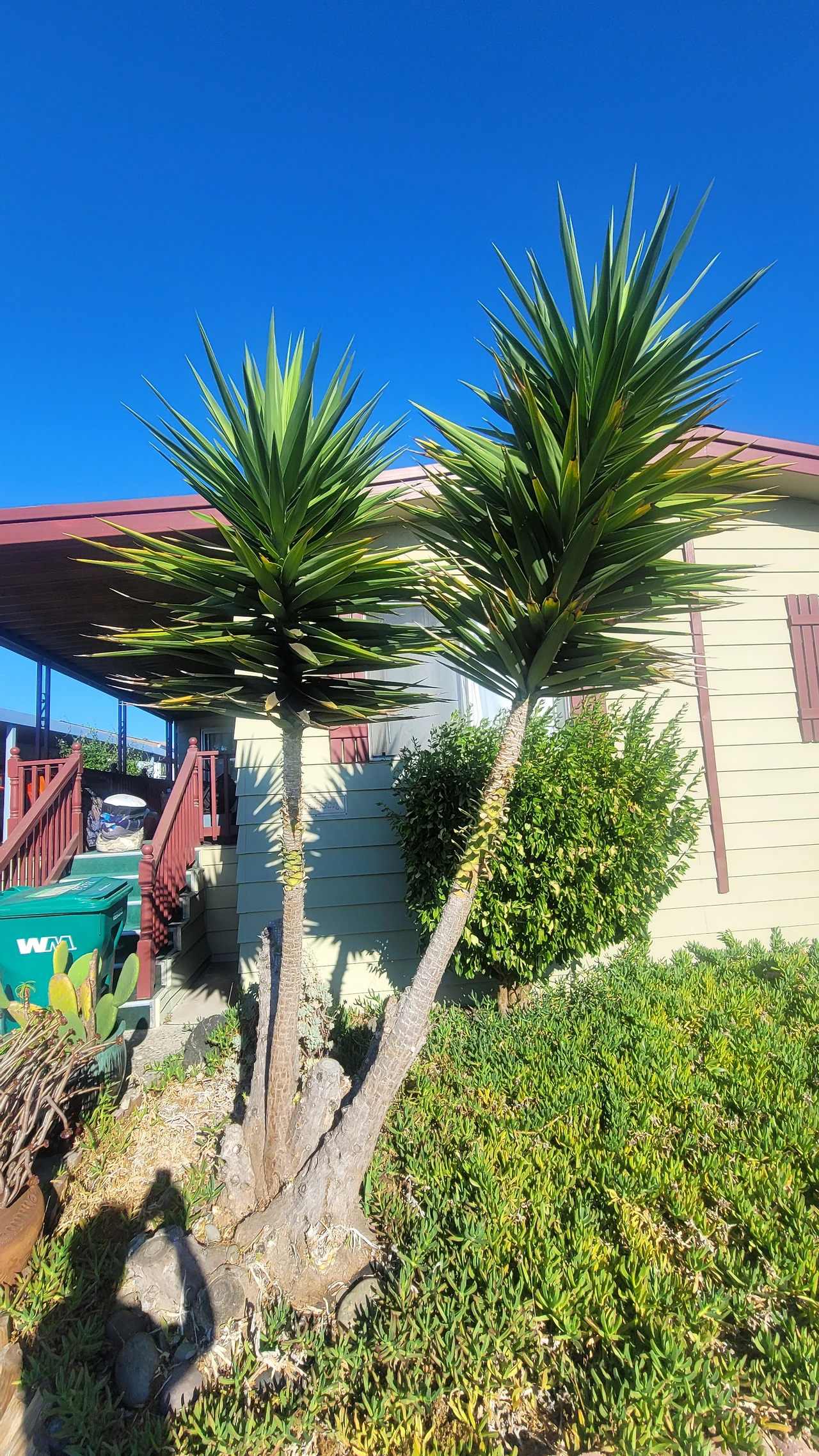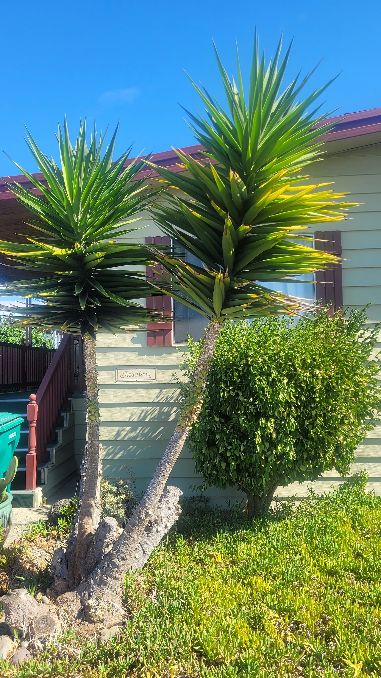 집집마다 마당에 예쁜 정원이 있는 것이 인상적이다. 똑같은 마당은 하나도 없어 개성이 느껴진다. 뜰마다 독특하게 다듬어진 정원수가 있고 꽃과 잔디가 자란다. 핼로윈이 가까운 탓인지 호박도 놓여있고 해골 같은 장식도 보인다. 누나네 집도 남국 분위기가 물씬 풍기는 유카를 닮은 나무가 집 앞에 서있다, 앞마당에는 칼잎 송엽국이 잔디처럼 빽빽하게 뒤덮여 있다. 선인장과 연륜이 느껴지는 굵은 다육이 화분도 자란다. 정원 손질에 애쓴 흔적이 가득하다.