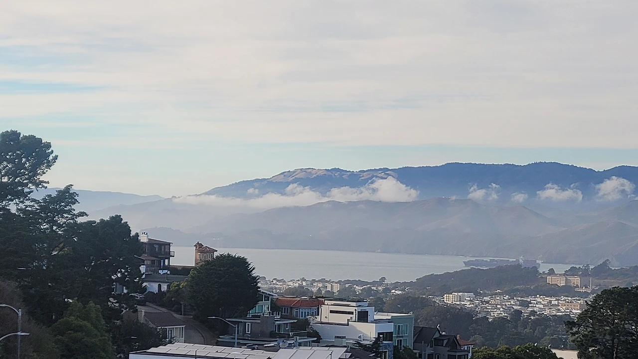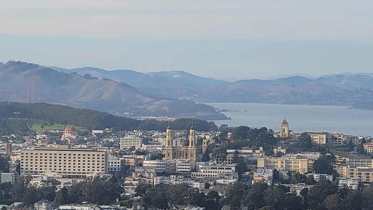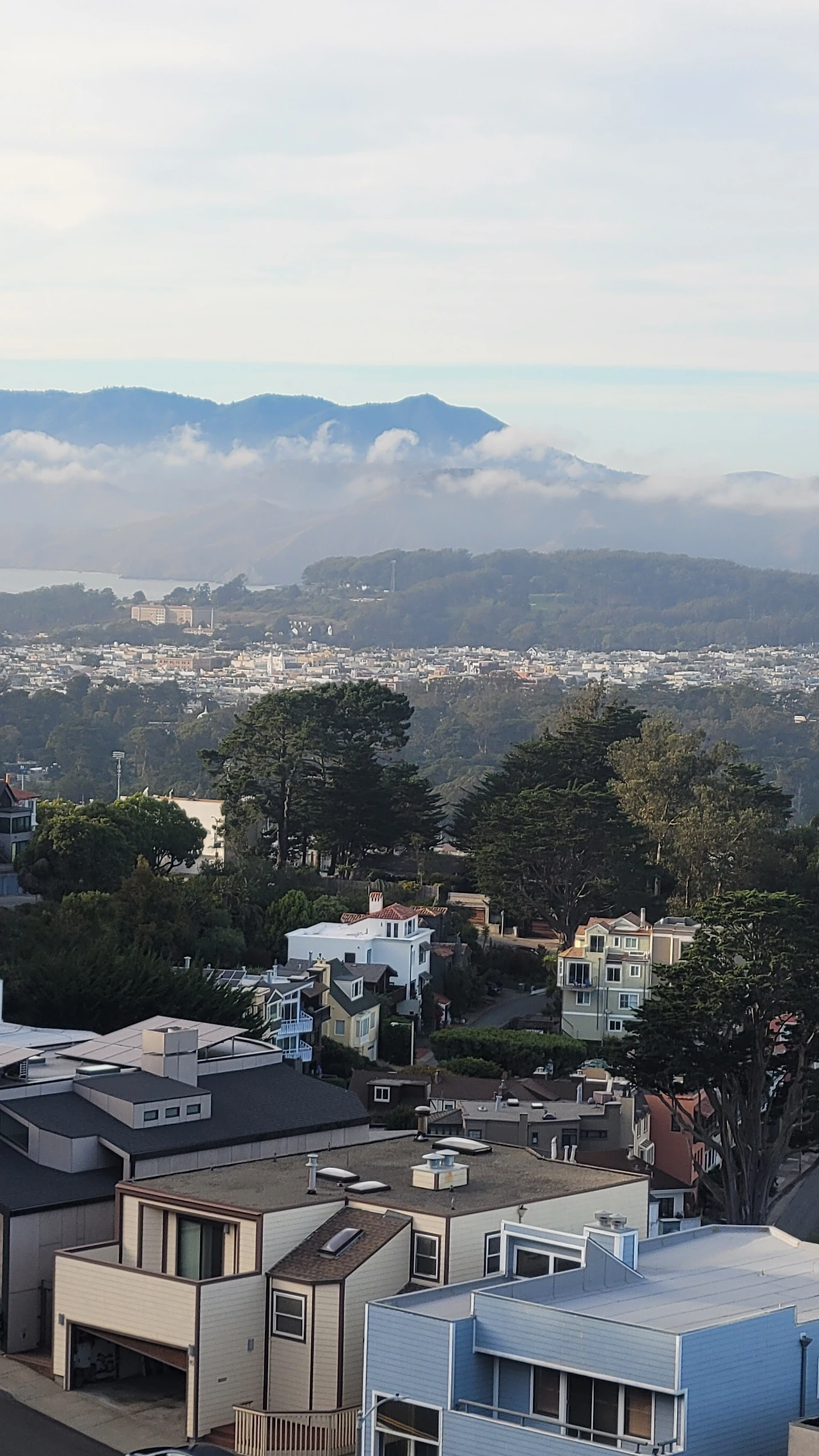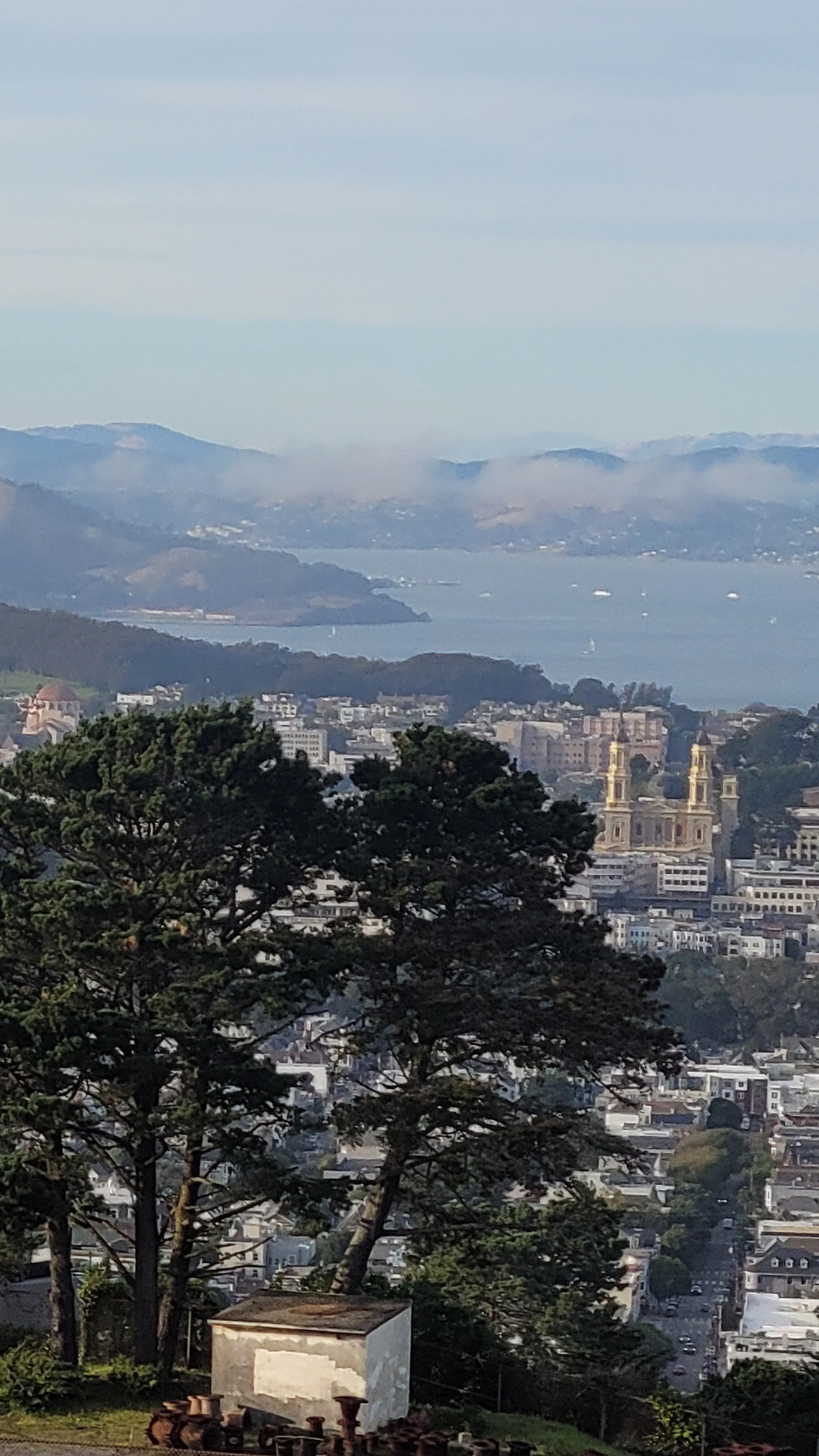 전망대에서 바라본 샌프란시스코는 아주 볼만했다. 사방으로 펼쳐진 도시는 아름다웠다. 멀리 바다를 배경으로 유명한 금문교가 보였다. 마천루 빌딩들도 모여있고 숲사이로 흰 건물들이 조화로운 풍경이 깨끗한 인상을 주었다. 멀리 산자락에 구름이 머문 풍경도 매혹적이다.