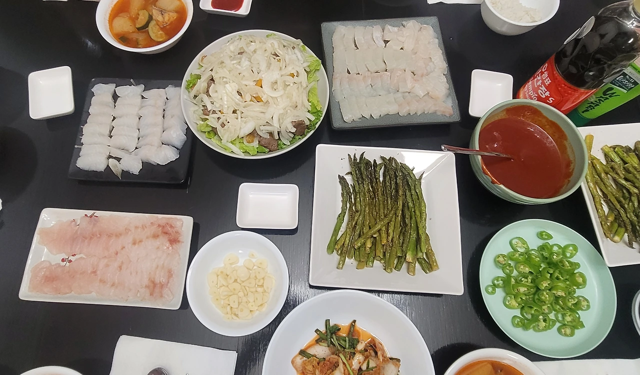 생선회 세 가지에 매운탕에다 베트남식 Shaken Beef까지 다양한 요리였다. 이 모든 것을 조카사위가 직접 요리했다. 회는 식감이 다소 물렀지만 아삭한 로메인 상추와 잘 어울렸고 매운탕은 칼칼하고 시원했다. 가장 압권은 Shaken Beef로 고기를 싫어하는 작은 누이조차 입맛에 맞을 만큼 훌륭했다. 큐브 모양의 소고기는 아주 부드러웠고 채 썬 양파는 달콤했다. 잘 구운 아스파라거스를 곁들이니 금상첨화였다.