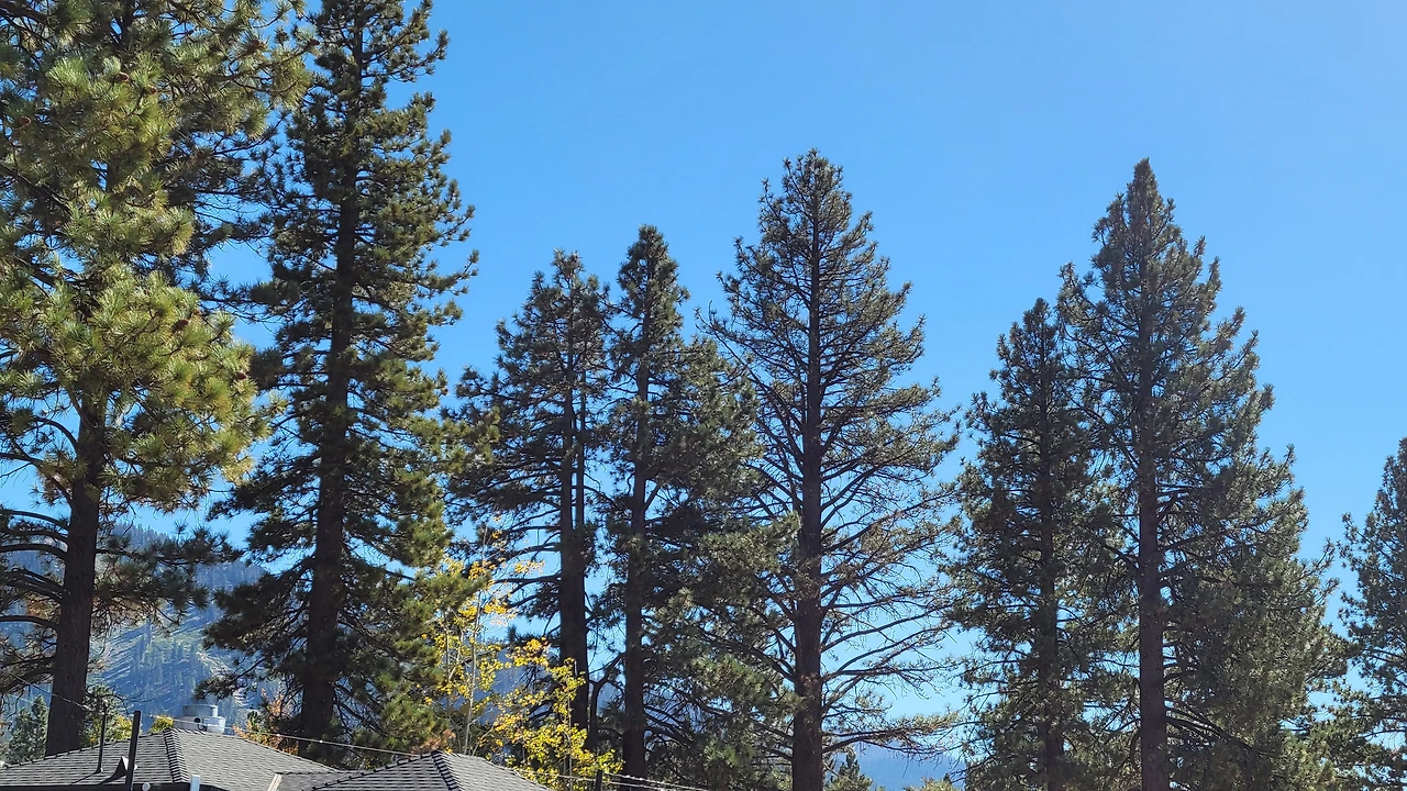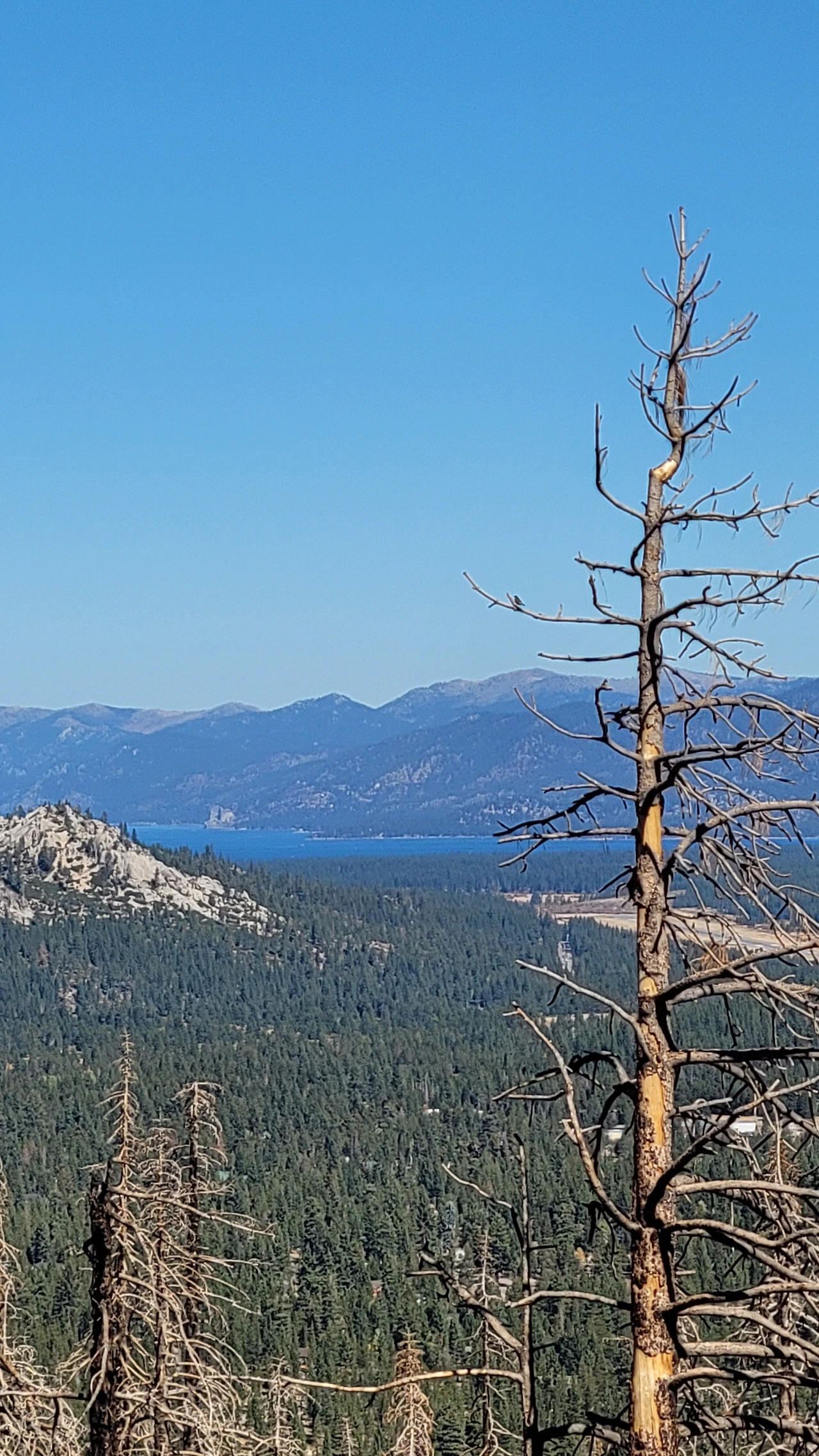 호수에 다다라 중간에 잠깐 차를 멈췄다. 소나무 바다 너머로 멀리 타호 호수가 보석처럼 박혀 있다. 유난히 짙푸른 청람빛이 매혹적이다.