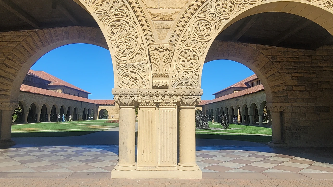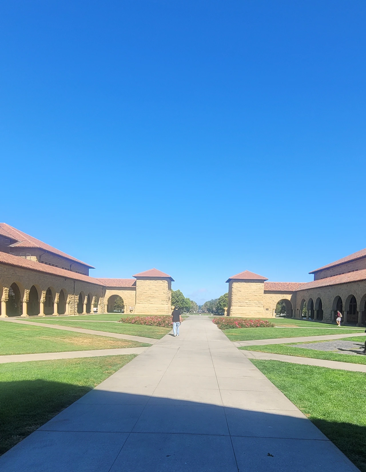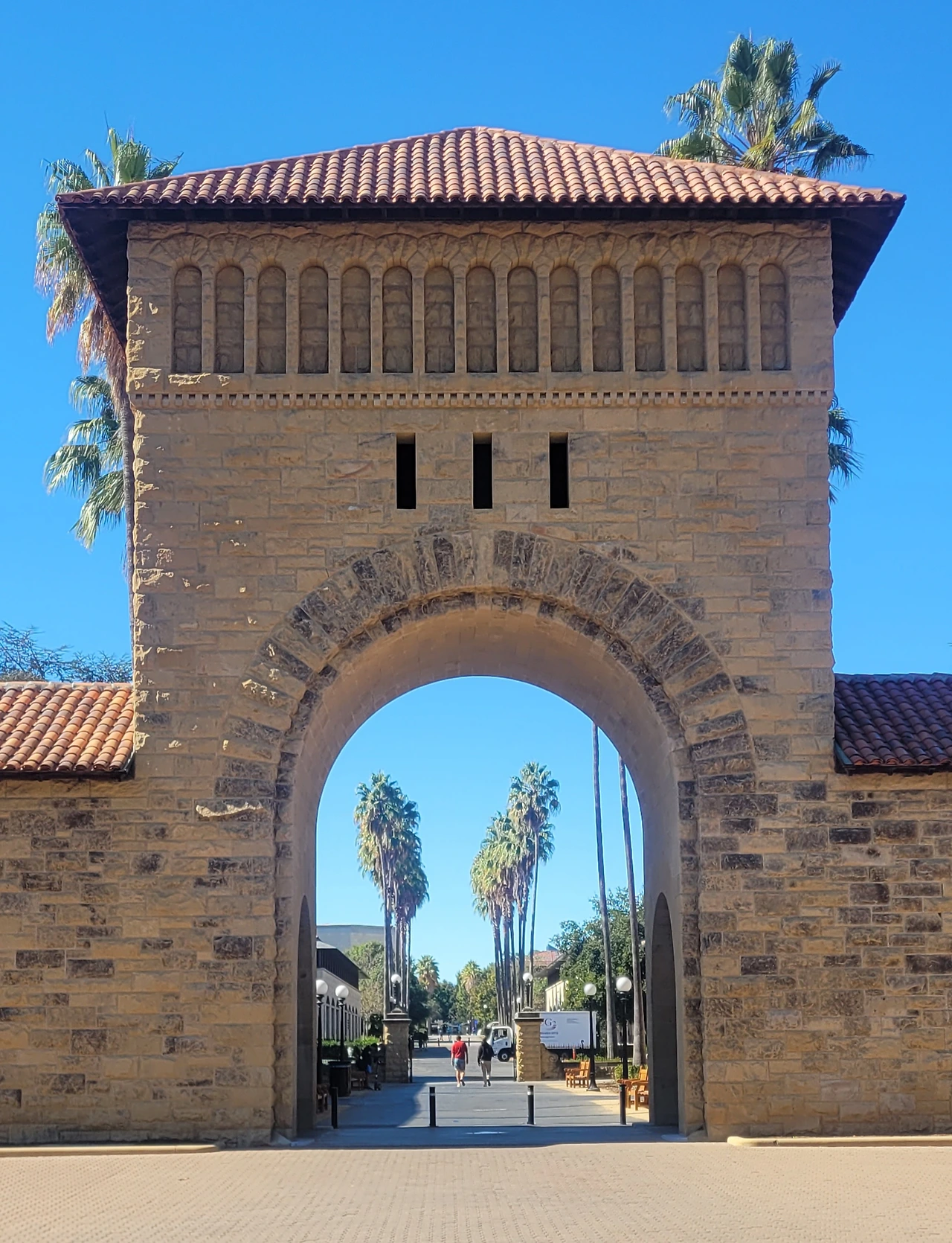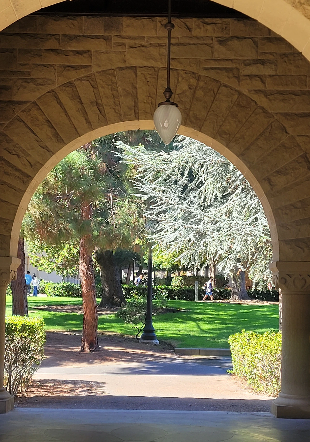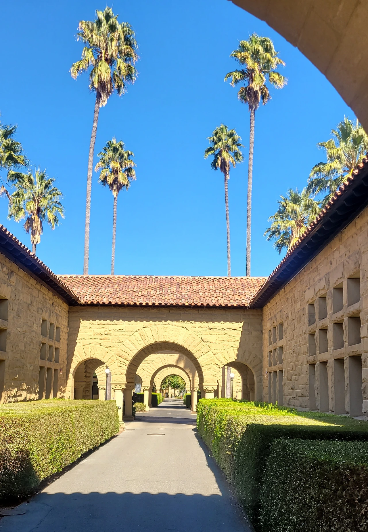 야자수 너머에는 고목들이 숲을 이루고 있다. 입구부터 보이는 외양이 주위를 압도한다. 도로 중앙에는 정돈된 잔디밭 광장이 눈이 시원하게 펼쳐졌다. 상당한 길이의 잔디밭이 끝나는 곳에 중세풍의 붉은 벽돌로 지어진 일련의 건물들이 사람들을 맞이한다. 이곳이 바로 유서 깊은 스탠퍼드 대학임을 알린다. 모든 건축물은 로마네스크 양식과 스페인식이 혼합된 단일 양식이다. 궁전 같기도 한 건물들은 수많은 아치가 특징이다. 길게 늘어진 회랑도 눈길을 끈다.