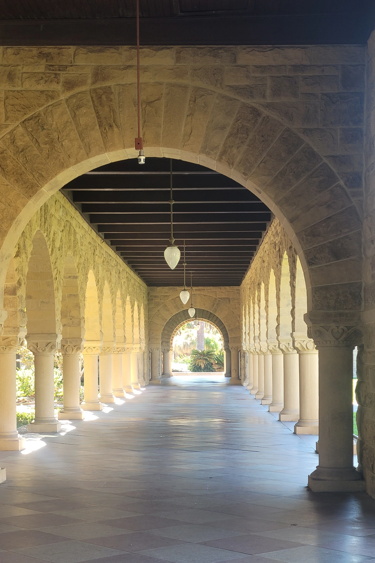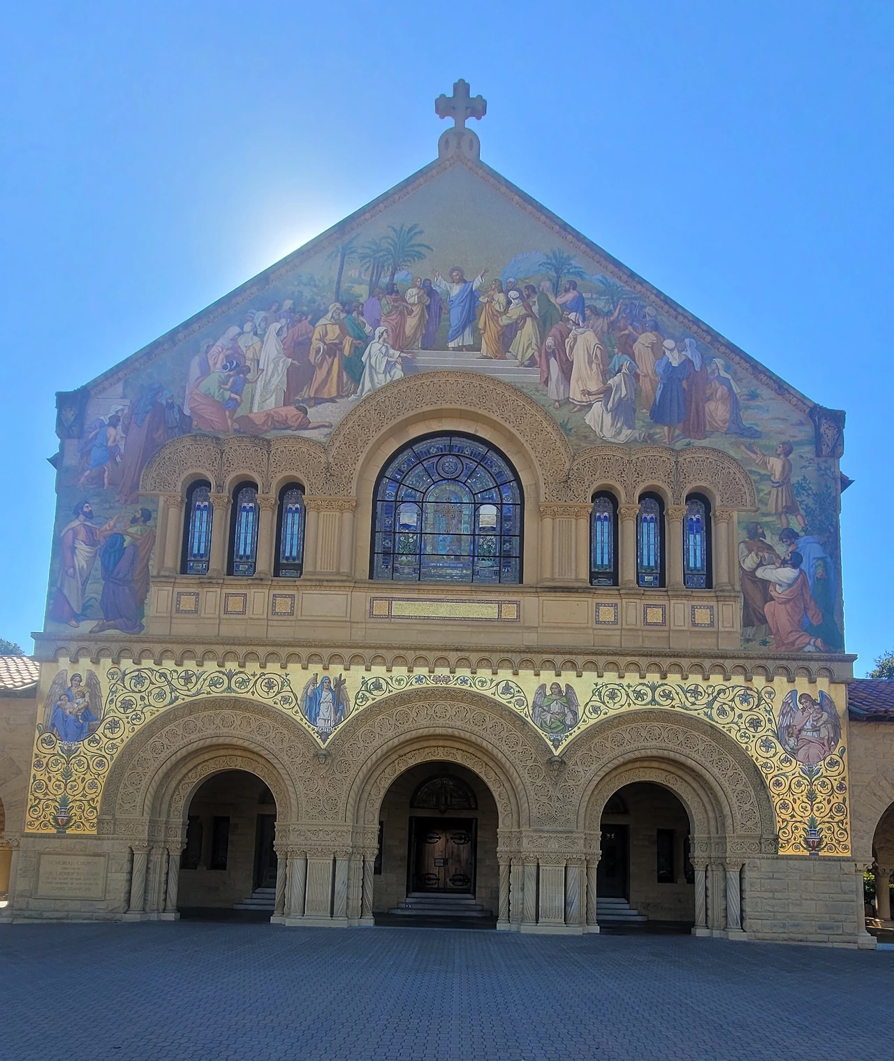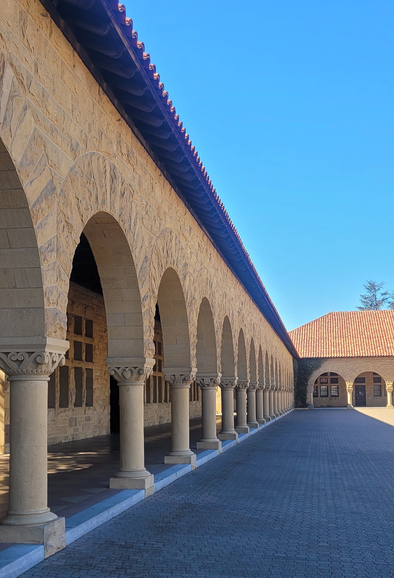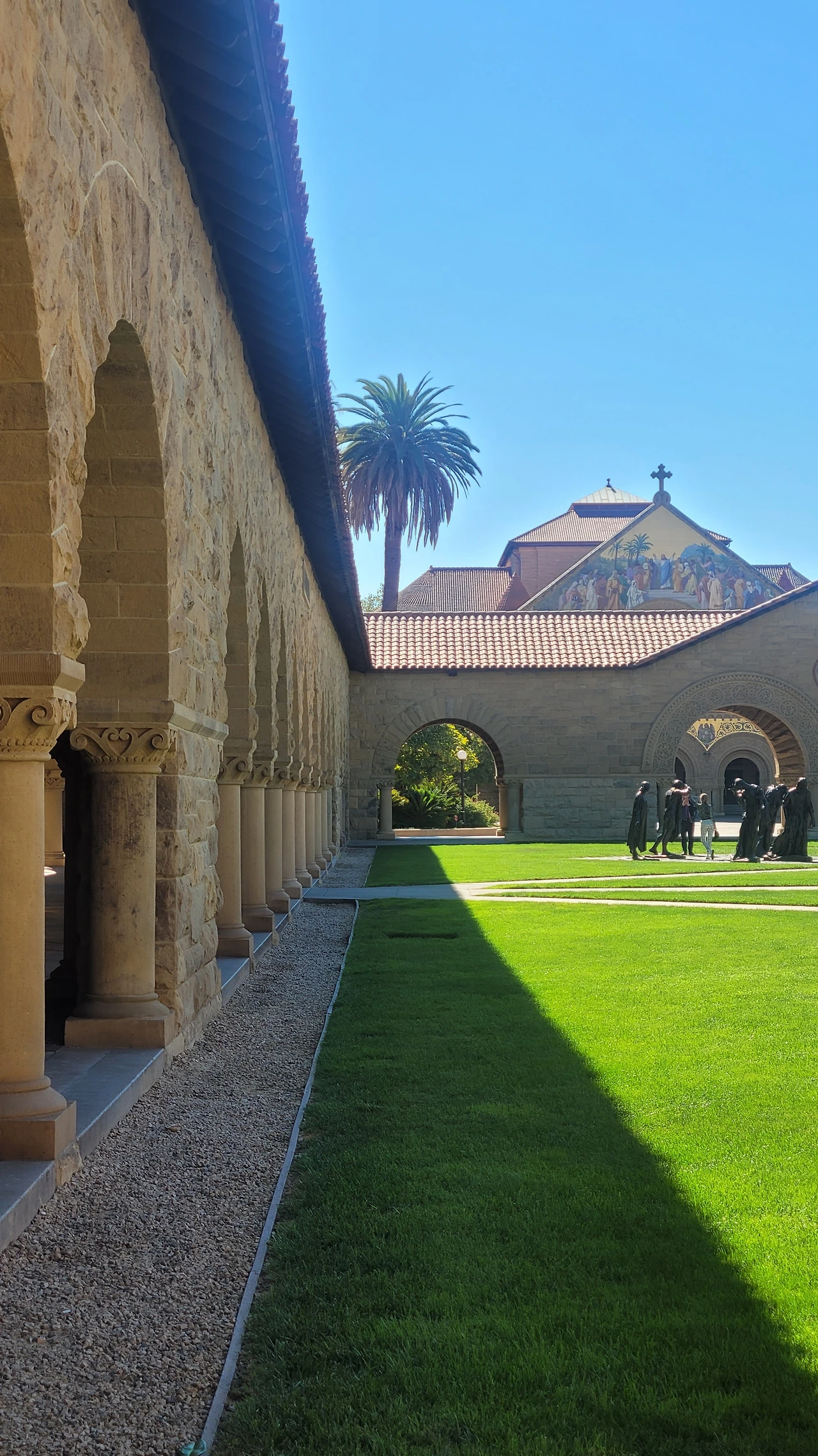 야자수 너머에는 고목들이 숲을 이루고 있다. 입구부터 보이는 외양이 주위를 압도한다. 도로 중앙에는 정돈된 잔디밭 광장이 눈이 시원하게 펼쳐졌다. 상당한 길이의 잔디밭이 끝나는 곳에 중세풍의 붉은 벽돌로 지어진 일련의 건물들이 사람들을 맞이한다. 이곳이 바로 유서 깊은 스탠퍼드 대학임을 알린다. 모든 건축물은 로마네스크 양식과 스페인식이 혼합된 단일 양식이다. 궁전 같기도 한 건물들은 수많은 아치가 특징이다. 길게 늘어진 회랑도 눈길을 끈다.