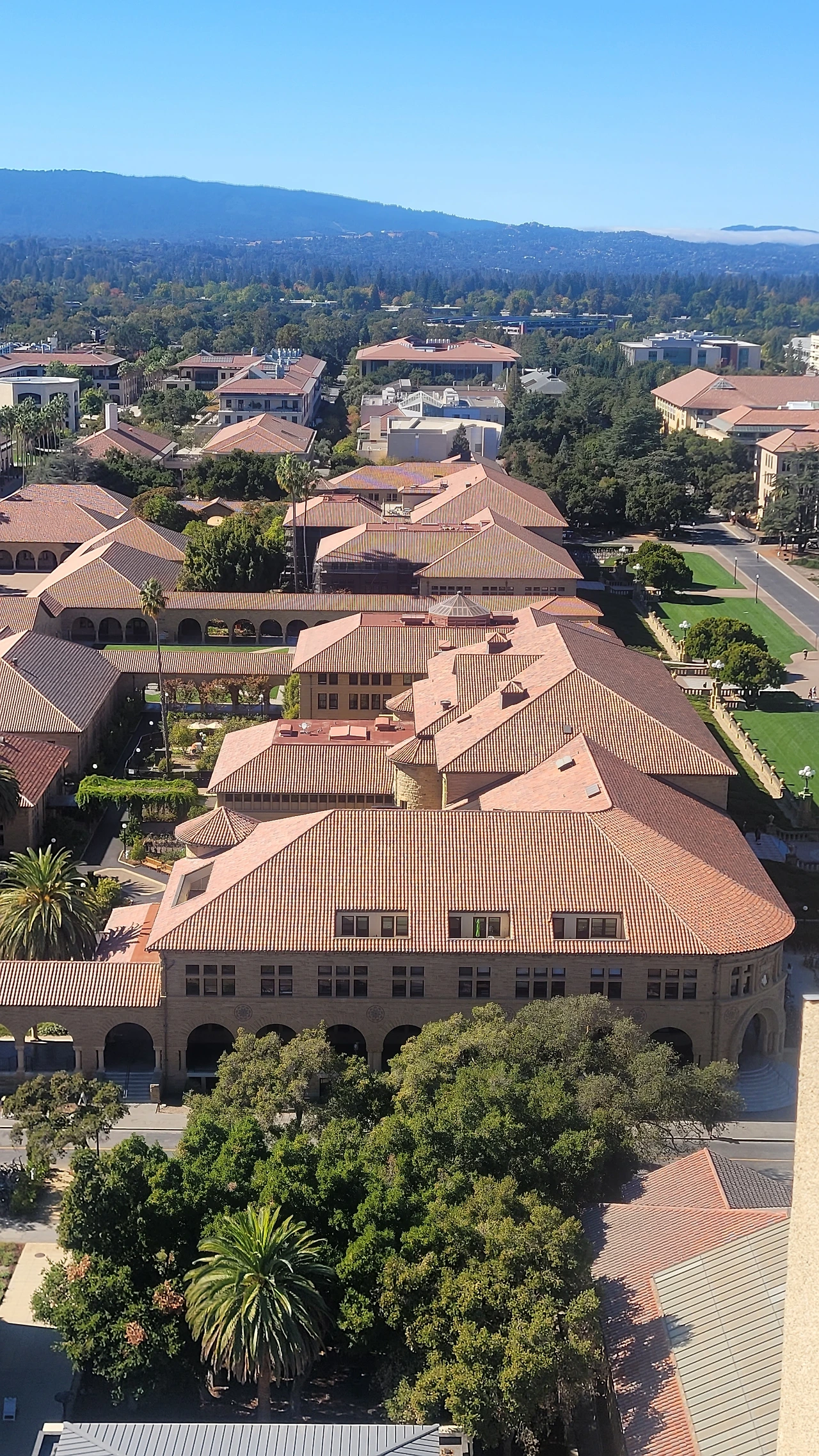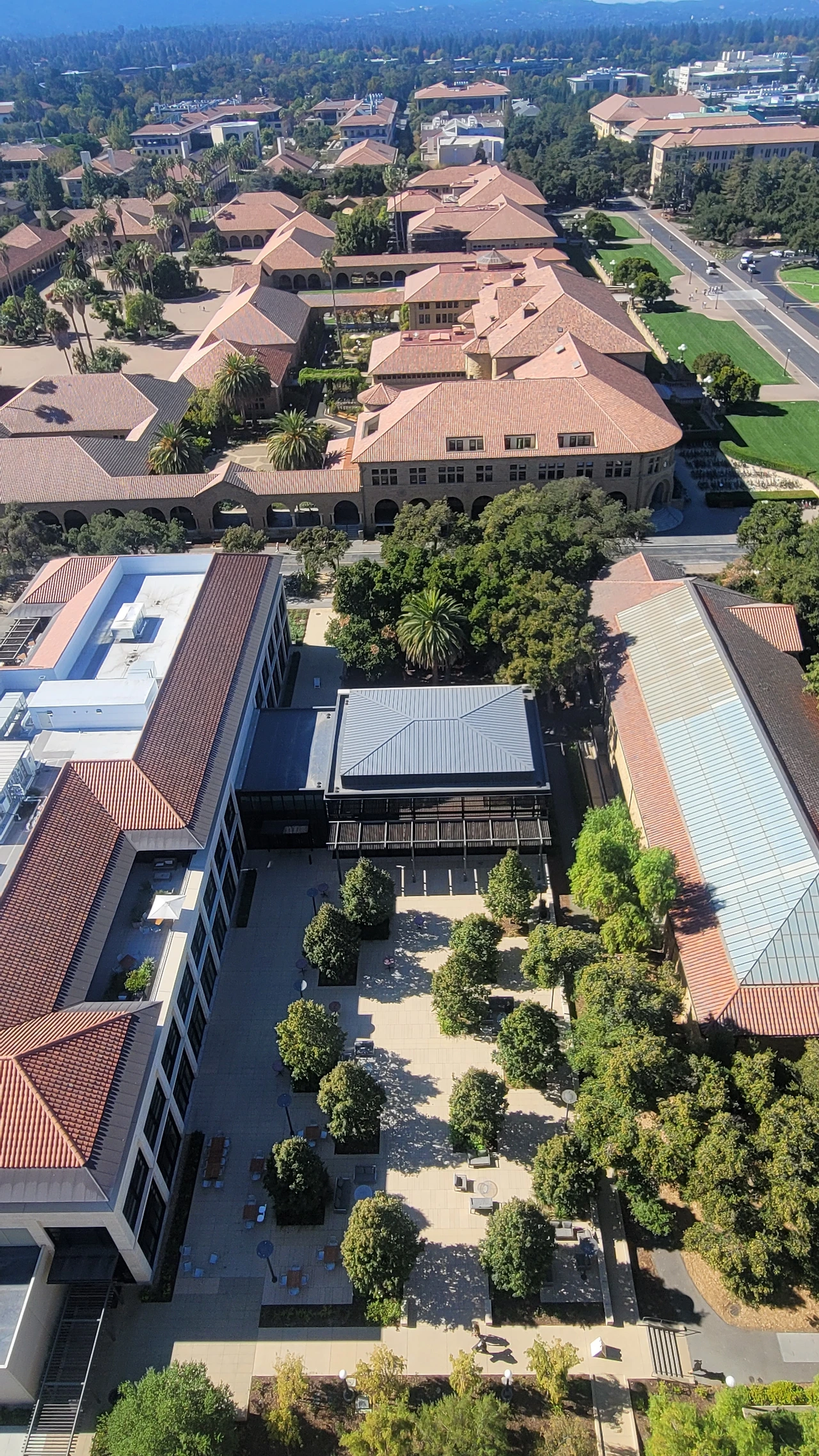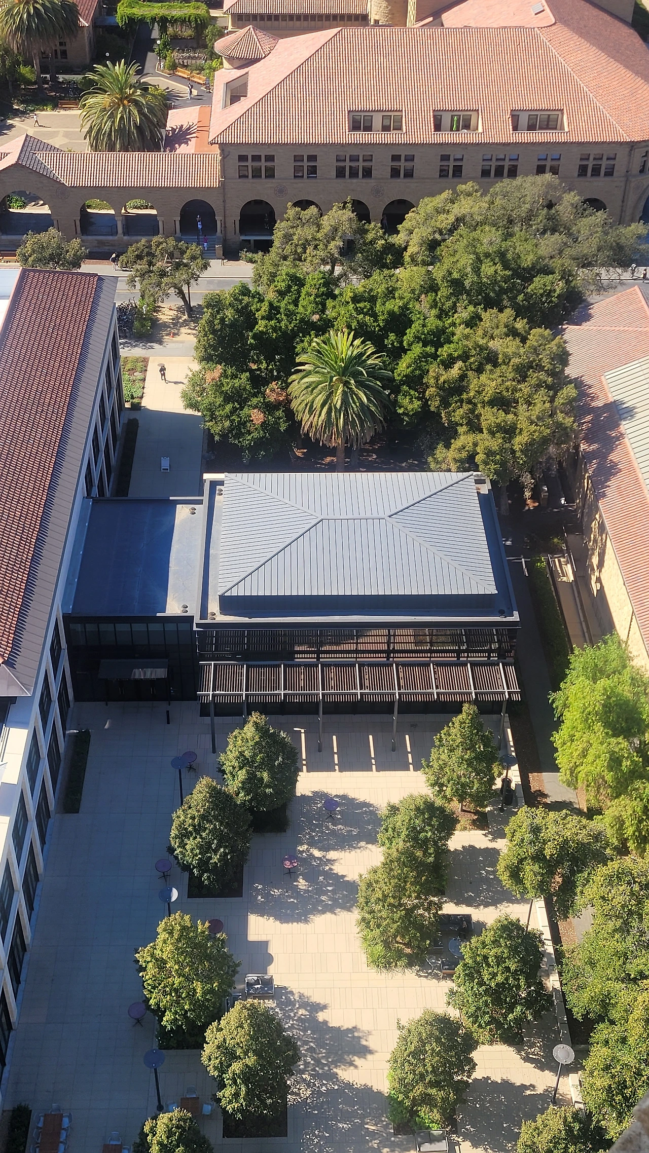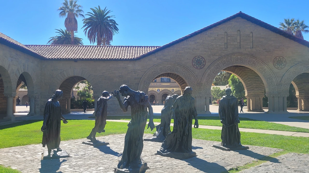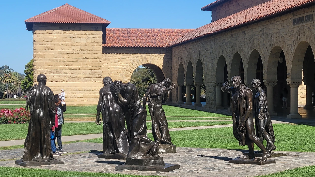 야자수 너머에는 고목들이 숲을 이루고 있다. 입구부터 보이는 외양이 주위를 압도한다. 도로 중앙에는 정돈된 잔디밭 광장이 눈이 시원하게 펼쳐졌다. 상당한 길이의 잔디밭이 끝나는 곳에 중세풍의 붉은 벽돌로 지어진 일련의 건물들이 사람들을 맞이한다. 이곳이 바로 유서 깊은 스탠퍼드 대학임을 알린다. 모든 건축물은 로마네스크 양식과 스페인식이 혼합된 단일 양식이다. 궁전 같기도 한 건물들은 수많은 아치가 특징이다. 길게 늘어진 회랑도 눈길을 끈다.