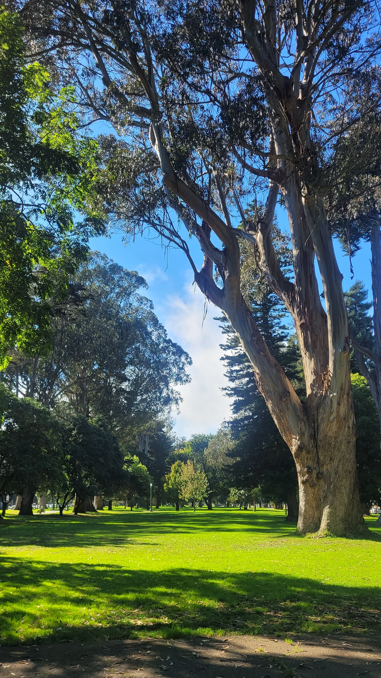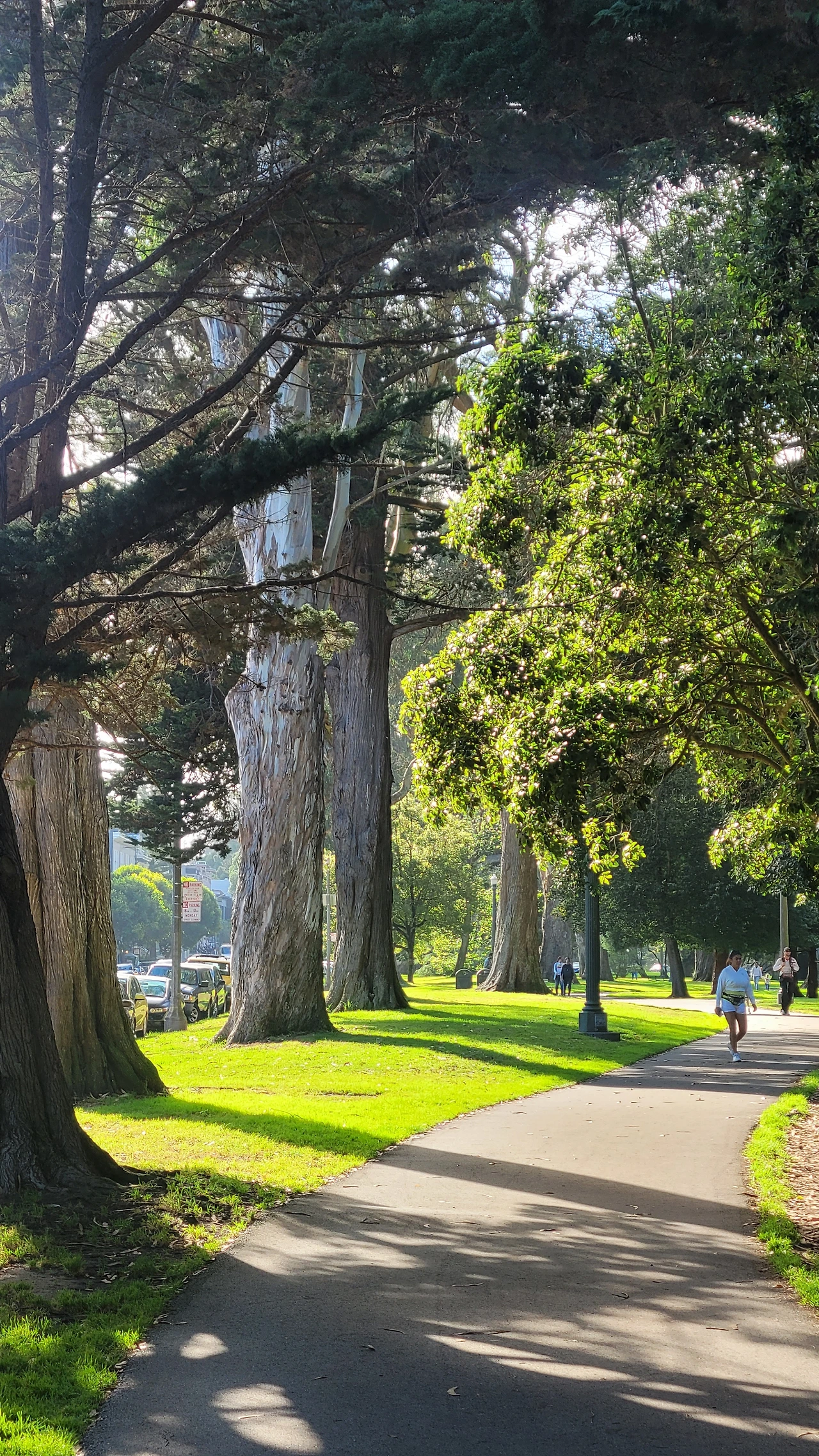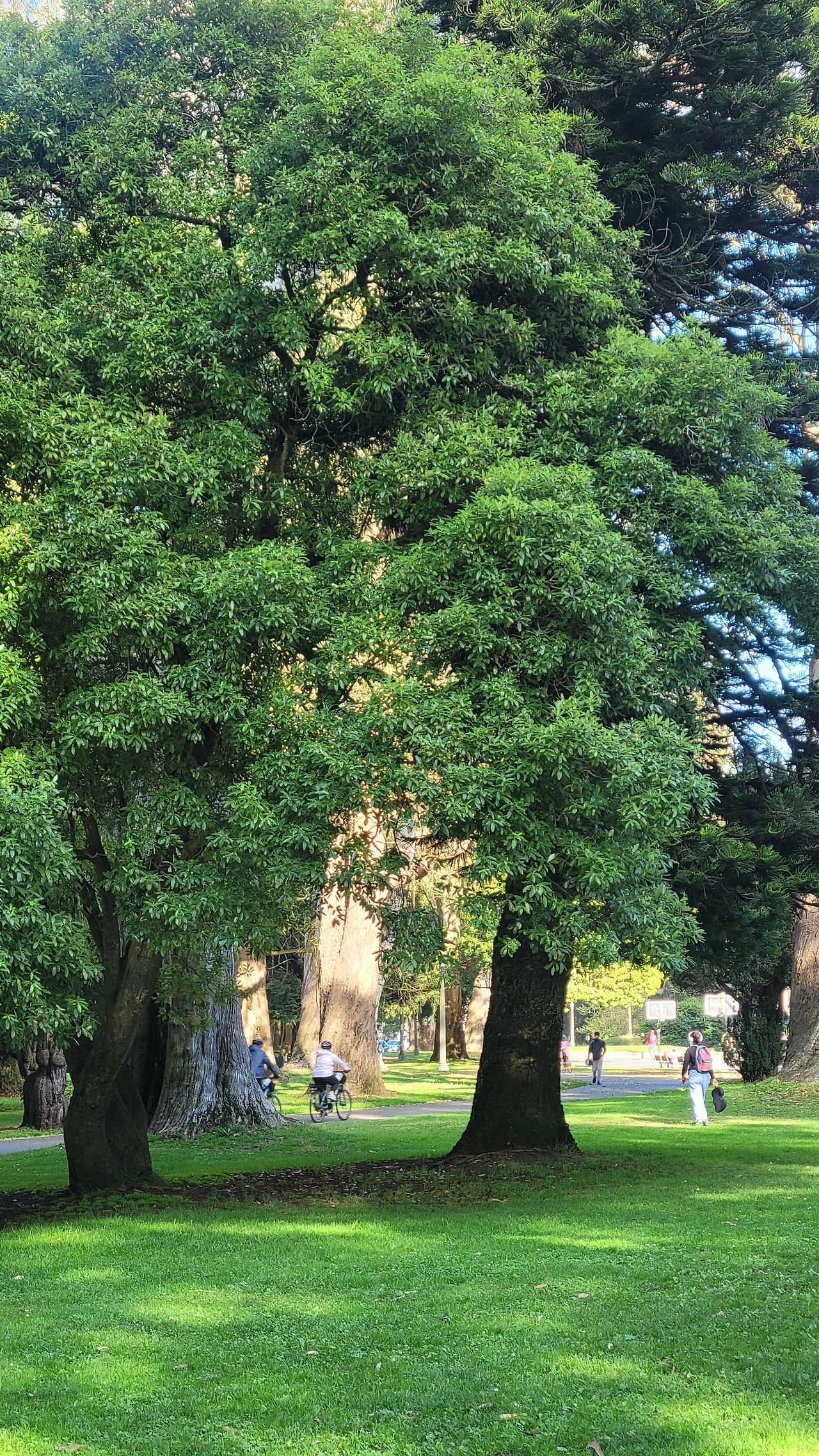 공원은 도로를 따라 아주 길게 조성되었다. 공원에 들어서면 큰 거인들 같은 나무들이 시야에 들어온다. 굵기도 하지만 나무 높이가 놀랄 정도로 키가 크다. 숲에 들어서는 사람들은 동화 속 난쟁이가 되는 기분이다. 대부분 우리에게 낯선 나무들이다. 특히 호주가 원산지인 유칼립투스가 많은데 수피가 거스러미 처럼 일어나 지저분한 인상이다. 대형 소나무와 편백 종류의 나무도 있는데 수형이 아주 아름답다. 나무 밑에는 녹색 잔디가 깔렸고 잔디밭에는 흰색 데이지가 듬성듬성 피어 요정처럼 깜찍하다.