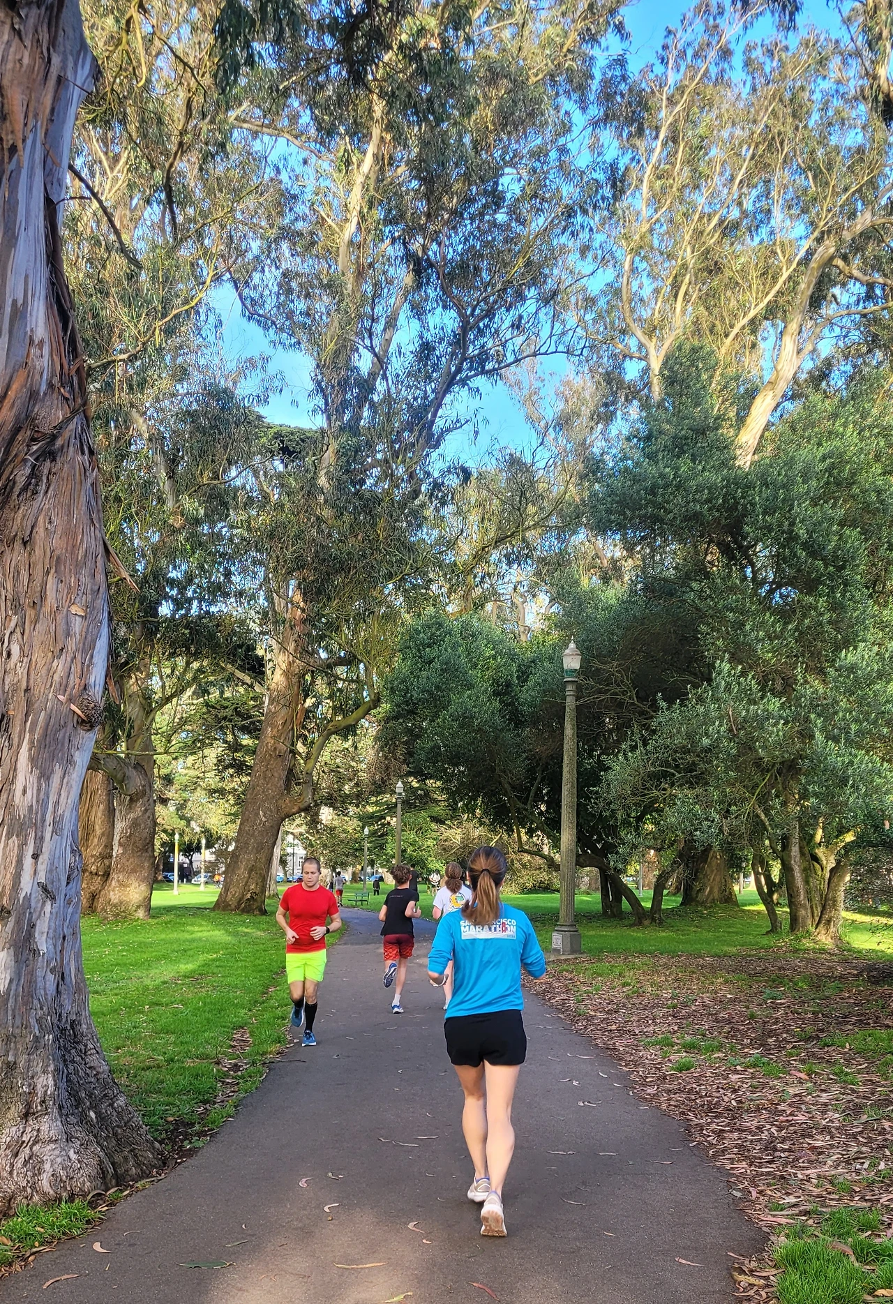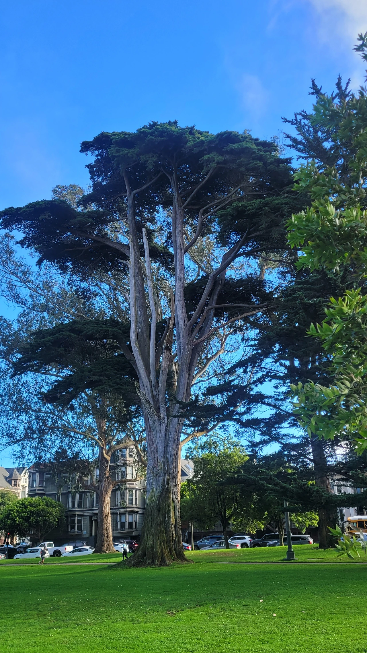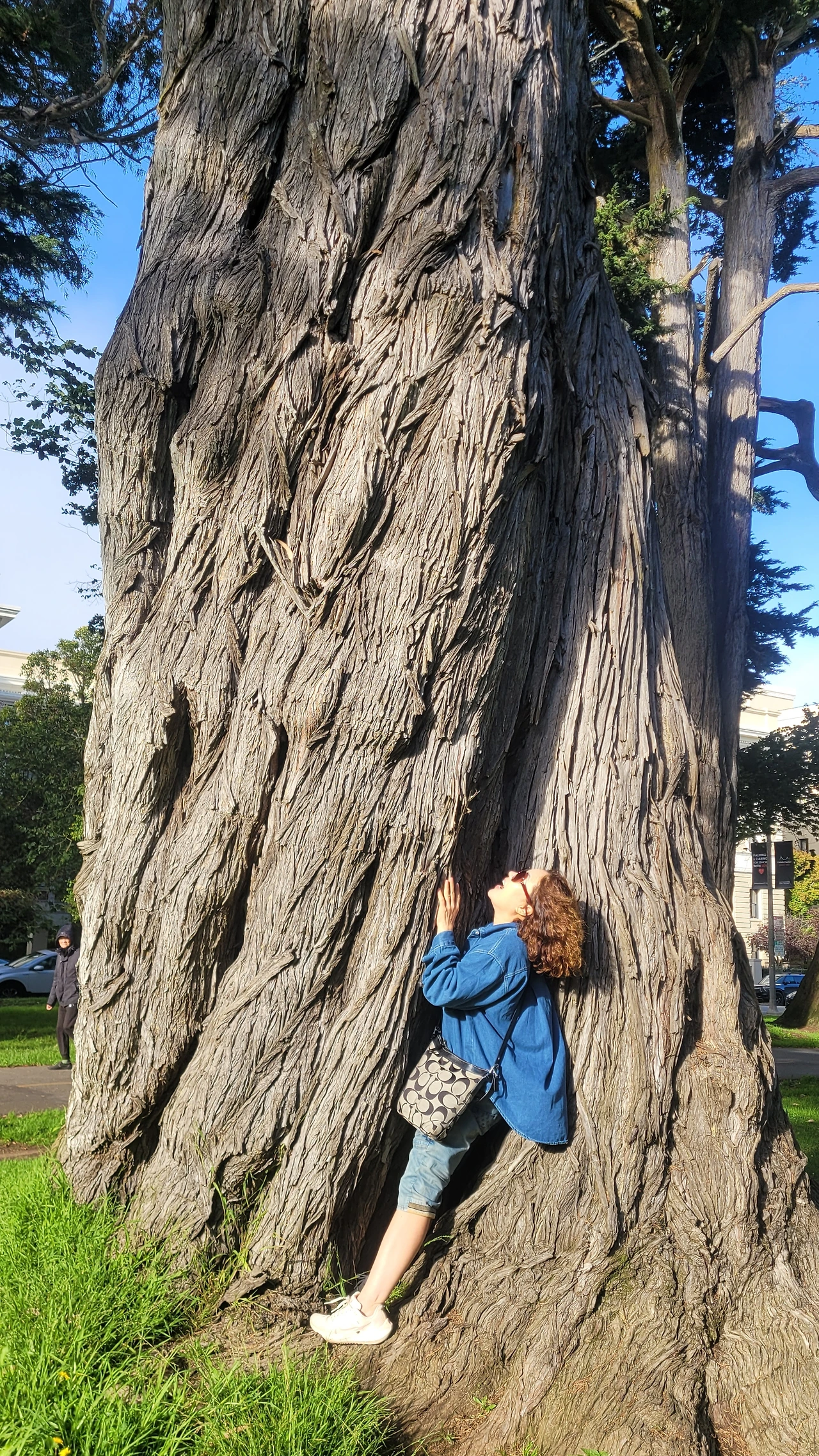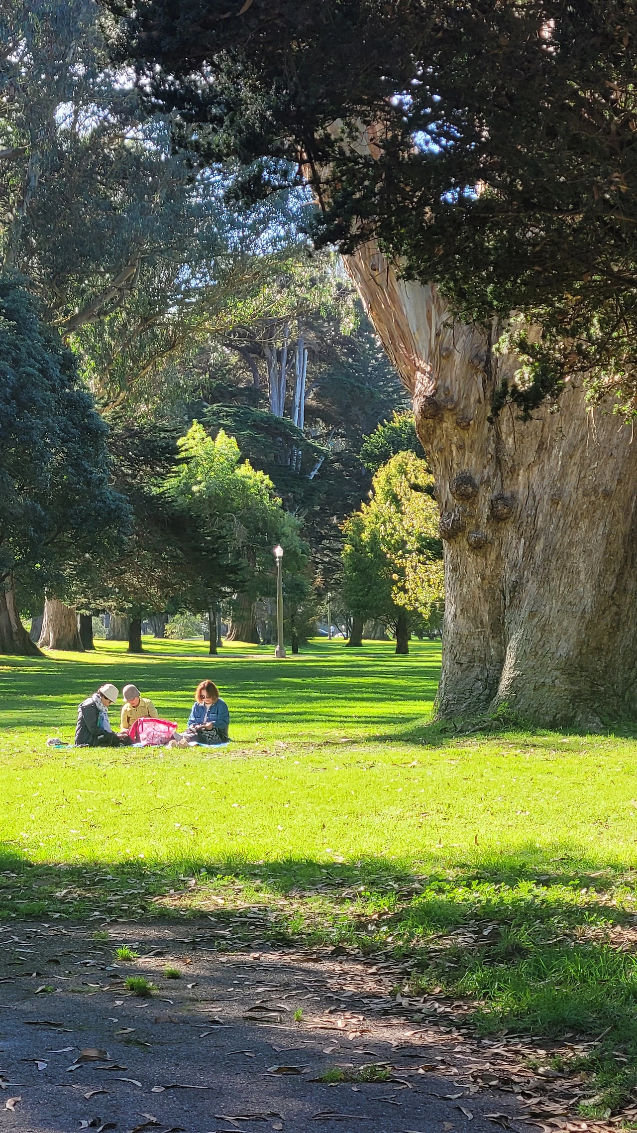 공원은 도로를 따라 아주 길게 조성되었다. 공원에 들어서면 큰 거인들 같은 나무들이 시야에 들어온다. 굵기도 하지만 나무 높이가 놀랄 정도로 키가 크다. 숲에 들어서는 사람들은 동화 속 난쟁이가 되는 기분이다. 대부분 우리에게 낯선 나무들이다. 특히 호주가 원산지인 유칼립투스가 많은데 수피가 거스러미 처럼 일어나 지저분한 인상이다. 대형 소나무와 편백 종류의 나무도 있는데 수형이 아주 아름답다. 나무 밑에는 녹색 잔디가 깔렸고 잔디밭에는 흰색 데이지가 듬성듬성 피어 요정처럼 깜찍하다.