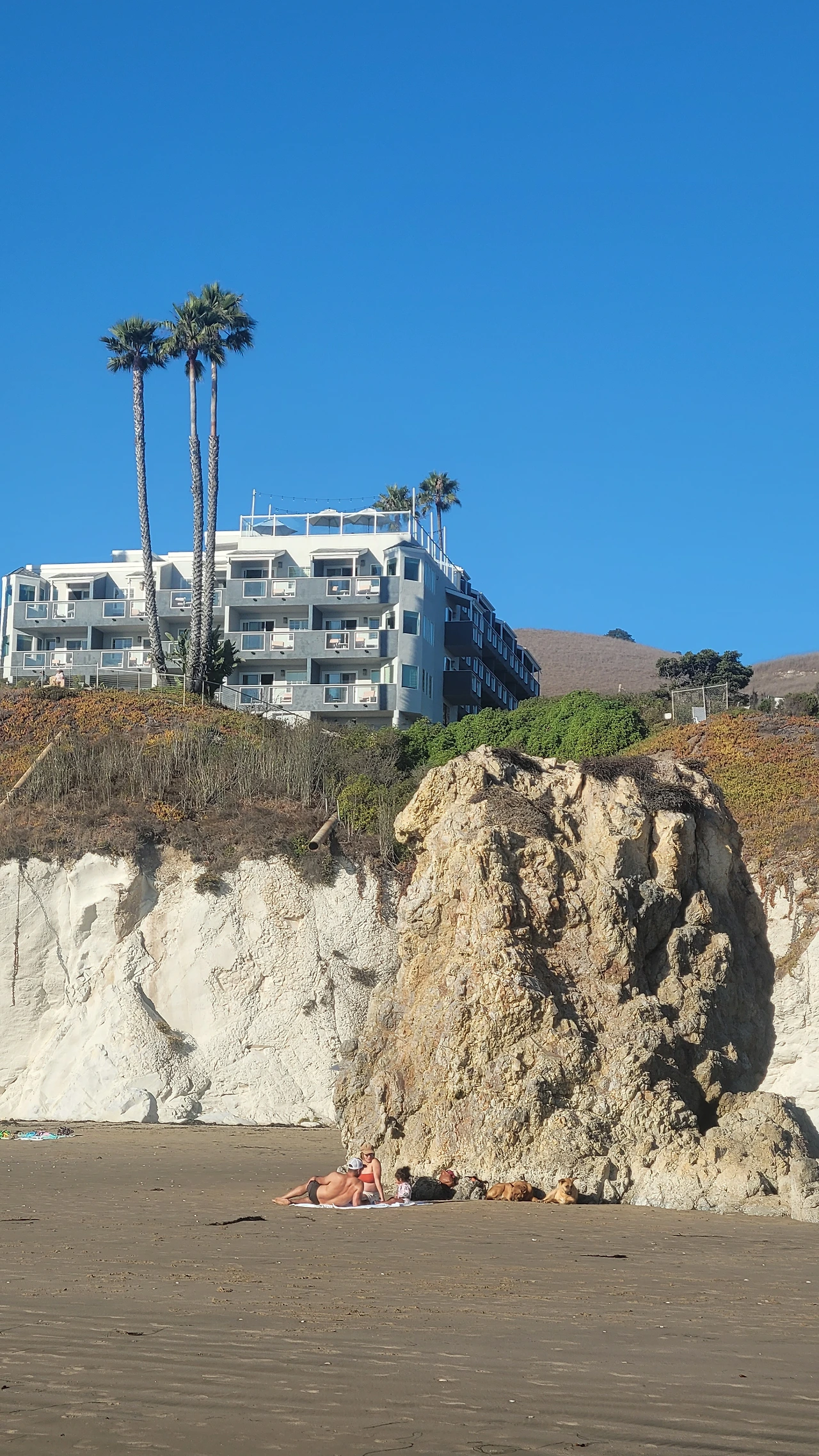 전면은 망망대해다. 시선을 오른쪽으로 돌리면 큰 바위가 있고 그 뒤로 해안선을 따라 이어진 하얀 절벽이 보인다. 그 위에 야자수가 수직 한 아래 호텔이 자리했다. 보기 드문 풍경에 눈길을 빼앗긴다.