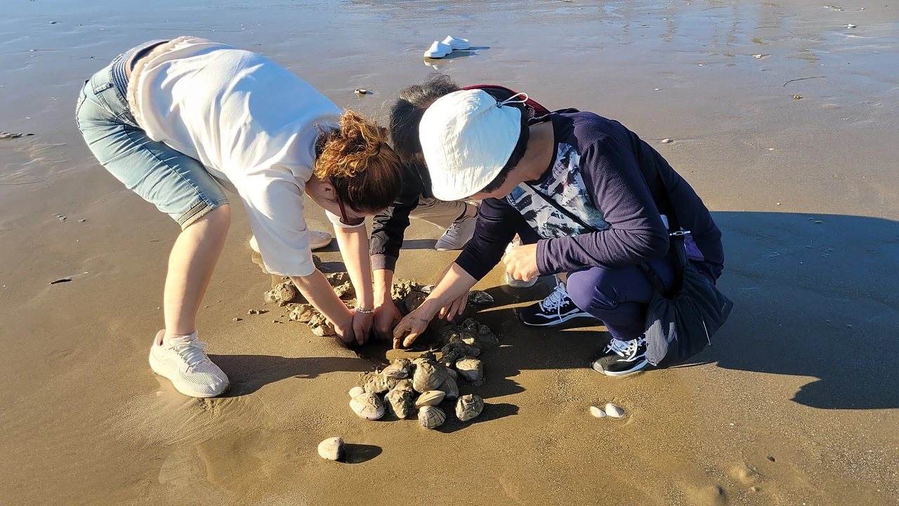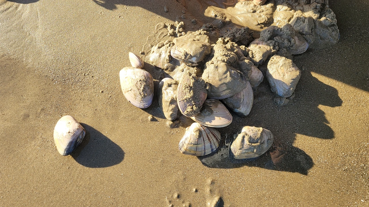 그런데 자세히 보니 주먹만 한 조개가 눈에 띄었다. 껍데기인가 했더니 웬걸 멀쩡하게 살아있는 조개다. 집어 들고는 너무 놀라 누이들을 소리쳐 불렀다. "누나 여기 조개가 있어요!" 뒤따라 온 아내와 누이들이 헐레벌떡 뛰어 왔다. 그리고는 조개를 줍기 시작했다. 아내는 숨을 쉬는 조개를 발견하고는 모래를 팠다. 모래 밑에는 조개가 널렸다. 파고 파도 끝없이 조개가 나온다. 조개 담을 봉지를 가지러 재빨리 차로 뛰어갔다. 숨도 안 쉬고 갔다 왔더니 누이들이 엄청난 조개를 캐서는 밀려오는 파도를 피해 마구 던지고 있었다. 얼른 봐도 어마어마한 양이었다.
