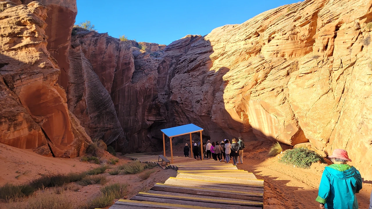 버스를 타고 얼마 지나지 않아 목적지다. 뭐가 있을 것 같지 않은 평범한 장소다. 이곳은 나바호 인디언 구역으로 그들의 관할이다. 인디언 가이드가 안내를 했고 협곡 입구까지는 열댓 명씩 나누어 승합차로 이동했다.