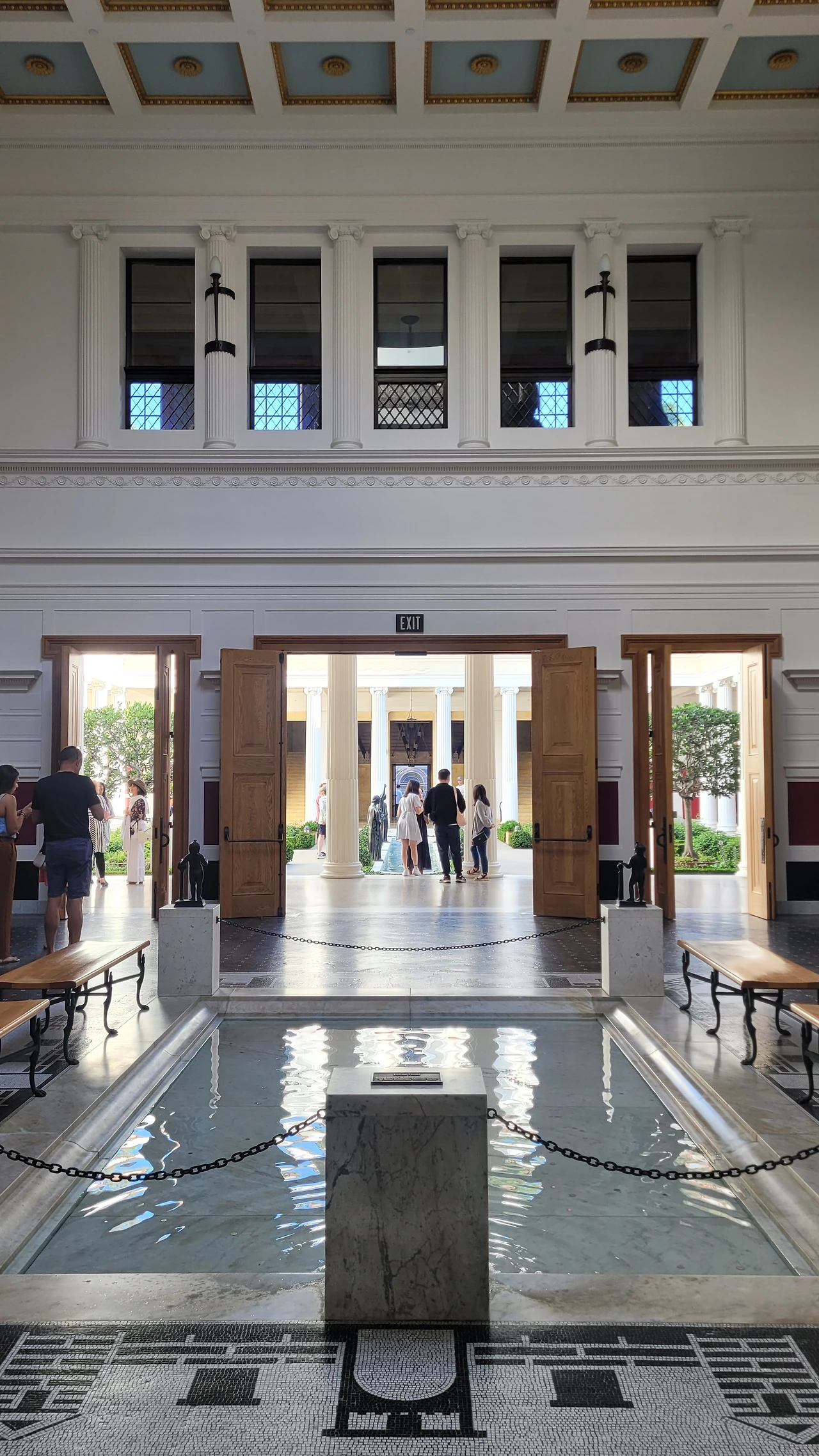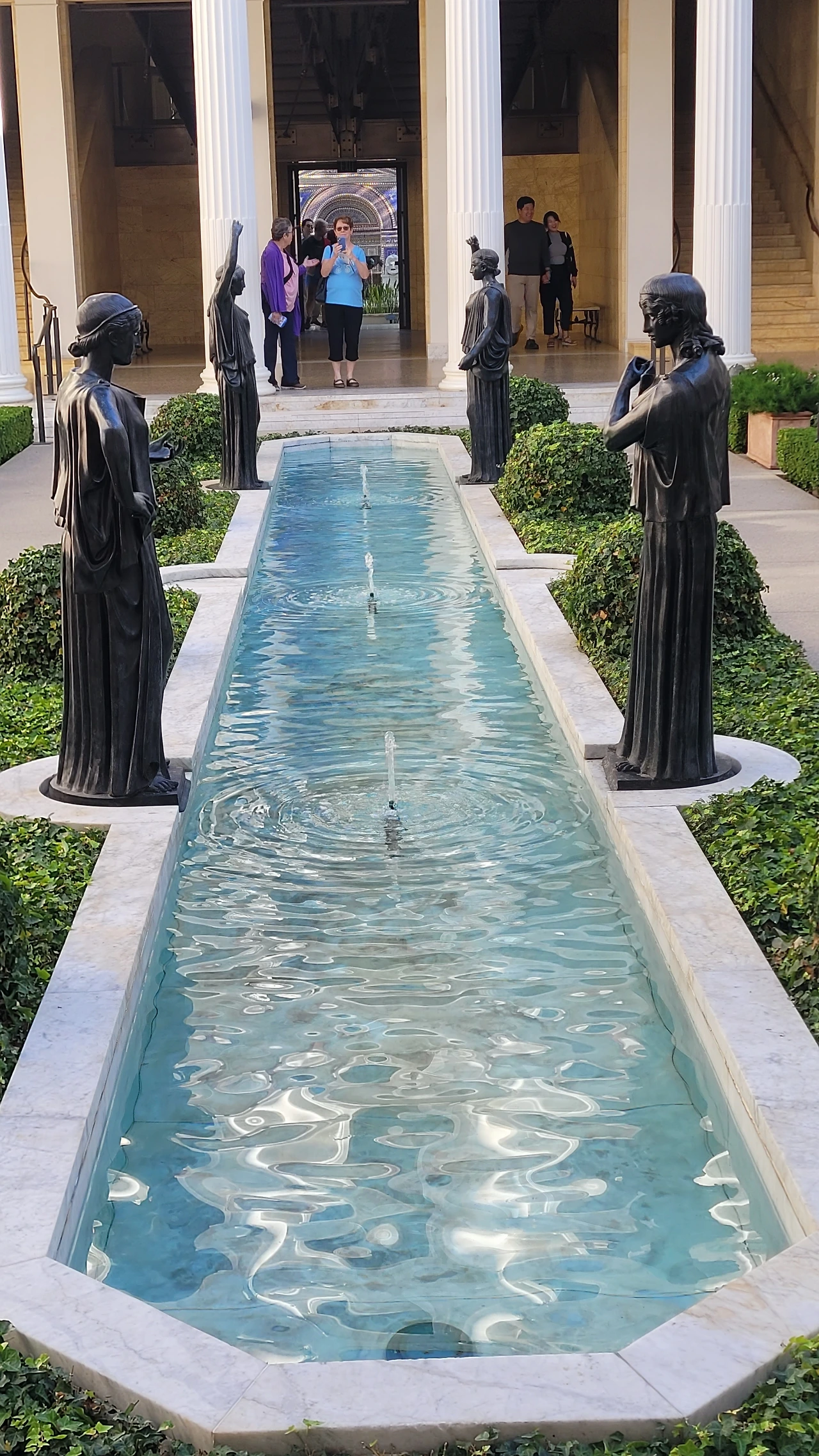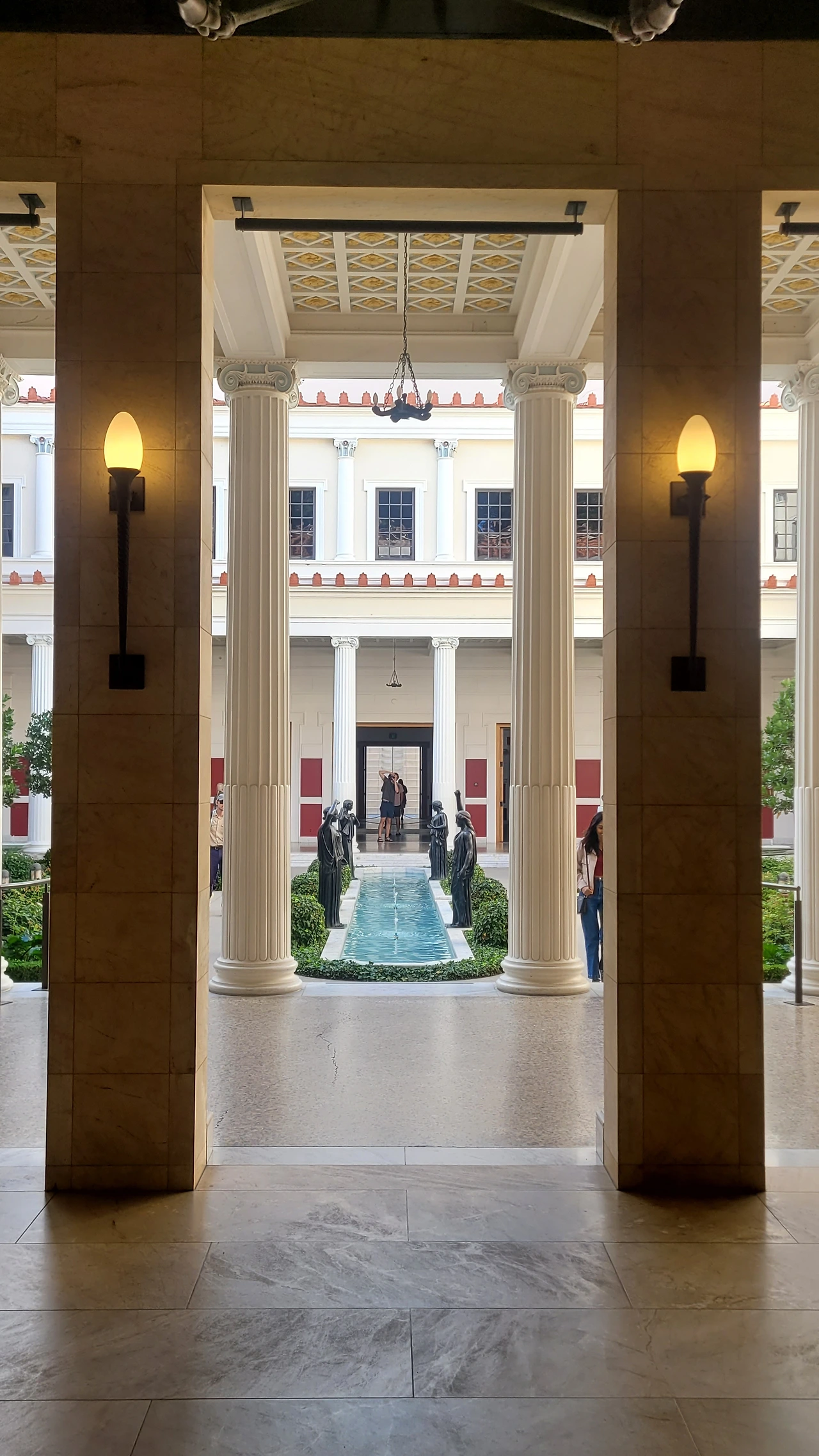 고대 그리스 시대로 들어서는듯한 클래식한 분위기가 곳곳에서 묻어난다. 아름다운 열 주식 기둥이 늘어서 있고 건물 내부에는 너른 중정이 자리 잡고 있다. 중정은 반듯하고 가지런하다. 구획을 지어 관목을 심고 중앙에 분수를 설치하고 조각들을 배치하여 고전적인 정원을 조성했다.