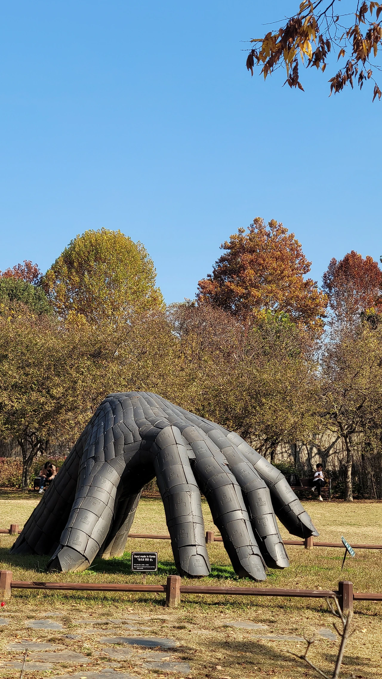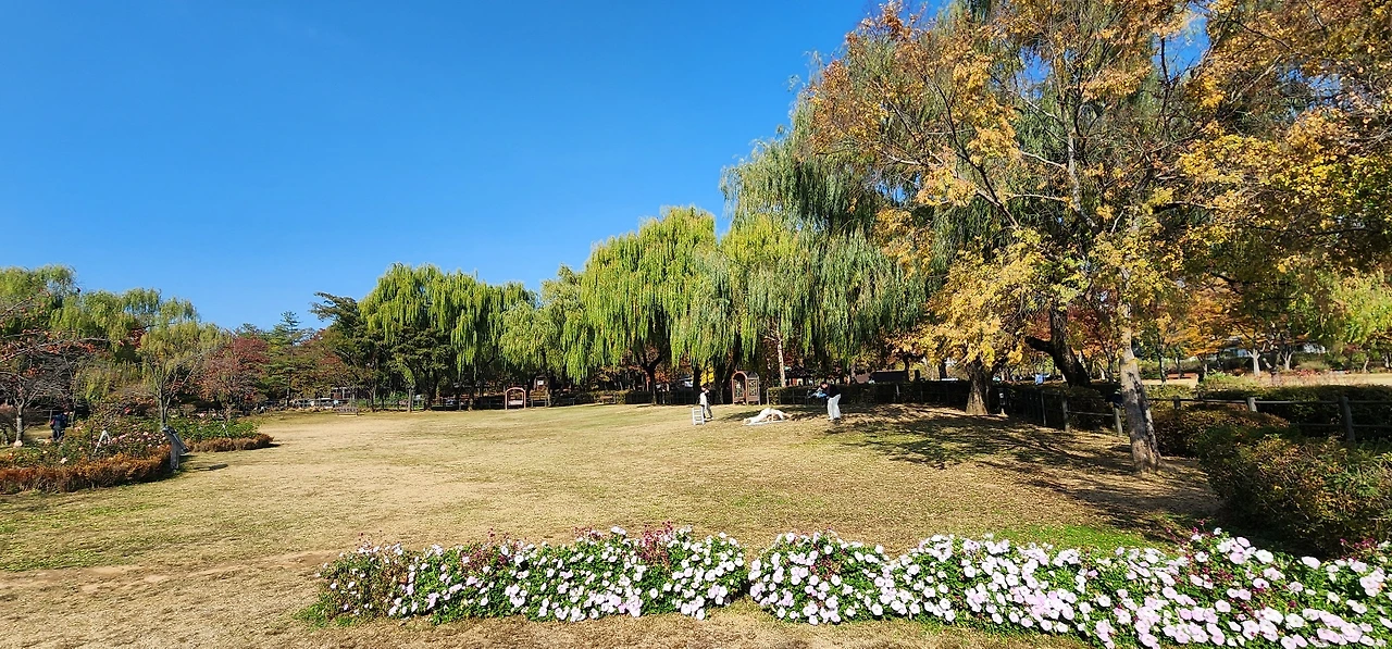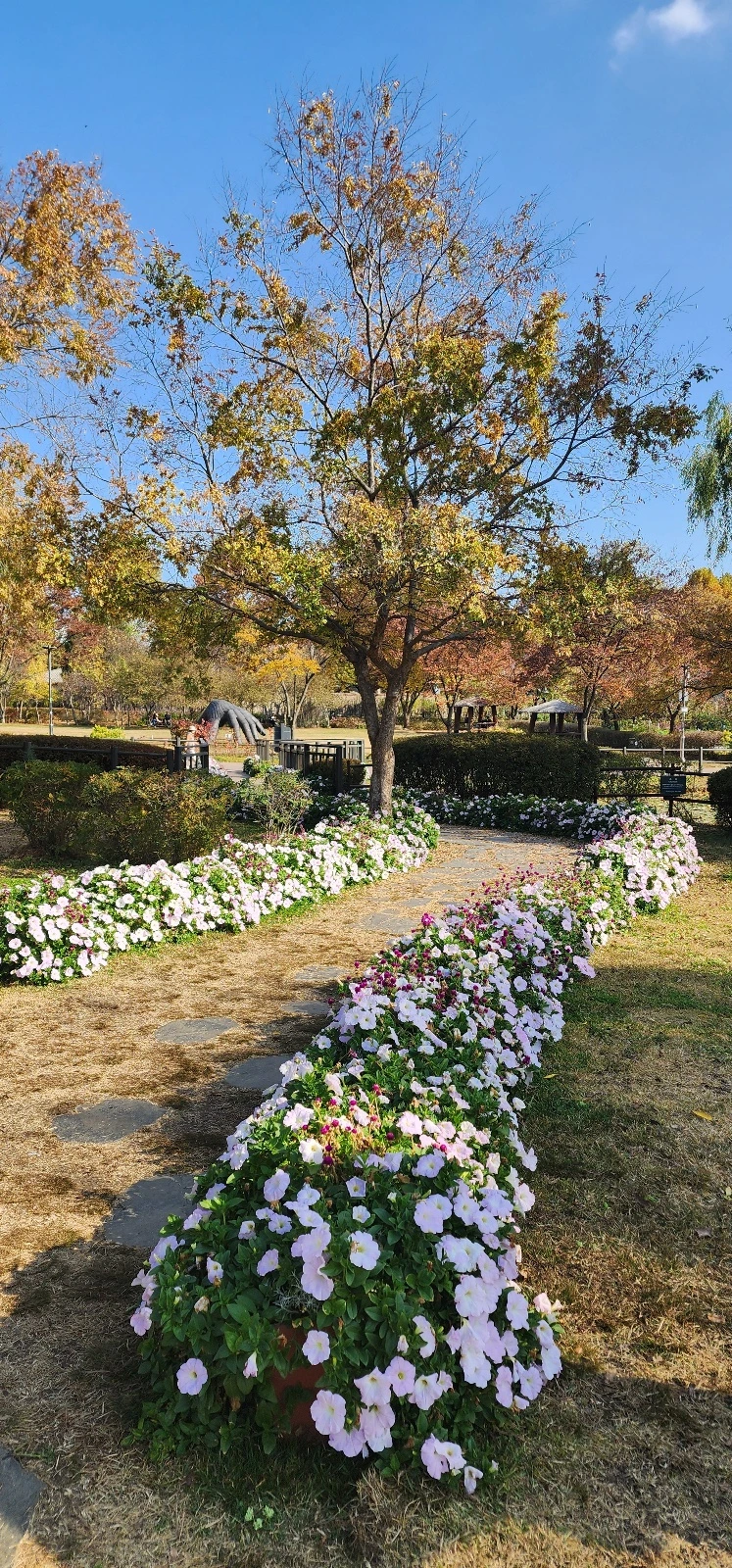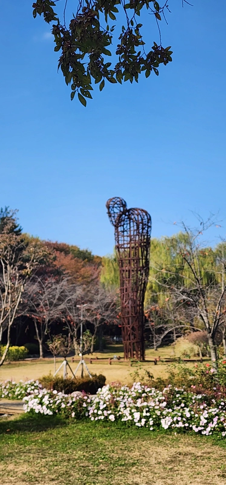 계절을 잊은 장미도 한창이다. 날이 더워서 철을 잊었는지 울긋불긋 봄날 같다. 한쪽에서는 산사열매가 붉게 익어간다. 우람한 백합나무도 노란 물이 들어 장관이다. 대왕참나무에도 단풍이 절정이다. 화살나무는 불타는 중이다. 멀리 가야 단풍을 즐길 수 있는 것은 아니다. 조각과 어우러진 가을 공원이 아름답다. 나오는 길에 페튜니아와 천일홍이 잘 가라는 인사를 건넨다.