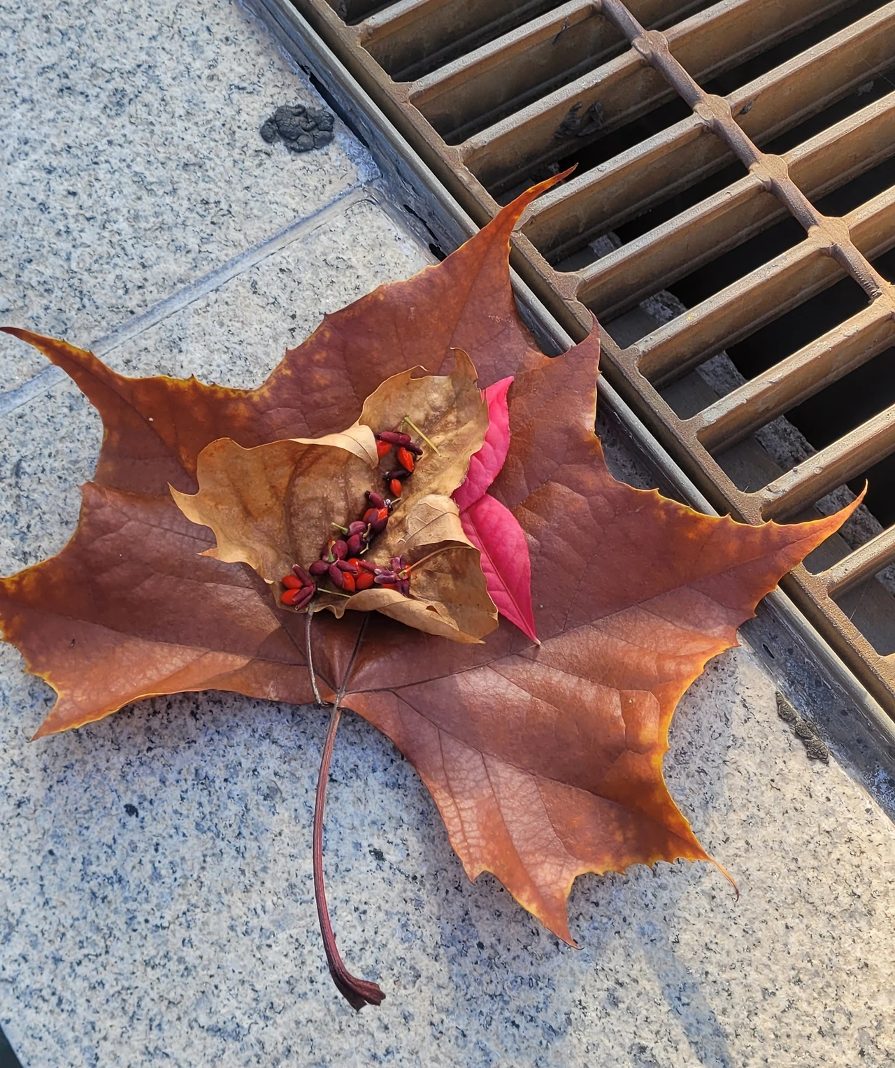 전철을 타고 도착한 이촌동 보도에는 낙엽들이 수북이 떨어졌다. 미국여행 동안 가을을 체감하지 못했는데, 오늘은 제대로 느낄 것 같다. 떨어진 잎들은 플라타너스가 대다수인데 단풍이 들기 전에 잎이 말라버렸다. 올해 날이 더워서 단풍이 곱지 않다고 한다. 하지만 모든 나무들이 그런 것은 아닌 것 같다.화살나무는 아주 붉게 물들어 가을을 제대로 입었다.