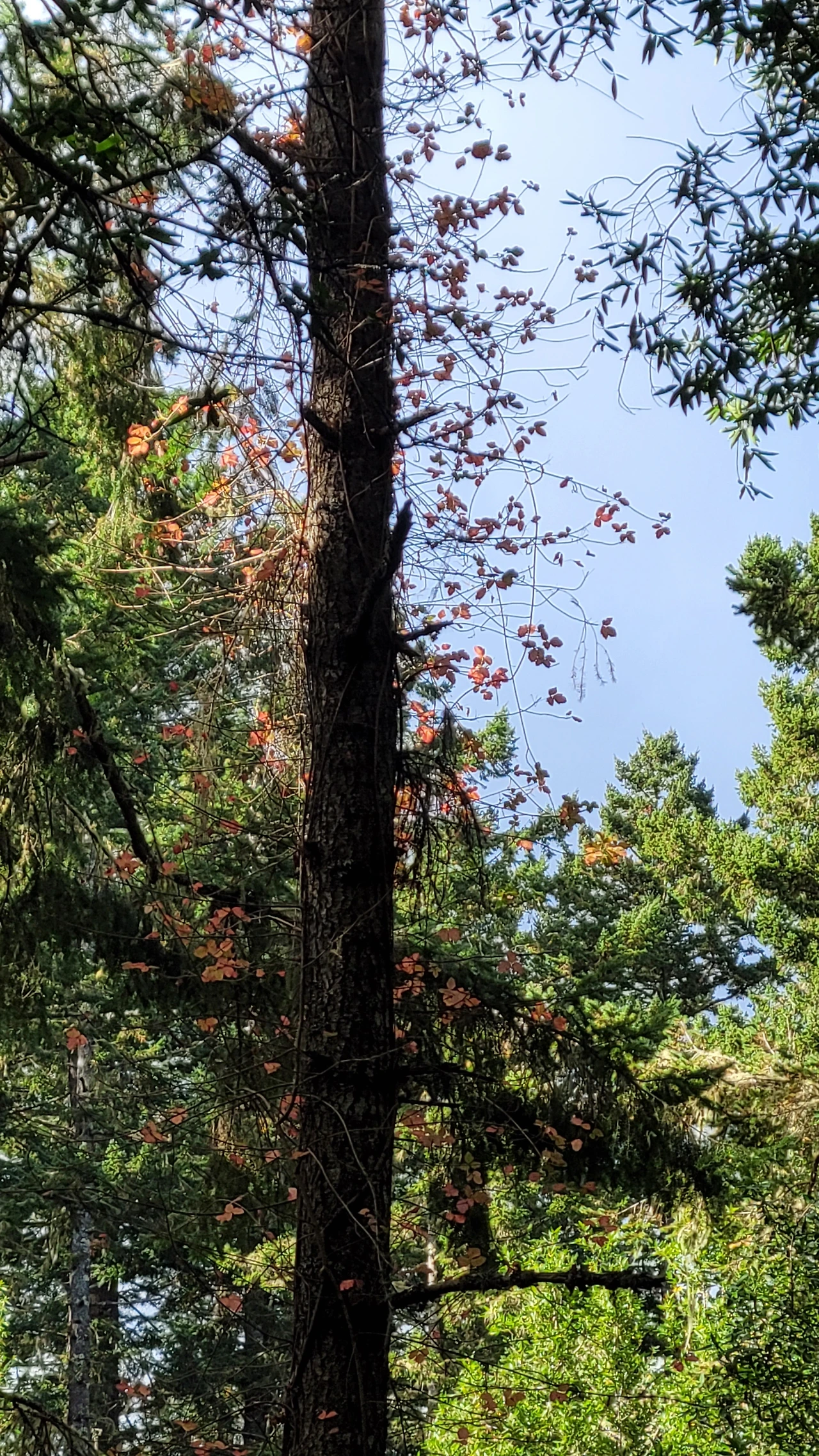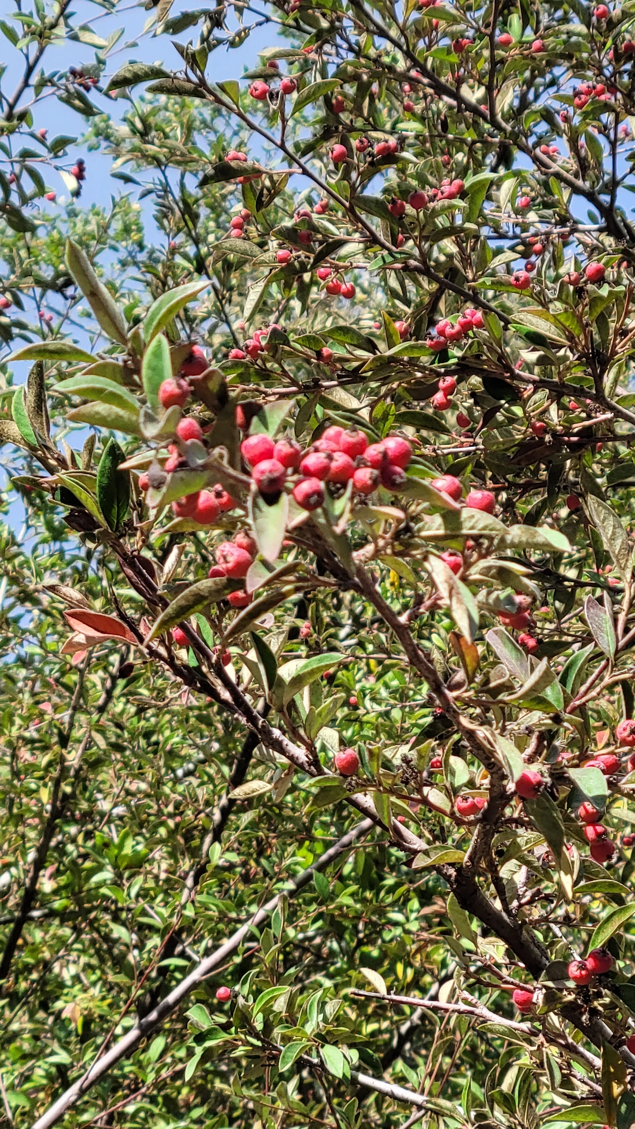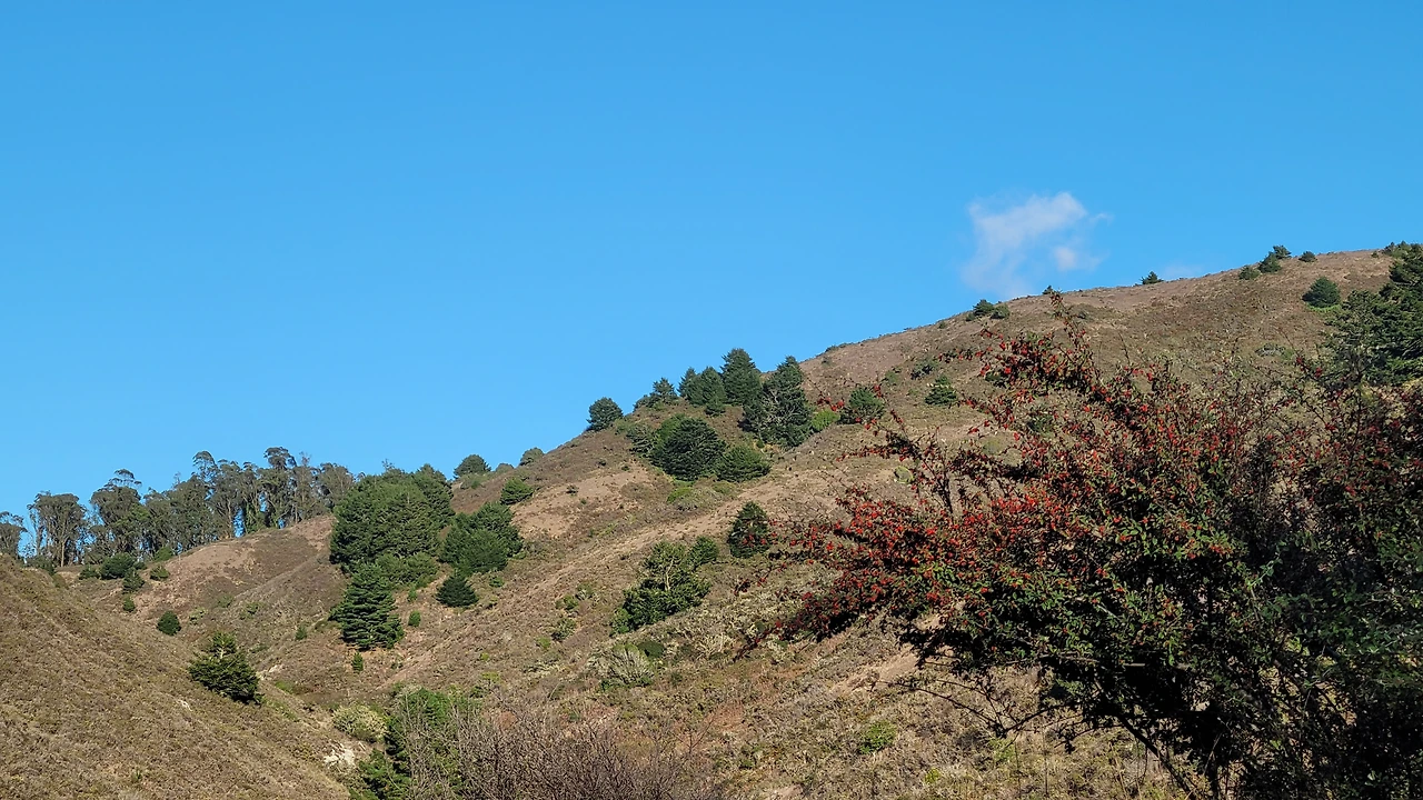 뮤어우즈 숲과 다르게 이곳에는 레드우즈가 별로 보이지 않는다. 맑은 시냇물에 반영된 하얀 수피와 푸른 잎들이 화가가 그린 유화 한 점 같다. 산길을 따라 산마루까지 단숨에 뛰어갔다. 전망이 궁금했다. 뮤어우즈 숲에서는 볼 수 없던 확 트인 시야가 시원하다. 붉은 열매를 주렁주렁 달고 있는 나무가 눈길을 끈다.
