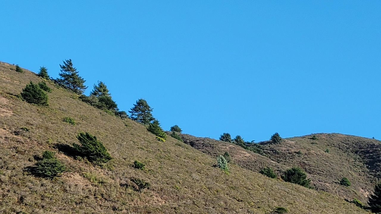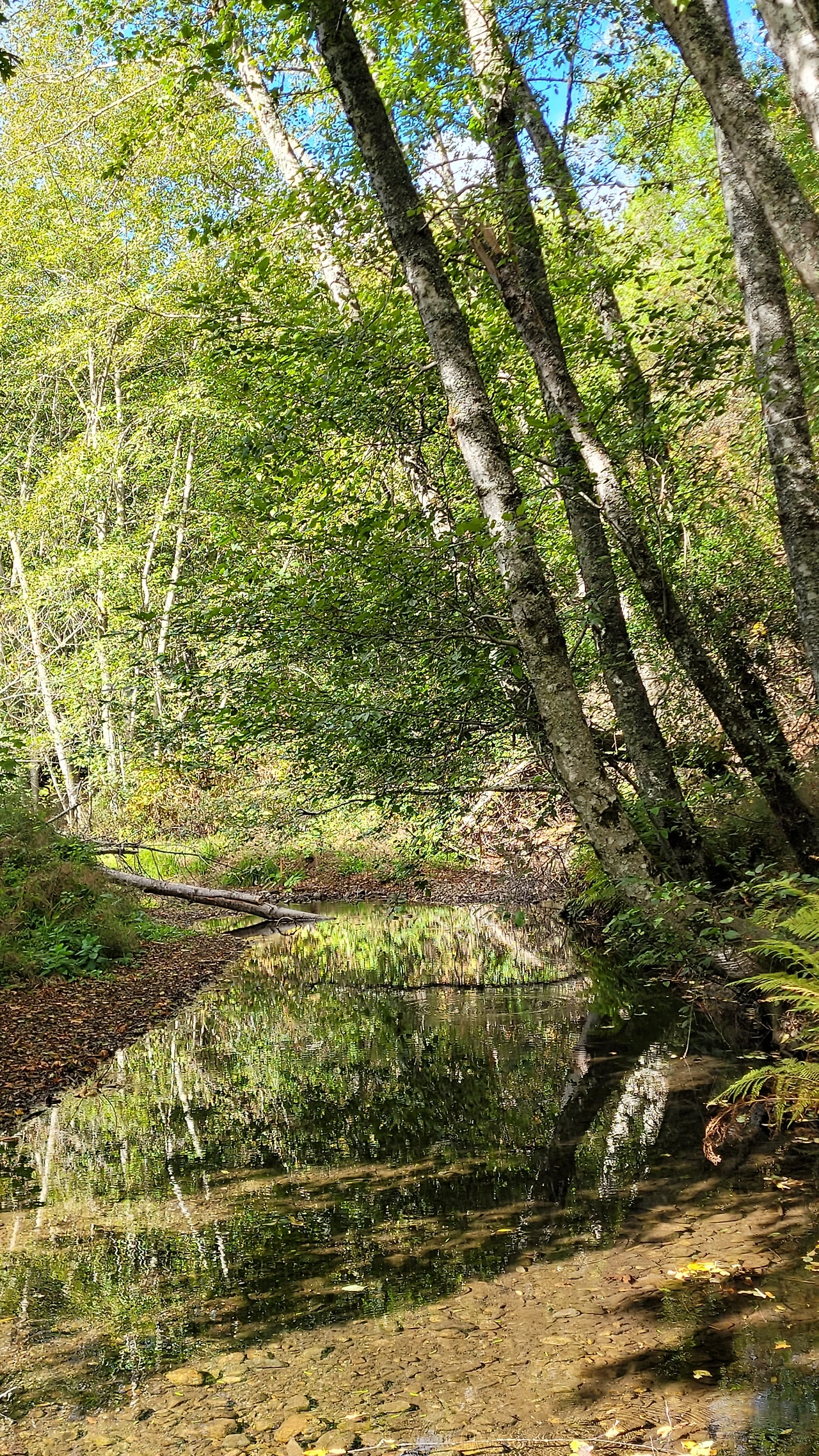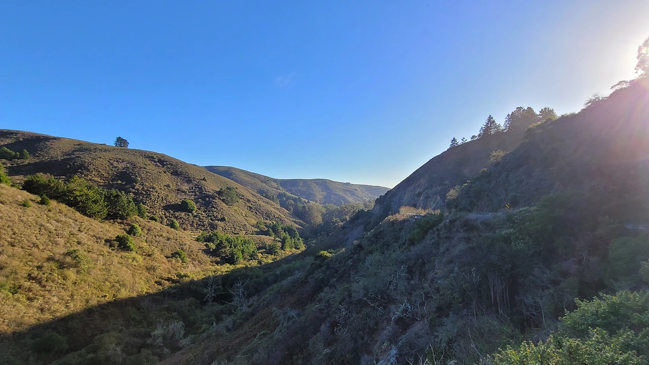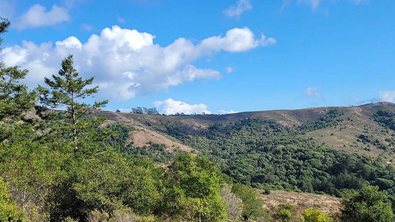 뮤어우즈 숲과 다르게 이곳에는 레드우즈가 별로 보이지 않는다. 맑은 시냇물에 반영된 하얀 수피와 푸른 잎들이 화가가 그린 유화 한 점 같다. 산길을 따라 산마루까지 단숨에 뛰어갔다. 전망이 궁금했다. 뮤어우즈 숲에서는 볼 수 없던 확 트인 시야가 시원하다. 붉은 열매를 주렁주렁 달고 있는 나무가 눈길을 끈다.