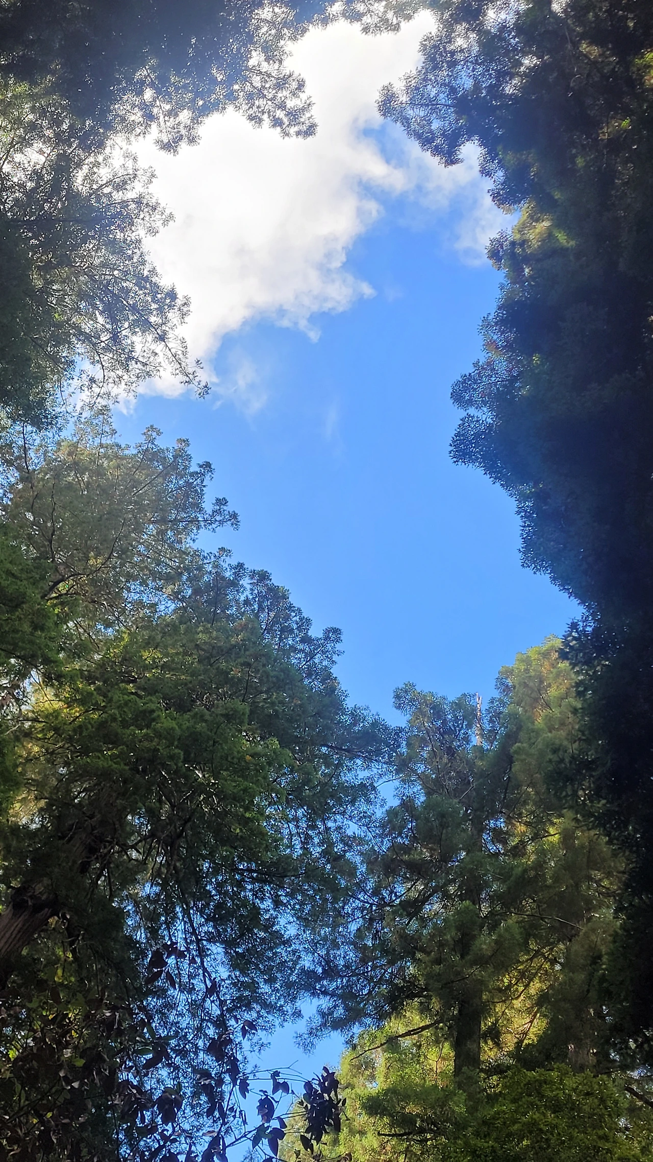 공원에 입장할 때는 날이 흐려서 빗방울도 떨어졌는데 숲을 한 바퀴 돌고 나오는 길에는 날이 개어 푸른 하늘이 비친다. 화창한 하늘과 햇빛을 받은 나무들은 싱그럽고 생동감이 넘친다. 꽤 긴 산길을 걸었지 태고의 숲의 정기가 넘쳐서인지 시간 가는 줄도 모르고 피곤한 것도 모르겠다. 누이들과 헤어져서 입구에서 한참을 기다리다 다른 숲길을 찾아갔다.