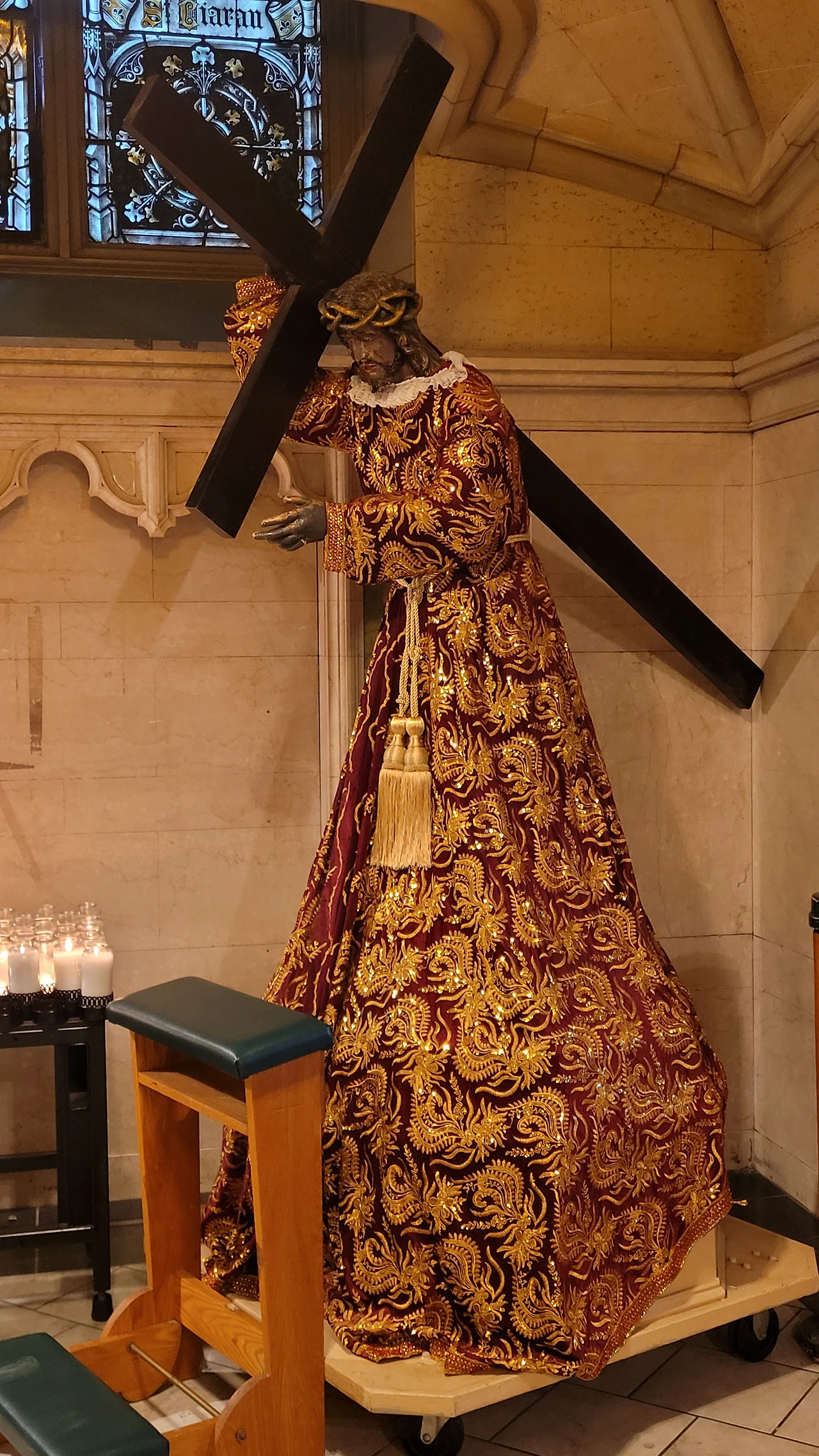 실내는 유럽 성당처럼 화려하지 않고 담백하다. 그래도 높은 층고와 이어지는 아치가 경건한 분위기를 자아낸다. 십자가를 지고 있는 예수님의 외투가 화려해서 눈길을 끈다. 쉽게 볼 수 없는 모습이다. 고난 중이라도 그분의 위엄을 드러내고 싶은 사람들의 마음 씀 같다.
