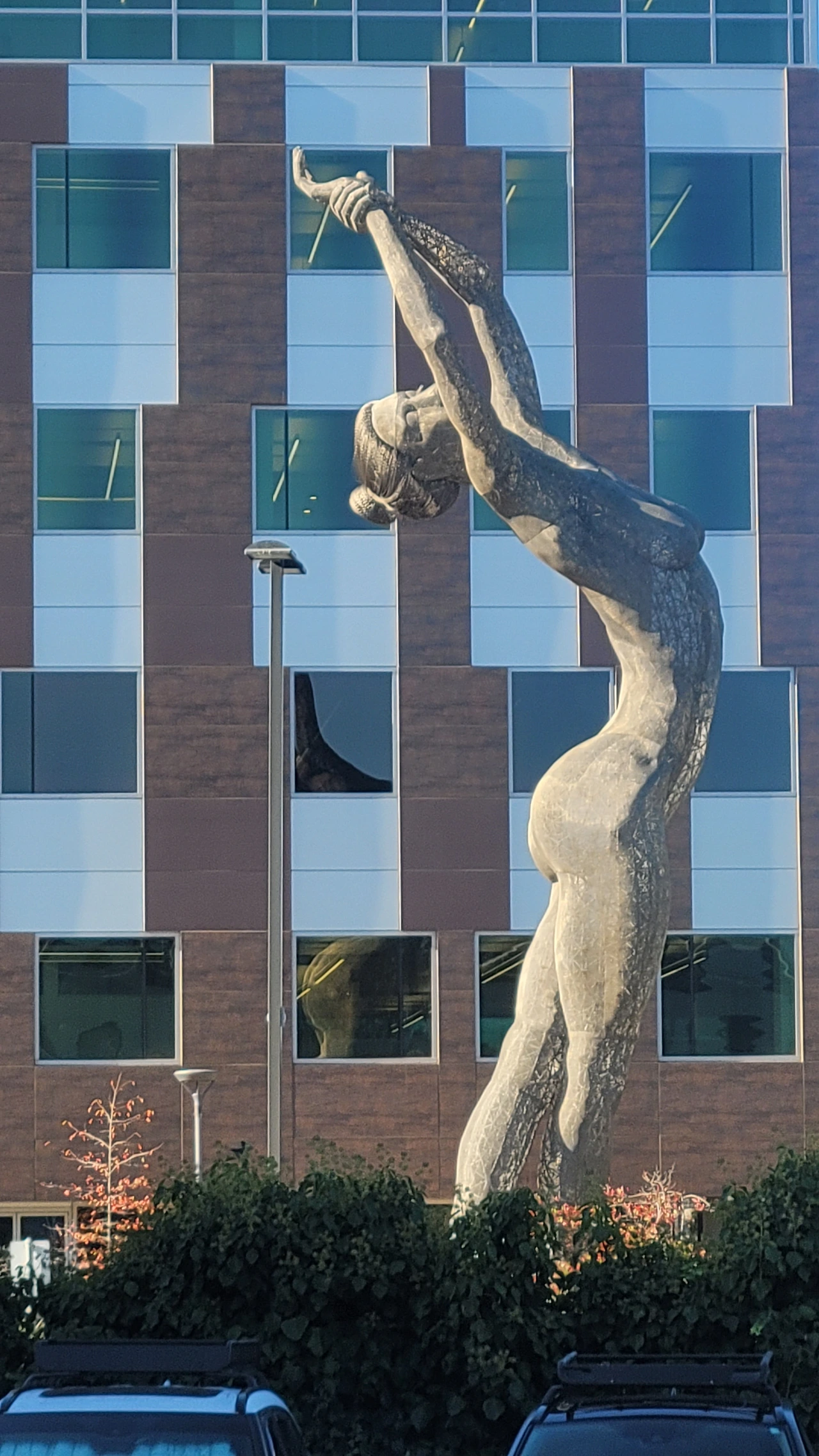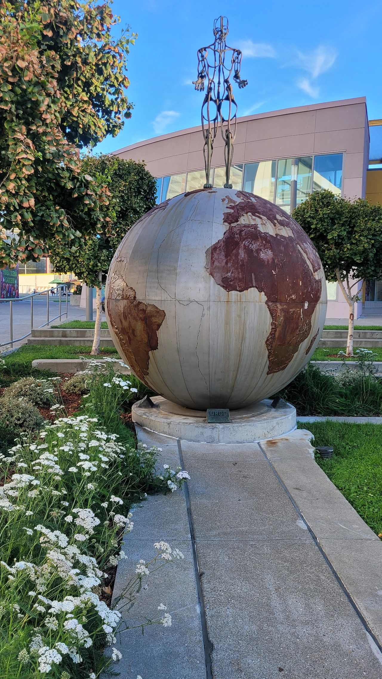 광장 이면에는 유명한 조각작품이 있다. Chico MacMurtrie의 운동 청동 조각품인 "Urge to Stand'다. 그는 로봇 조각, 설치, 퍼포먼스의 교차점을 탐구하는 미디어 아티스트로 국제적으로 인정받고 있다. 이 조각은 체중이 100파운드 이상인 사람이 지구를 바라보는 벤치에 앉아 있으면 조각품이 움직인다. 움직이는 대화형 조각인 셈이다.