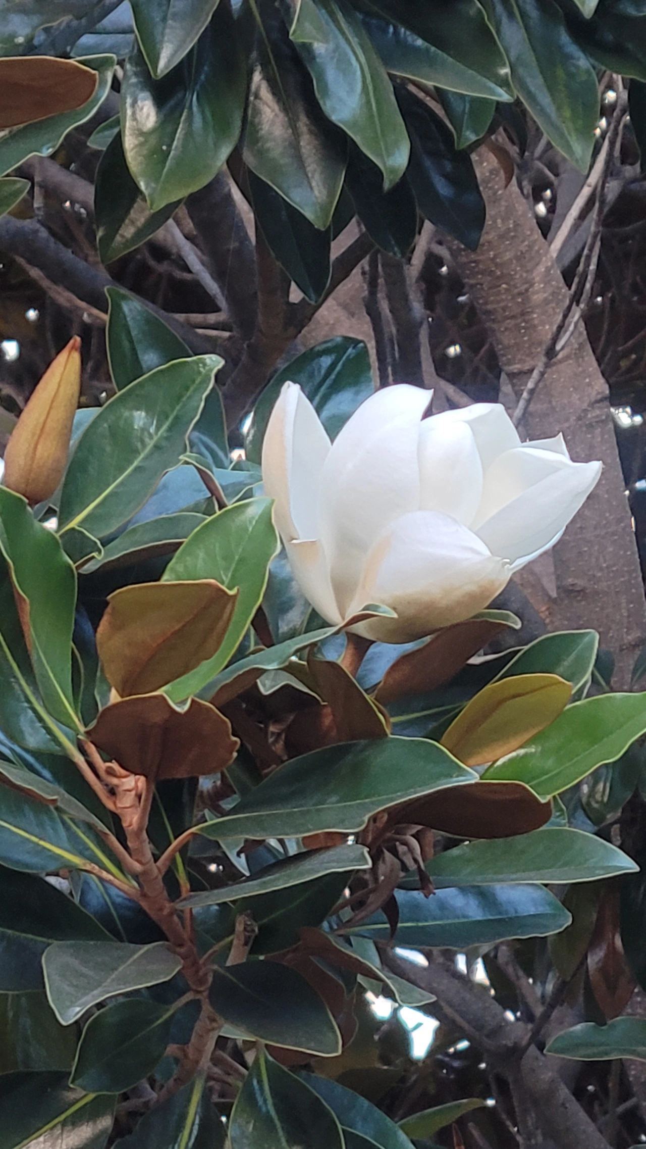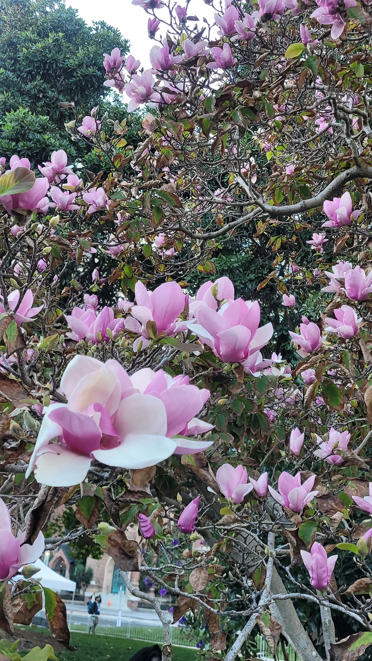 공원을 돌아 나오는 길에 목련꽃을 만났다. 11월인데도 목련이 활짝 피었다. 자목련이라서 우아하기까지 하다. 꽃다발을 한 아름 선물로 받은 기분이다. 꽃을 보고 있으니 지나가는 미국인이 아름답지 않냐고 말을 건넨다. 보는 눈은 저마다 비슷한 것 같다. 자목련 이외에도 미국 목련인 태산목도 꽃송이를 달고 있다.