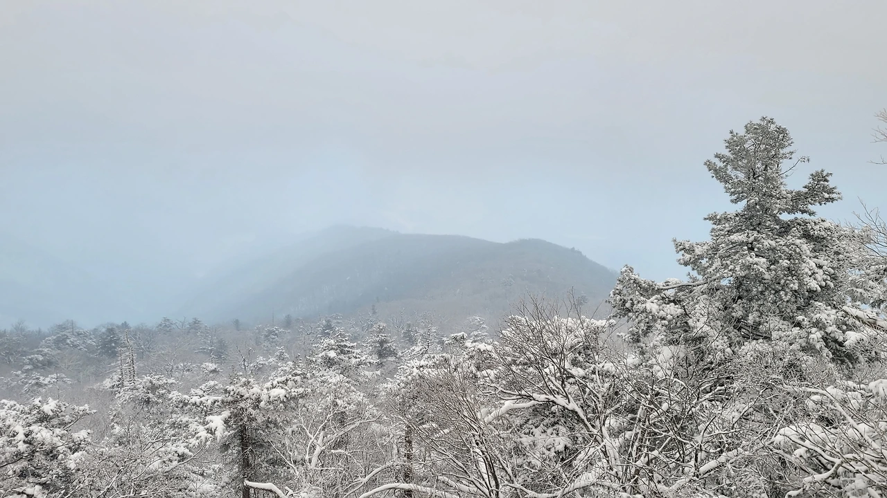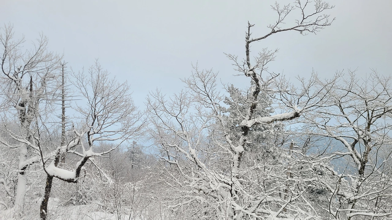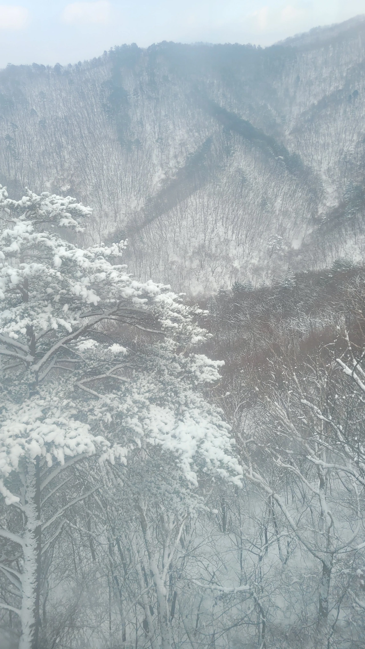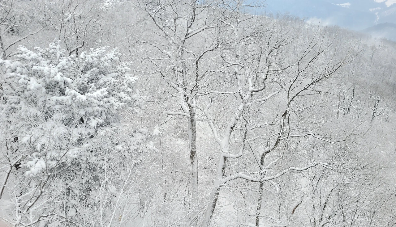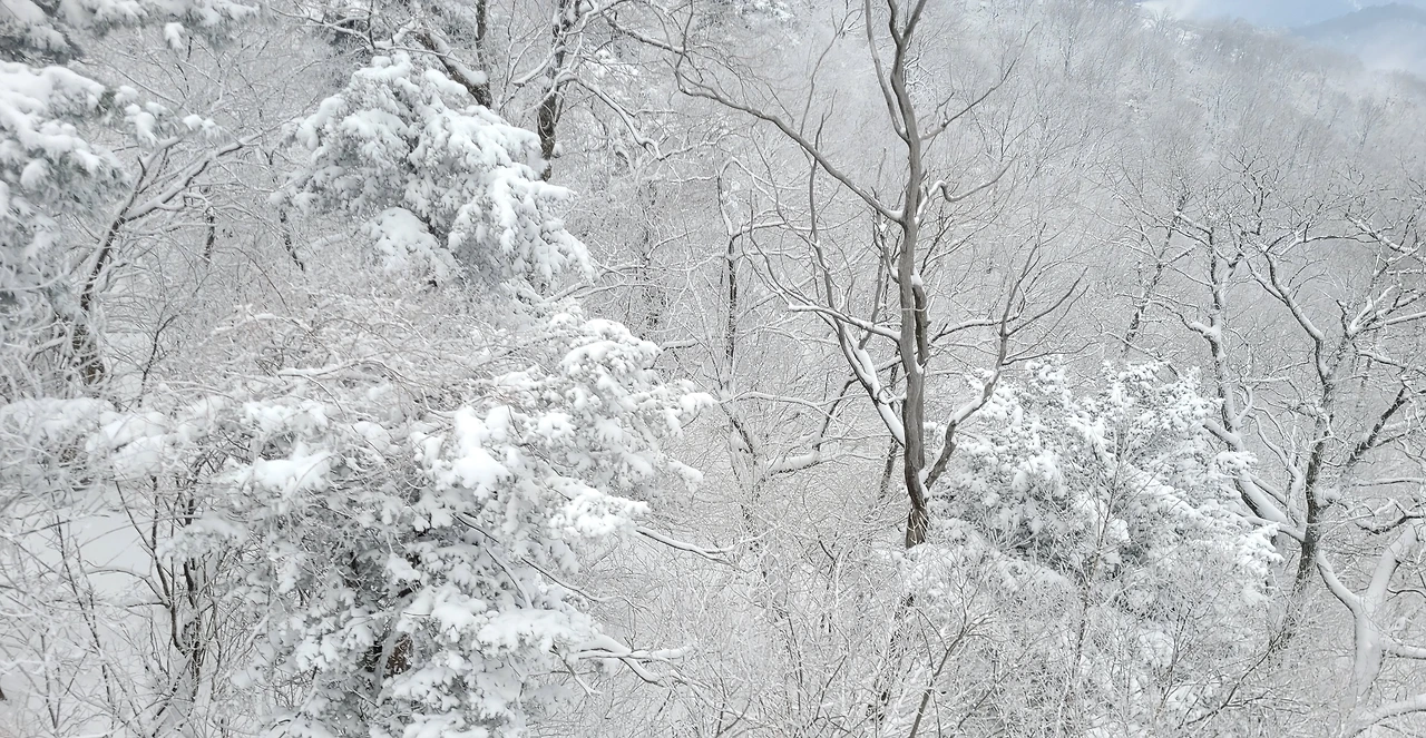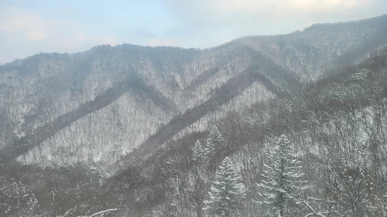 케이블카를 타고 가는 동안 높은 곳에서 내려다보는 산의 실루엣이 새롭다. 마치 산줄기를 진한 선으로 그어놓은 듯 산세가 선명하다. 고도가 높아질수록 숲에는 눈꽃이 피었다. 산 아래는 바람으로 인해 나뭇가지에 눈이 남아있지 않은데 산마루는 눈을 뒤집어쓴완전히 다른 풍경이다.