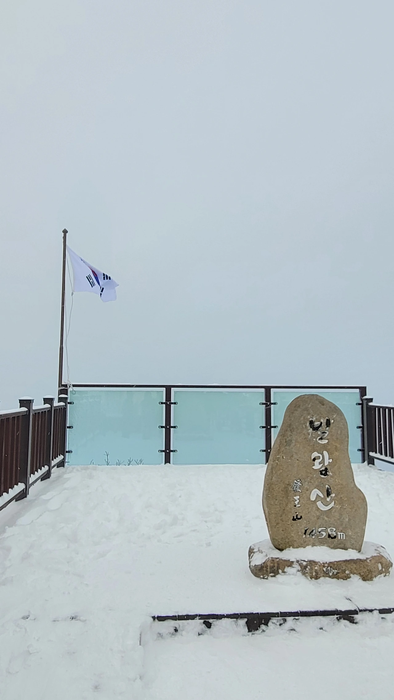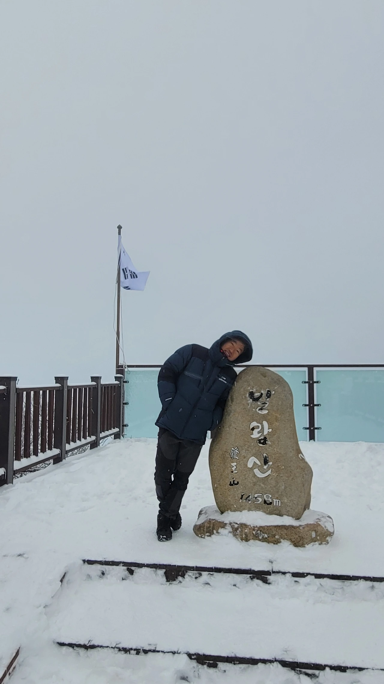 태극기가 휘날리는 정상에 섰다. 북풍이 휘몰아쳐 맨 손을 잠시라도 꺼낼 수 없다. 곧바로 꽁꽁 얼기 때문이다. 어쨌든 꼭대기에 왔으니 인증사진을 남긴다. 모자를 쓰지 않으면 잠시라도 견디기가 어려울 정도로 추위가 거세다.