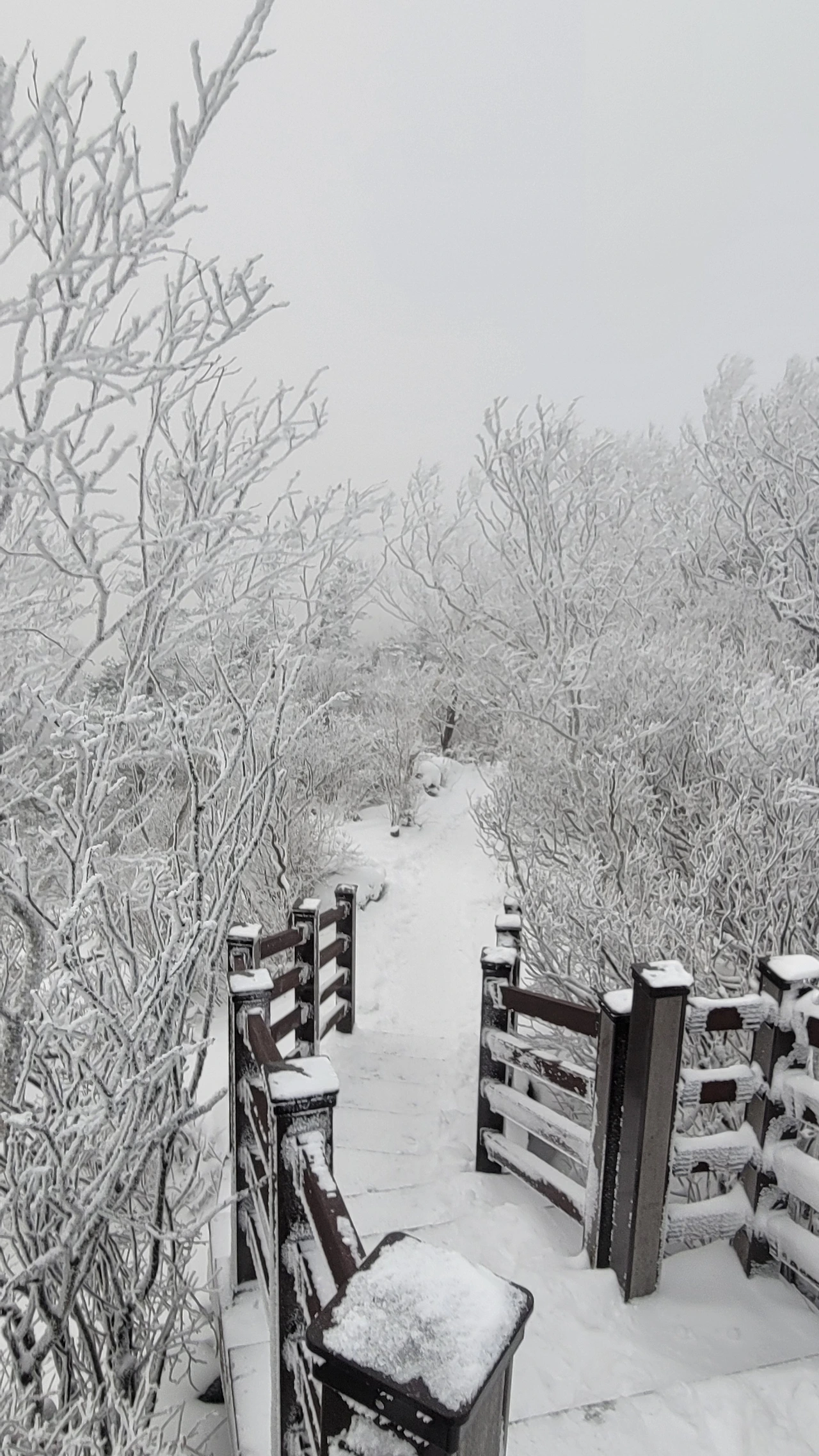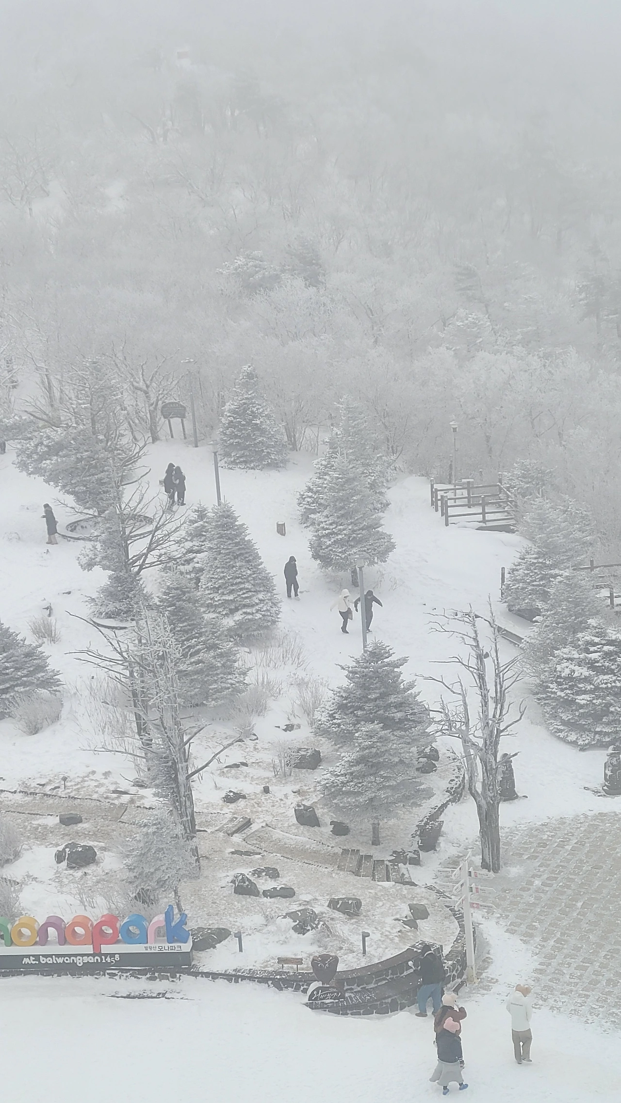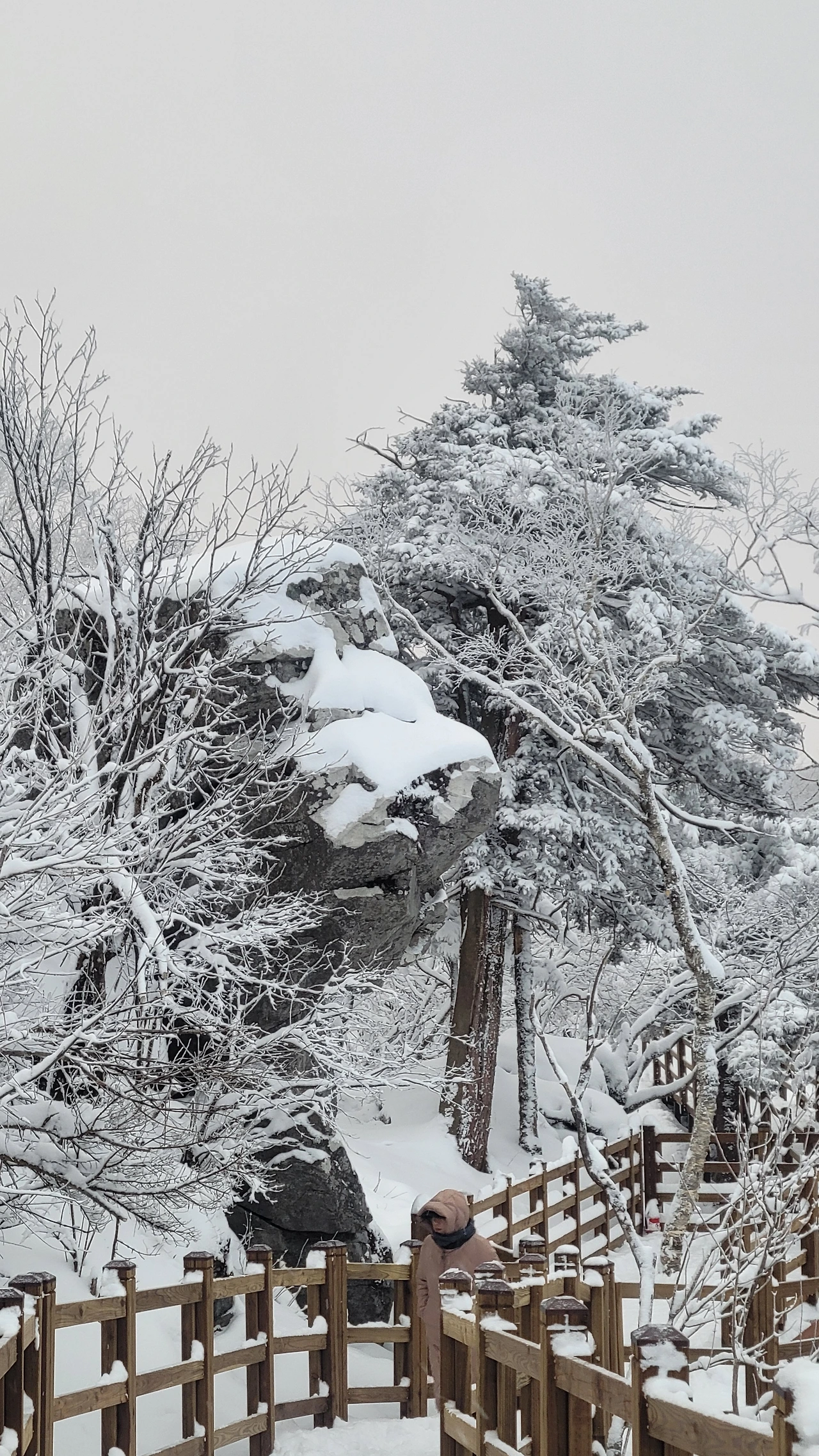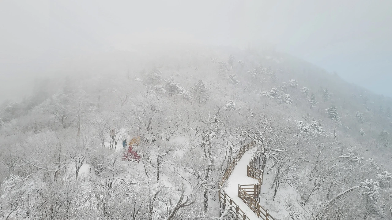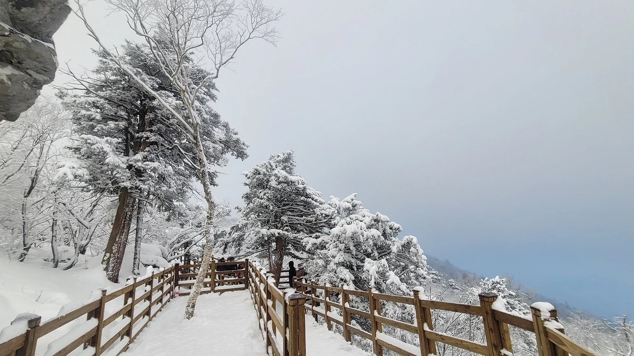 마침내 정상에 도착했다. 아쉽게도 전망대는 시야가 제로고 안전문제로 끝까지 가볼 수도 없다. 짙은 운무로 아무것도 안 보이는 데다 바람은 얼굴이 아플 정도로 시리고 세차다. 다행히 주목 숲으로 가는 길은 바람이 잦아들어 그나마 괜찮다.눈에 비치는 공간은 전부 눈으로 채색되어 완전히 서정적인 그림이 되었다.그곳에서는 사람도 그림의 일부가 된다. 추위로 얼굴이 얼얼하지만 환상적인 경치에 잘 왔다는 생각으로 마음이 흐뭇하다.