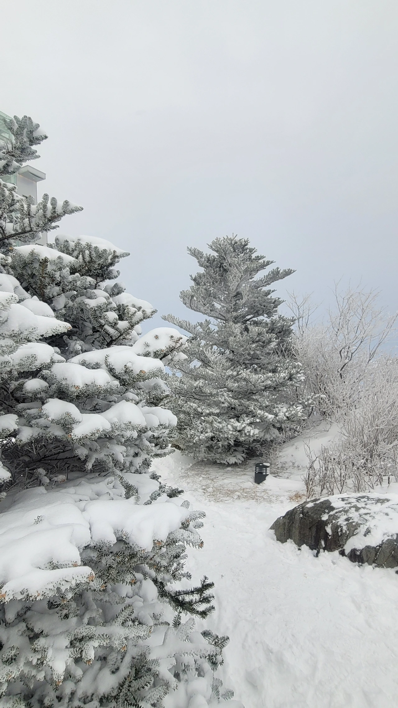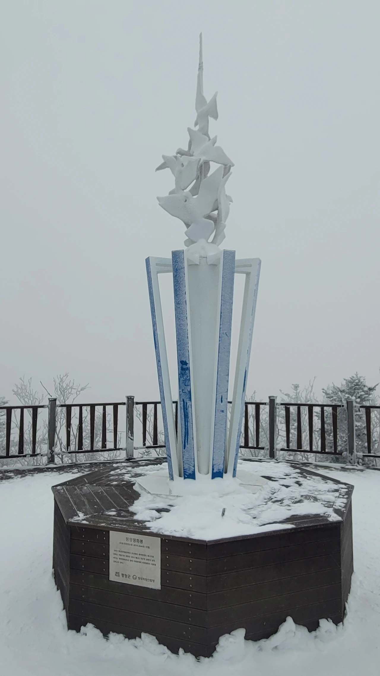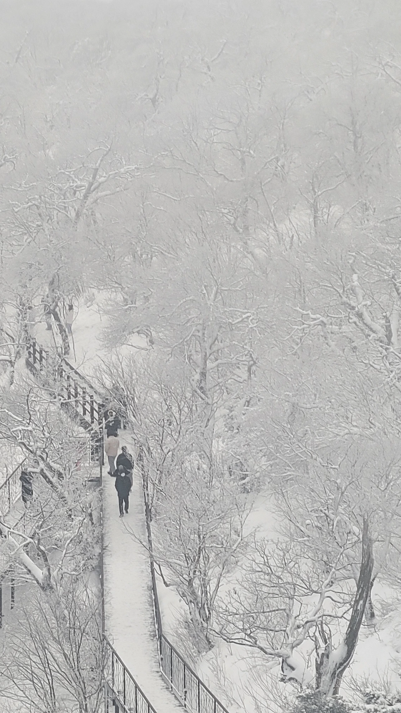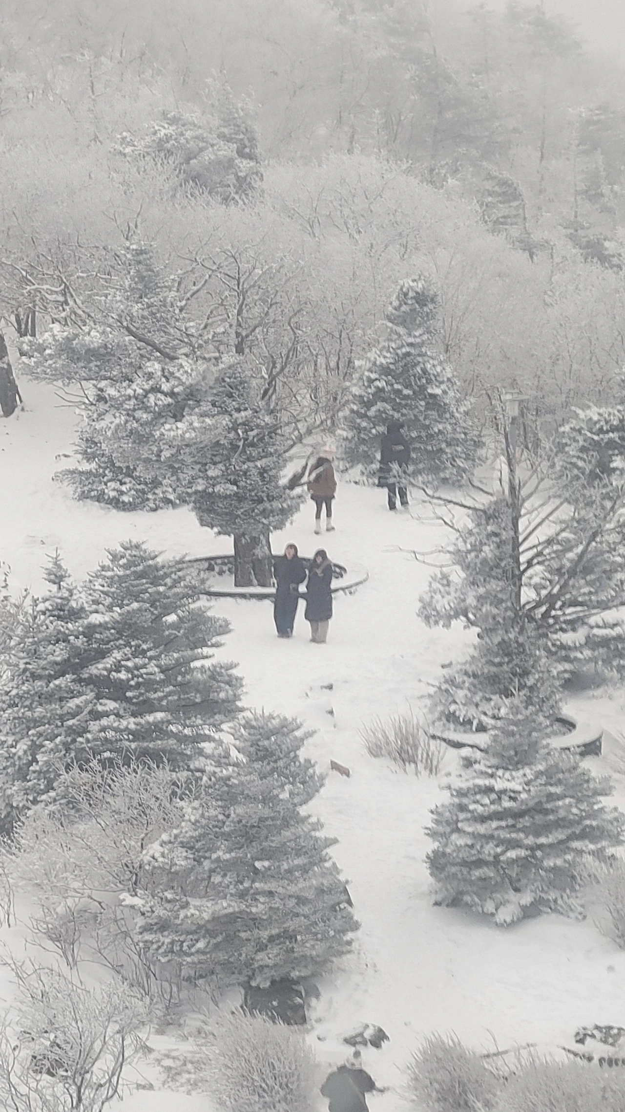 마침내 정상에 도착했다. 아쉽게도 전망대는 시야가 제로고 안전문제로 끝까지 가볼 수도 없다. 짙은 운무로 아무것도 안 보이는 데다 바람은 얼굴이 아플 정도로 시리고 세차다. 다행히 주목 숲으로 가는 길은 바람이 잦아들어 그나마 괜찮다.눈에 비치는 공간은 전부 눈으로 채색되어 완전히 서정적인 그림이 되었다.그곳에서는 사람도 그림의 일부가 된다. 추위로 얼굴이 얼얼하지만 환상적인 경치에 잘 왔다는 생각으로 마음이 흐뭇하다.