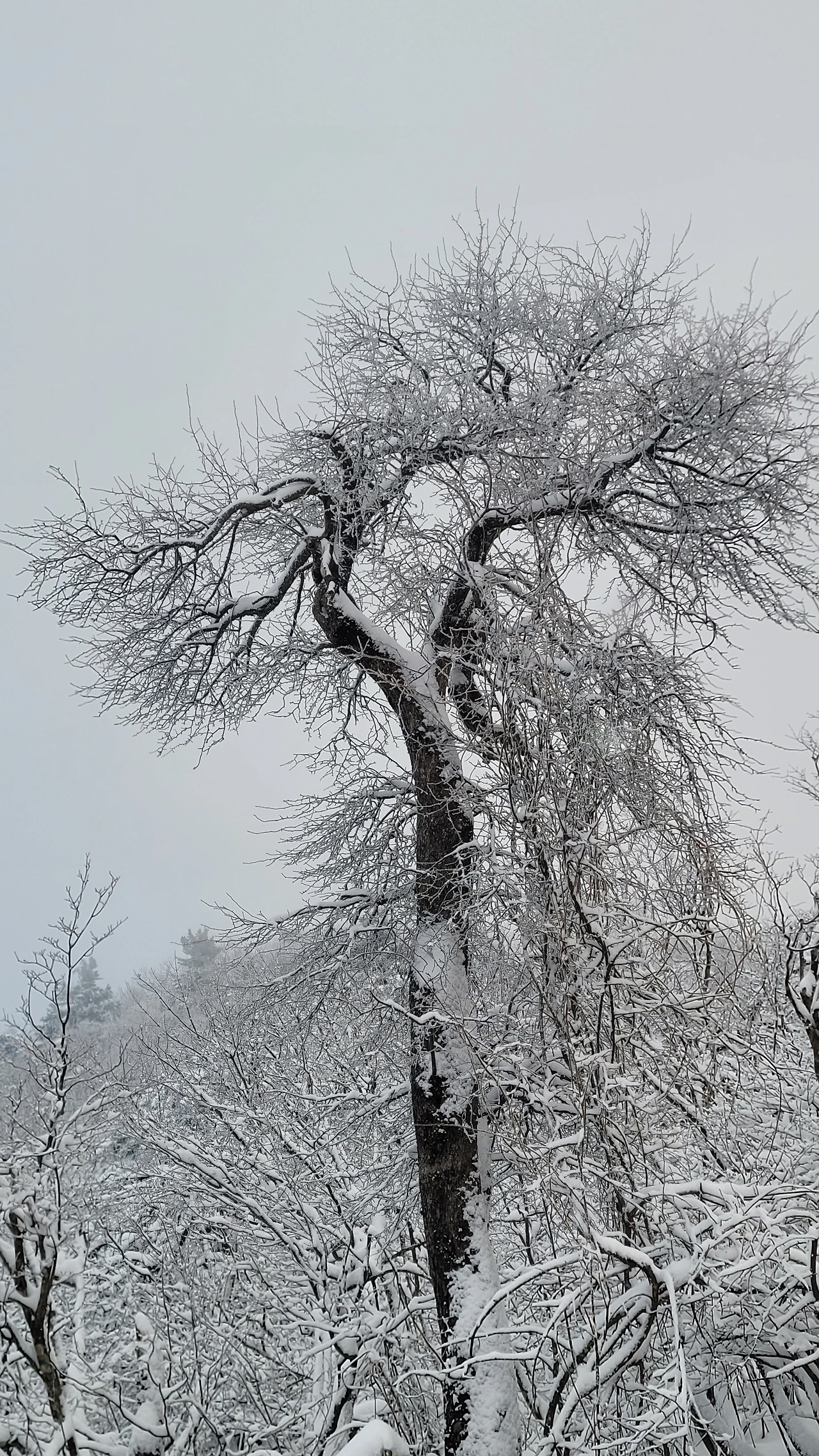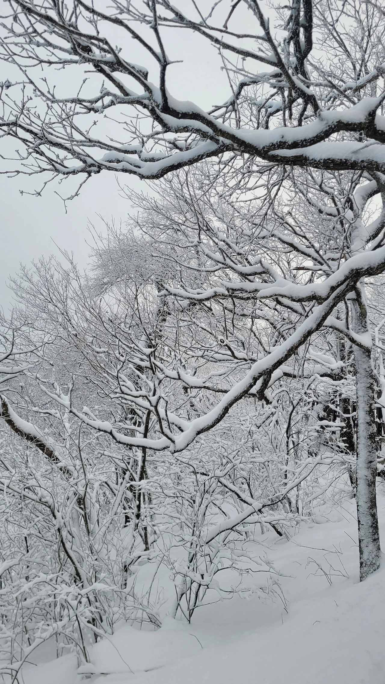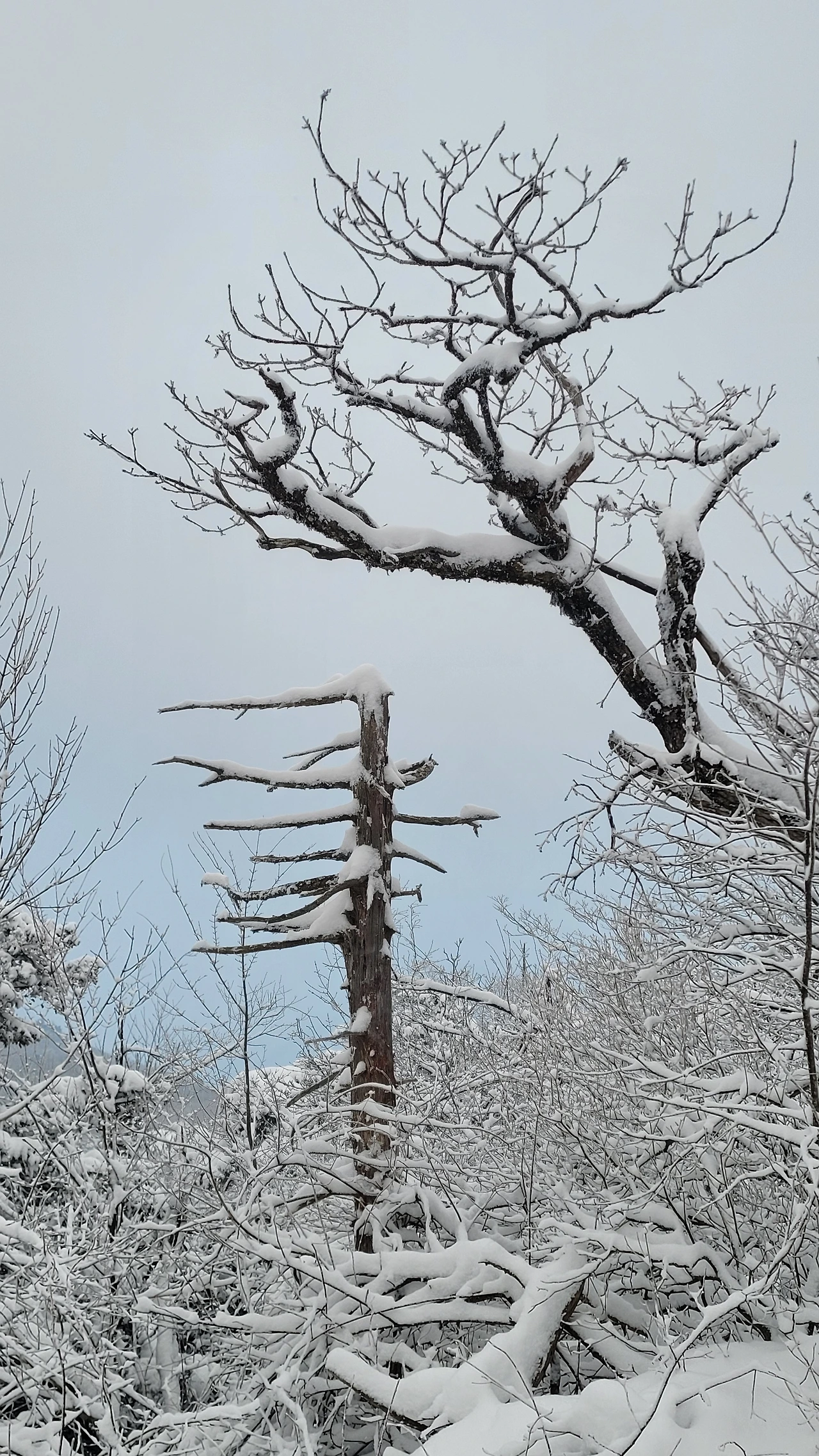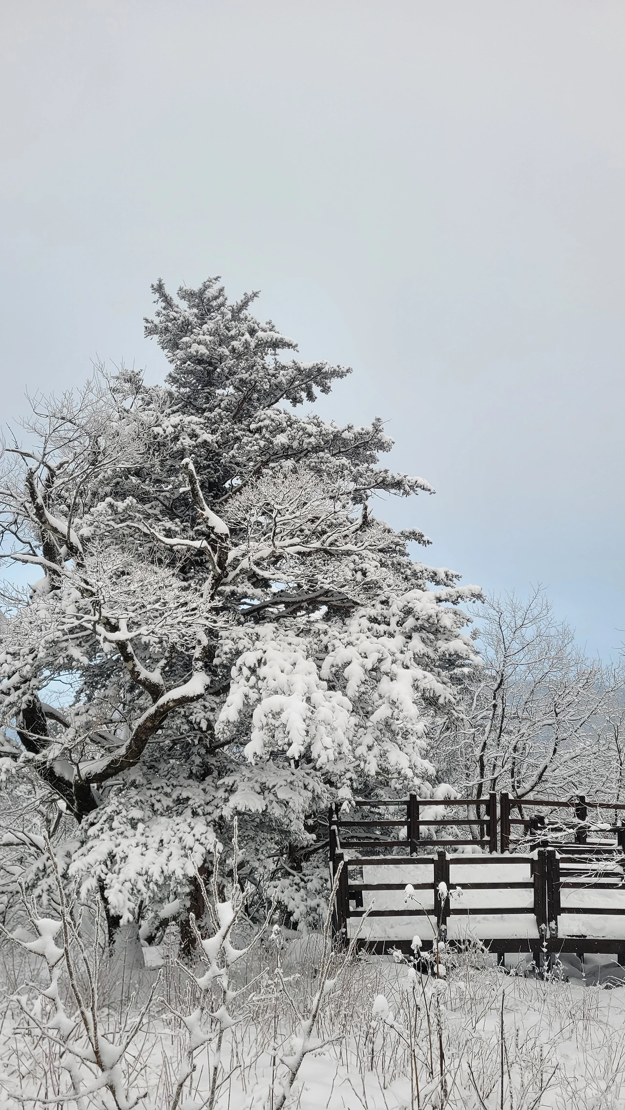 마침내 정상에 도착했다. 아쉽게도 전망대는 시야가 제로고 안전문제로 끝까지 가볼 수도 없다. 짙은 운무로 아무것도 안 보이는 데다 바람은 얼굴이 아플 정도로 시리고 세차다. 다행히 주목 숲으로 가는 길은 바람이 잦아들어 그나마 괜찮다.눈에 비치는 공간은 전부 눈으로 채색되어 완전히 서정적인 그림이 되었다.그곳에서는 사람도 그림의 일부가 된다. 추위로 얼굴이 얼얼하지만 환상적인 경치에 잘 왔다는 생각으로 마음이 흐뭇하다.