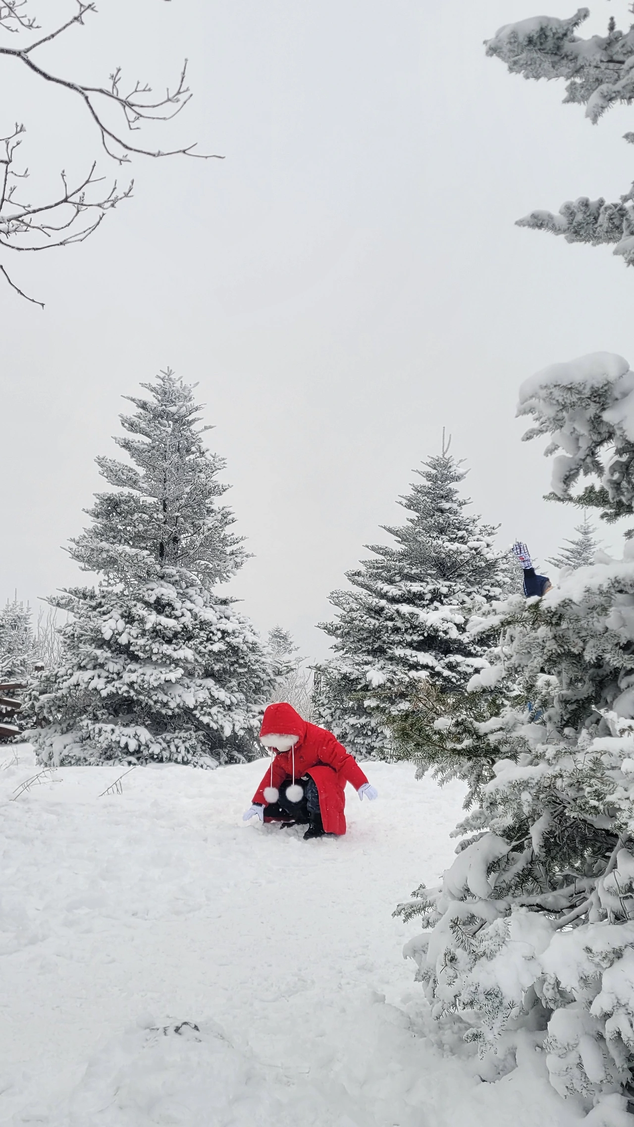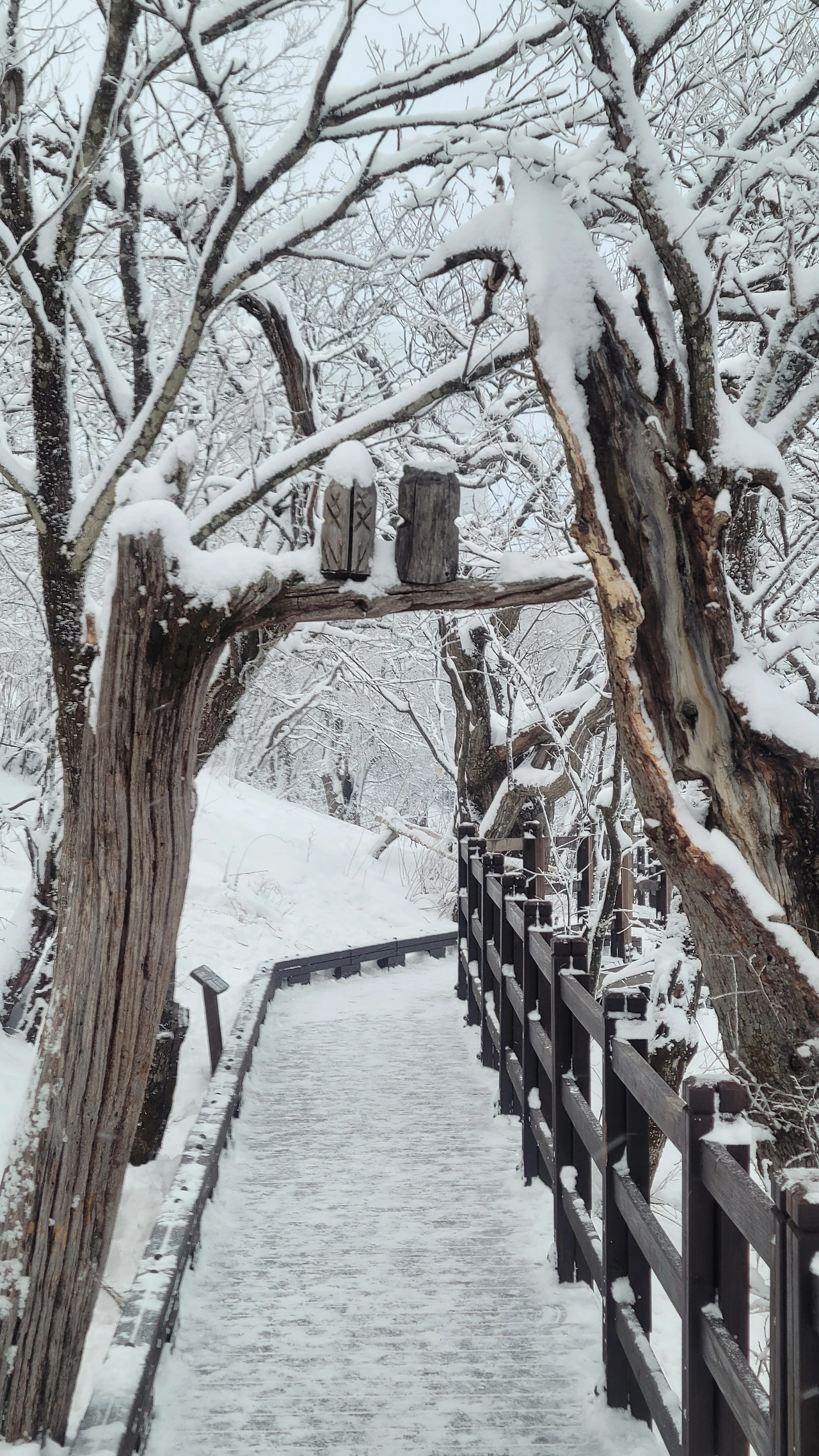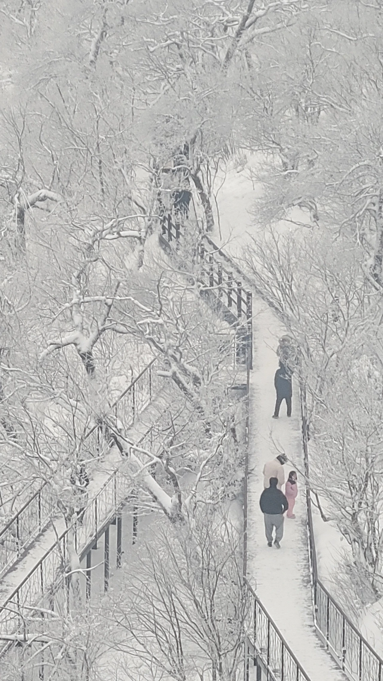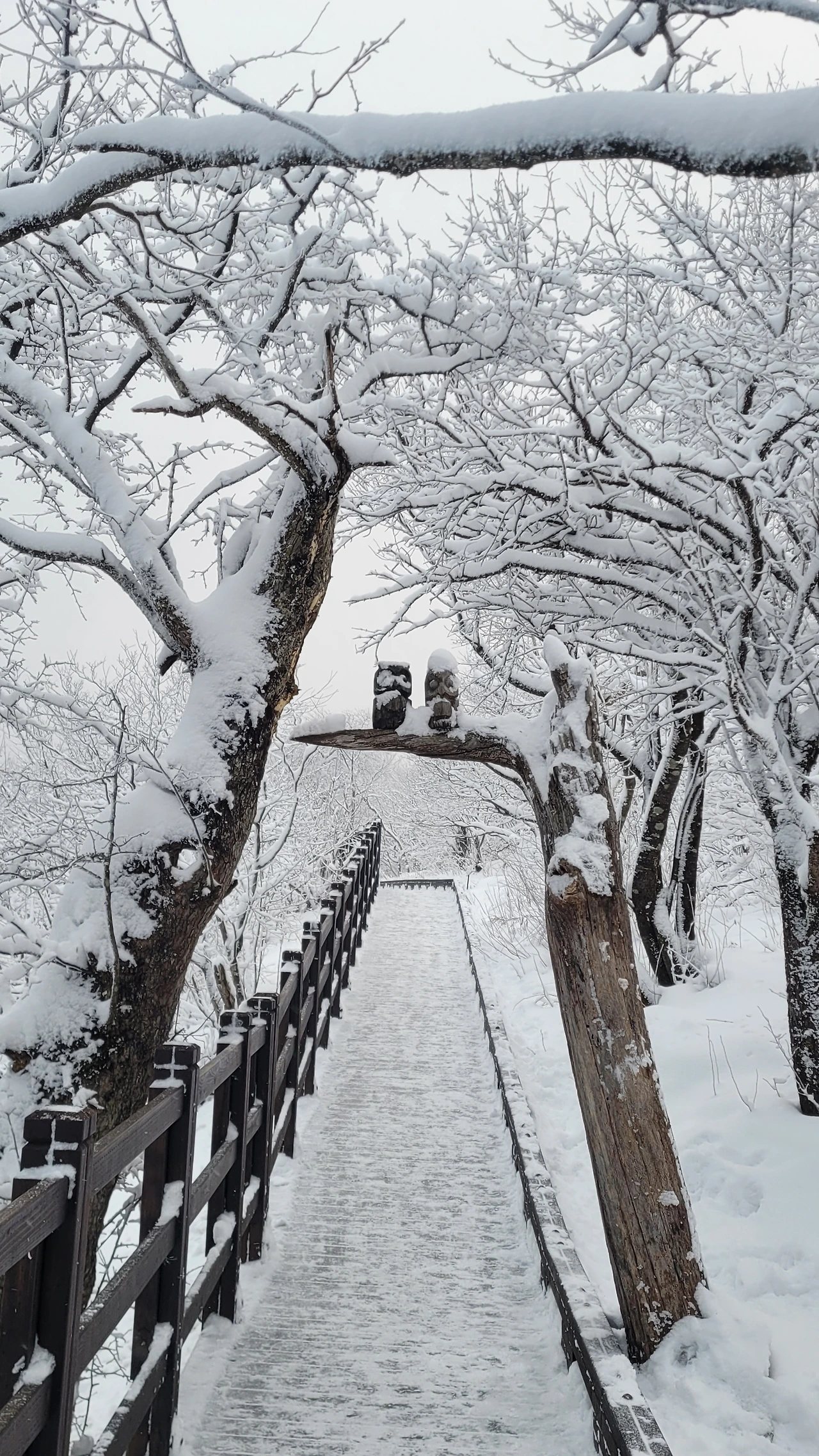 나도 모르게 홀리듯 숲 속으로 발길을 옮긴다. 눈이 빚은 신세계에 들어서니 마음이 동심에 젖는다. 코가 얼 정도로 춥지만 풍경에 압도되어 감탄에 추위를 잊게 된다. 싱가포르에서 온 외국인 가족들이 엄청 신이 났다. 빨간 망토를 두른 아이는 동화 속 주인공이다. 서로 사진을 찍어주며 눈 오는 날의 기쁨을 만끽하는 순간이다.