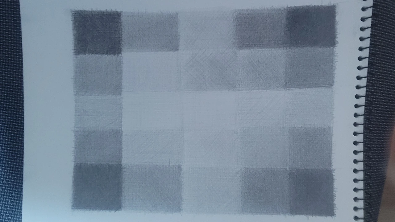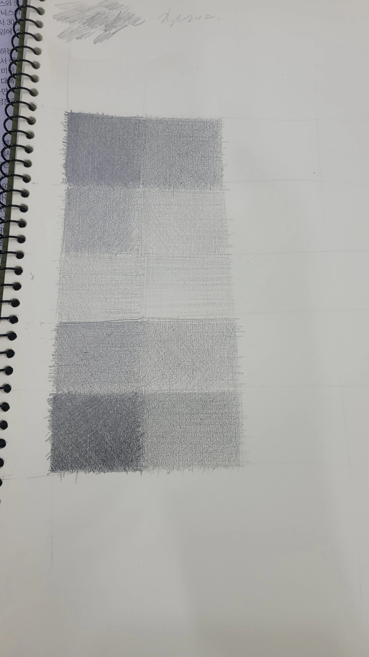 그다음 칸은 더 옅게 해야 했다. 갈수록 힘들다. 겉보기에는 쉬워 보이는데 그렇지 않다. 많이 긋는 게 오히려 쉬운 일이다. 진하게 그리는 것이 편하다. 그렇게 한 줄을 다 채웠다. 그리고 보니 얼추 음영의 구분이 보인다.
