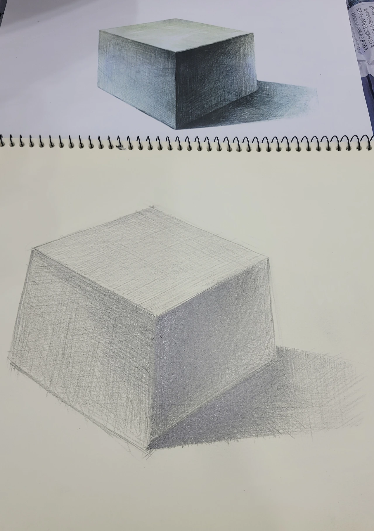 칠하듯 음영을 묘사하는 것보다 선의 겹침과 반복이 확실히 내용이 있는 그림이 된다. 반복의 시간이 흐르고 도형의 윤곽은 그럴듯한데 선을 똑바로 긋지 못해서 정육면체가 아닌 사다리꼴 도형이 되어 버렸다. 선을 잘 쓰는 일이 중요하다는 사실을 깨닫는다.
