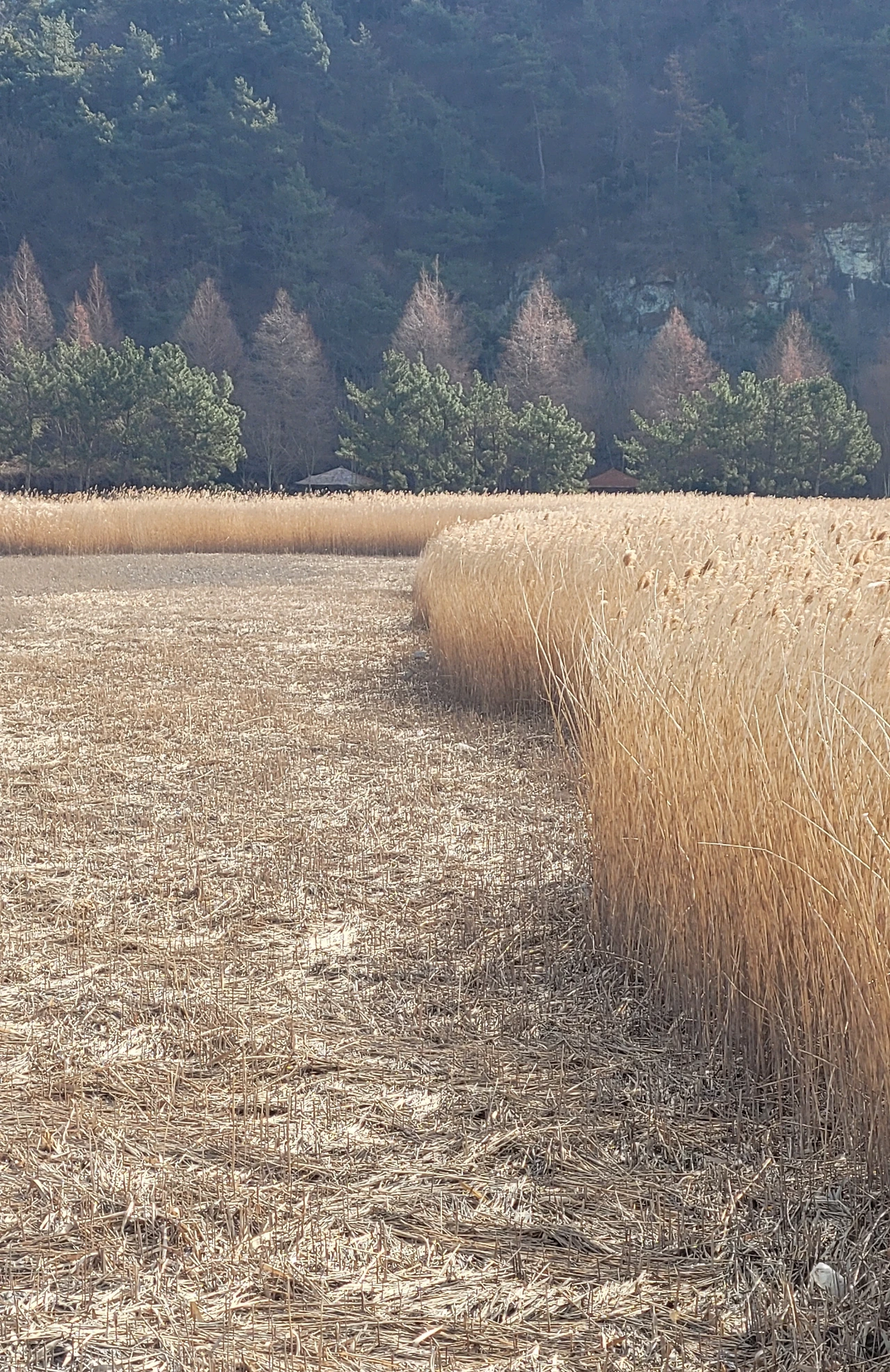 베어낸 갈대밭의 실루엣이 인상적이다. 곡선에 깃든 부드러운 음영이 마음에 잔잔히 스며든다.