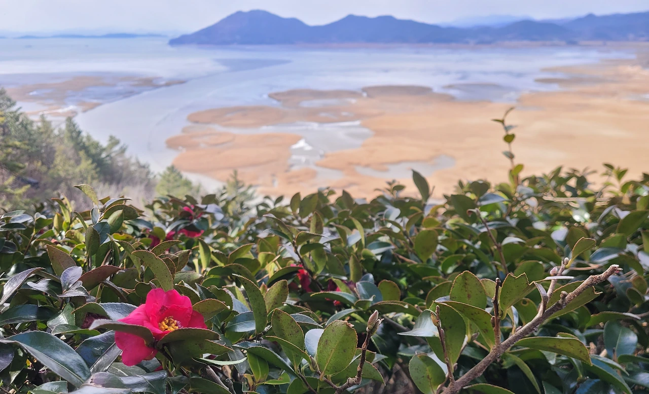 마침내 전망대다. 동백나무 숲에 한 두 송이 꽃이 벙글었다. 붉은 꽃송이 너머 노란 갈대밭을 지나 바다 위에 자리한 섬들이 꿈결처럼 아스라하다. 푸른빛 이 감도는 섬의 자태가 매혹적이다. 마음을 혹하게 하는 절경에 푹 빠져든다.