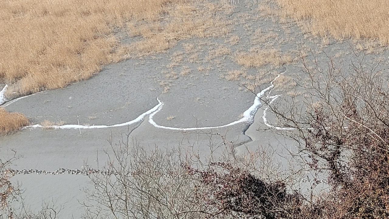 전망대가 공사 중이라 보조 전망대 밖에 오를 수 없다. 높은 곳에 올라 바라보는 풍경은 확연히 다르다. 유려한 물길의 곡선이 뚜렷하고 해안선을 따라 남아있는 눈의 자취가 일부러 그어놓은 흰 선 같다.