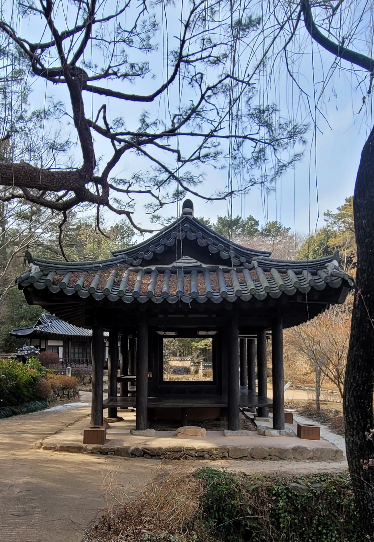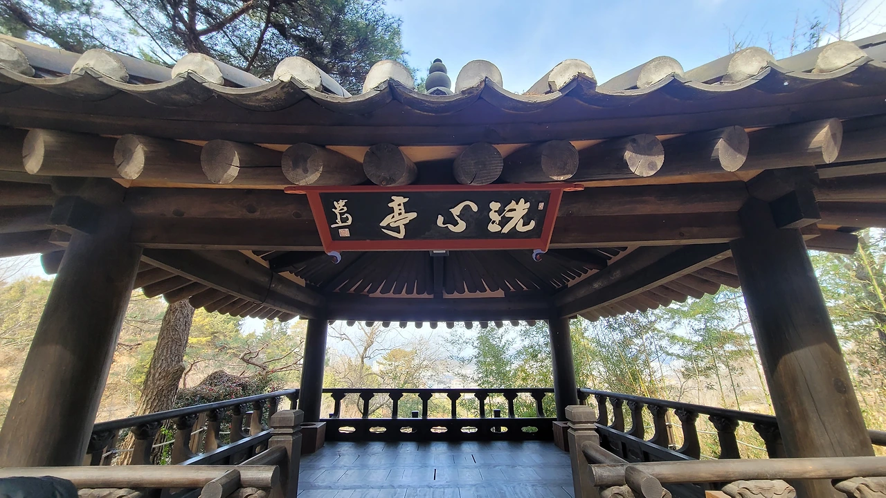 정자와 대나무와 소나무 그리고 동백꽃이 어우러진 풍경이 매혹적이다. 마음을 씻는 정자라는 의미를 담은 현판에 머물러 나도 마음을 씻는다.