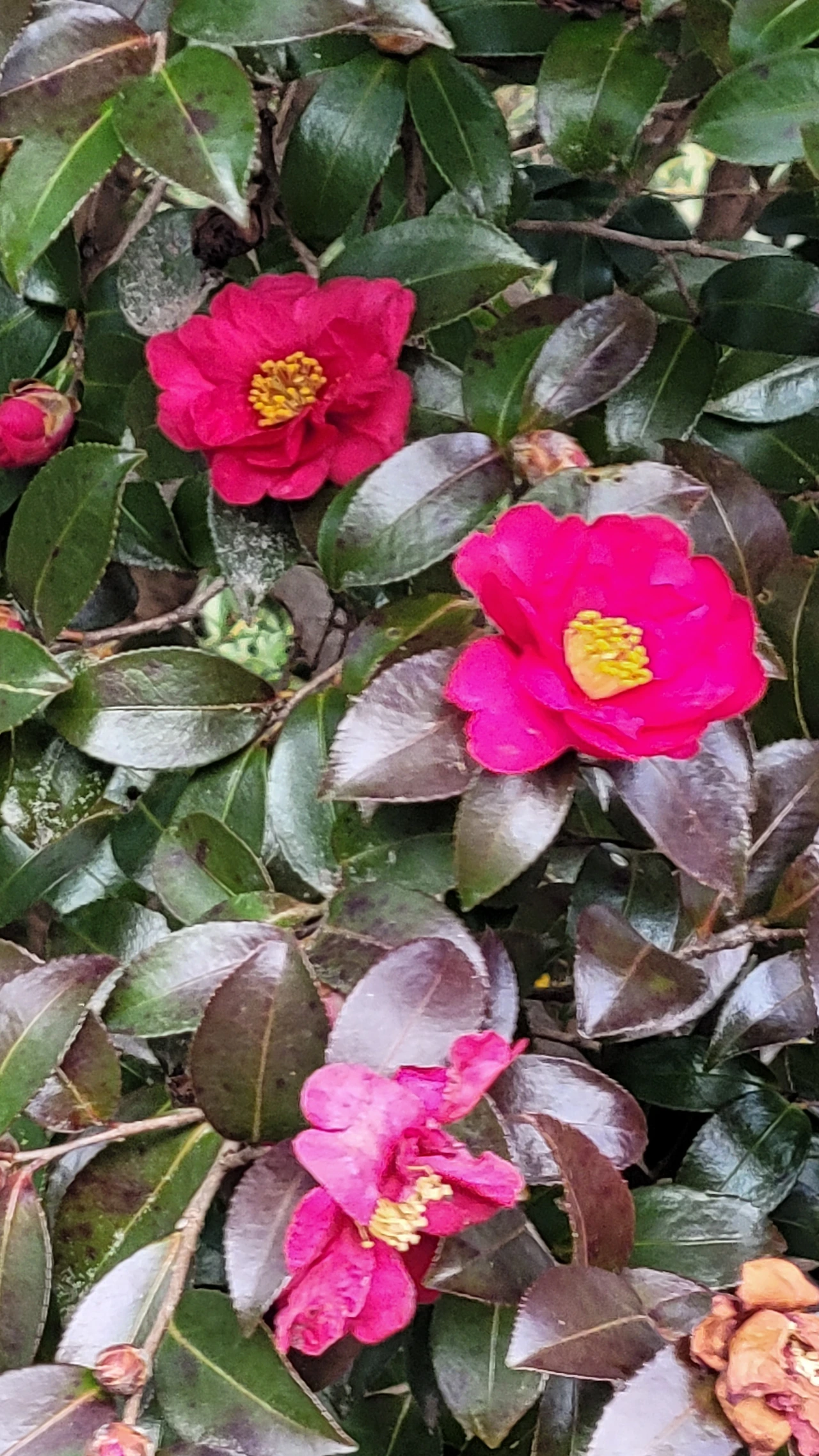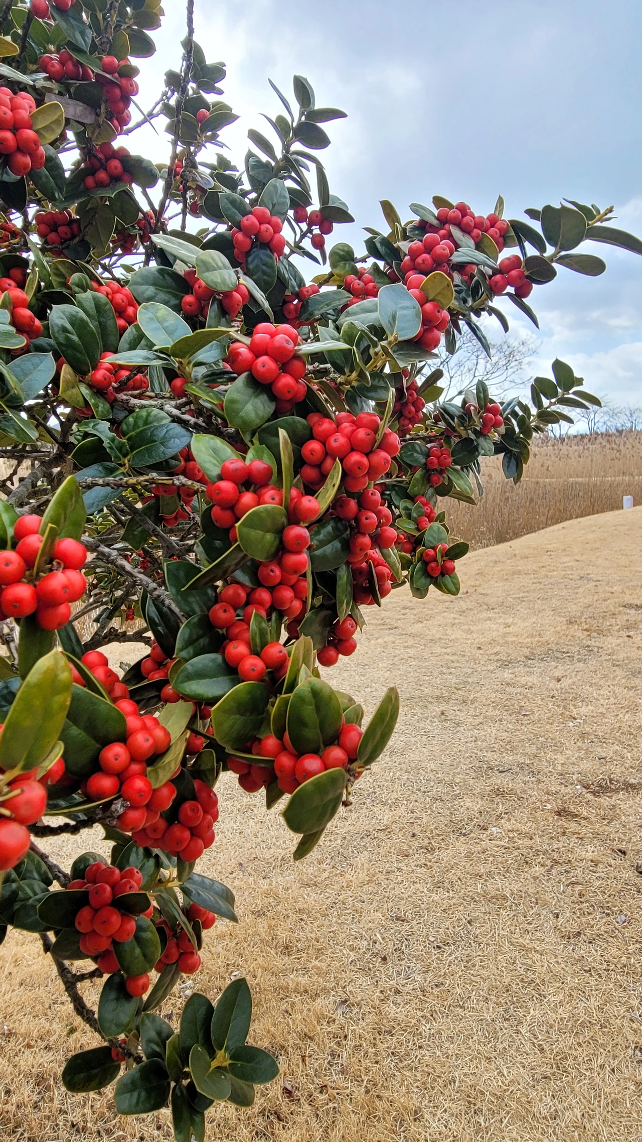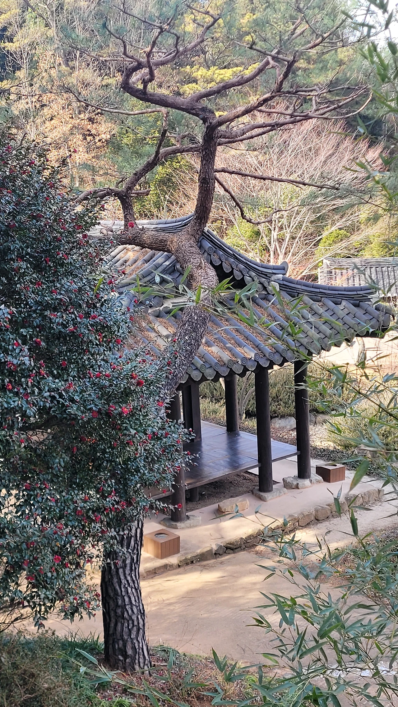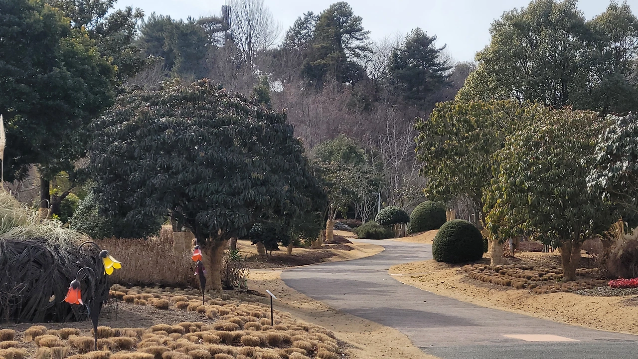 국가정원 1호의 명성을 지닌 곳이라도 한겨울이라 휑 할 줄 알았는데 나름 운치가 있다. 반가운 열매와 꽃도 있어 찾아간 보람이 있다. 겨울에도 푸른 잎을 달고 있는 먼나무에는 꽃보다 붉은 열매가 달렸고 한겨울에도 꽃을 피우는 동백꽃이 사막의 오아시스처럼 빛난다. 따뜻한 남쪽지방이라 상록수 숲도 있다. 손바닥만 한 넓은 잎이 무성한 굴거리나무와 늦가을에 향기로운 꽃을 피우는 금목서를 비롯해서 먼나무까지 푸르름을 간직하고 있다.