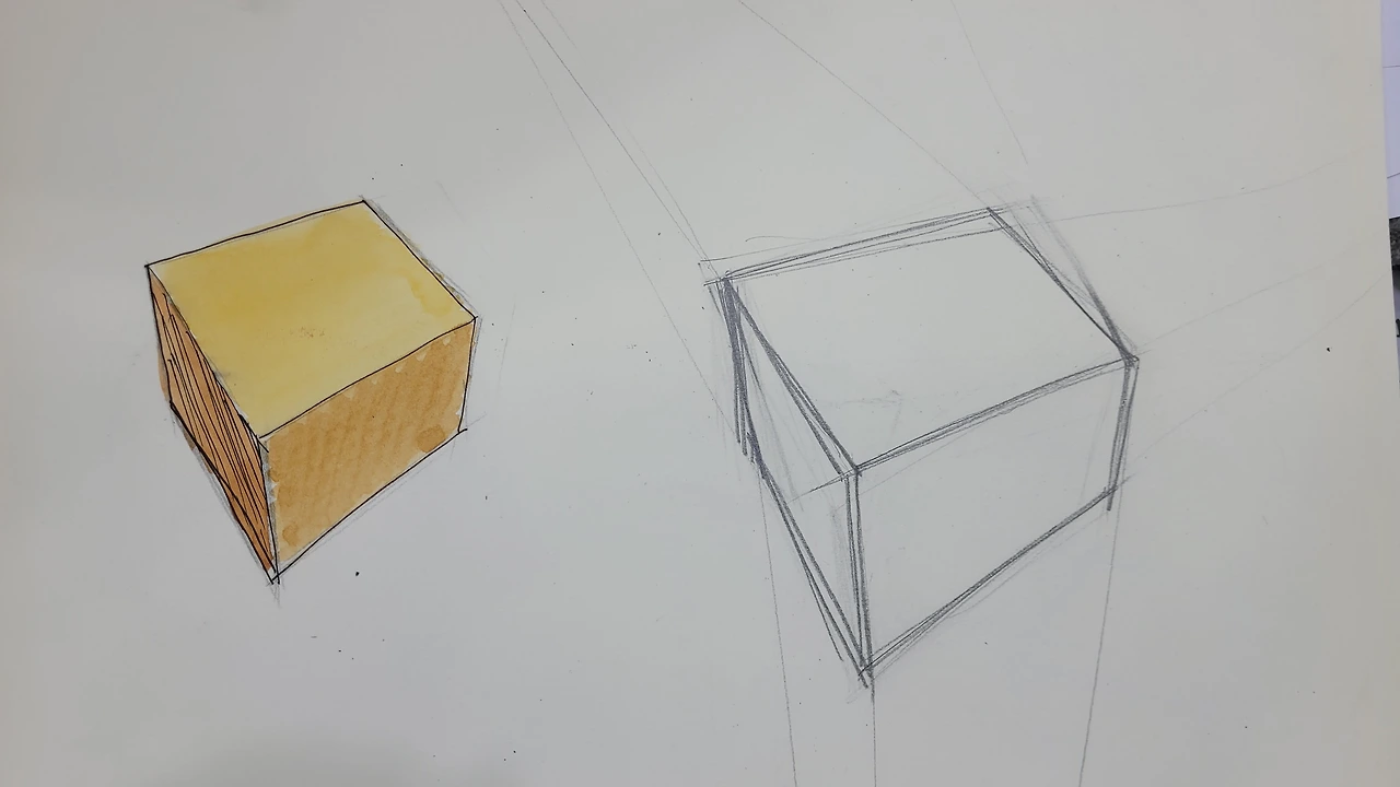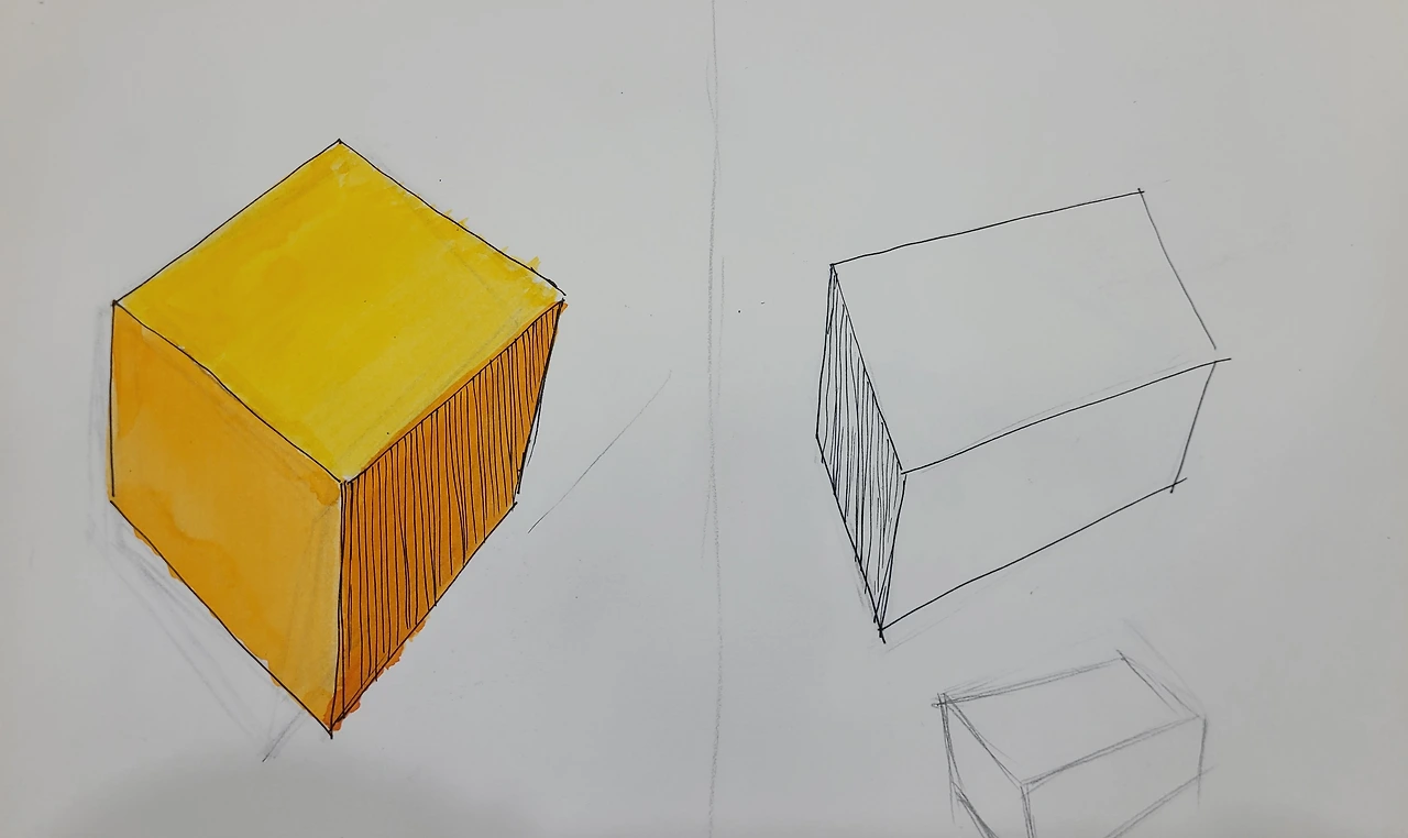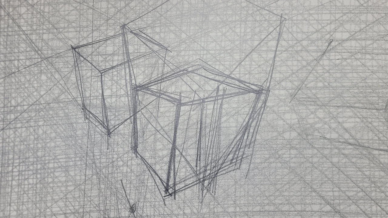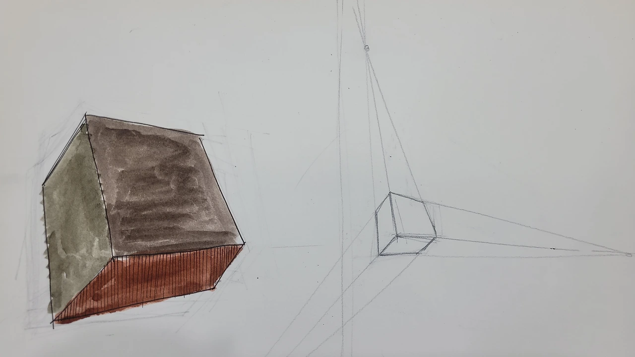 2차 투시도만 해도 삐뚜름해도 그릴만 했는데 3차 투시도는 그리기가 어려웠고 수업 내내 헤매는 시간이었다. 소실점을 표현하려고 애를 썼는데 소실점은 만들어지지 않고 형태도 이상했다.