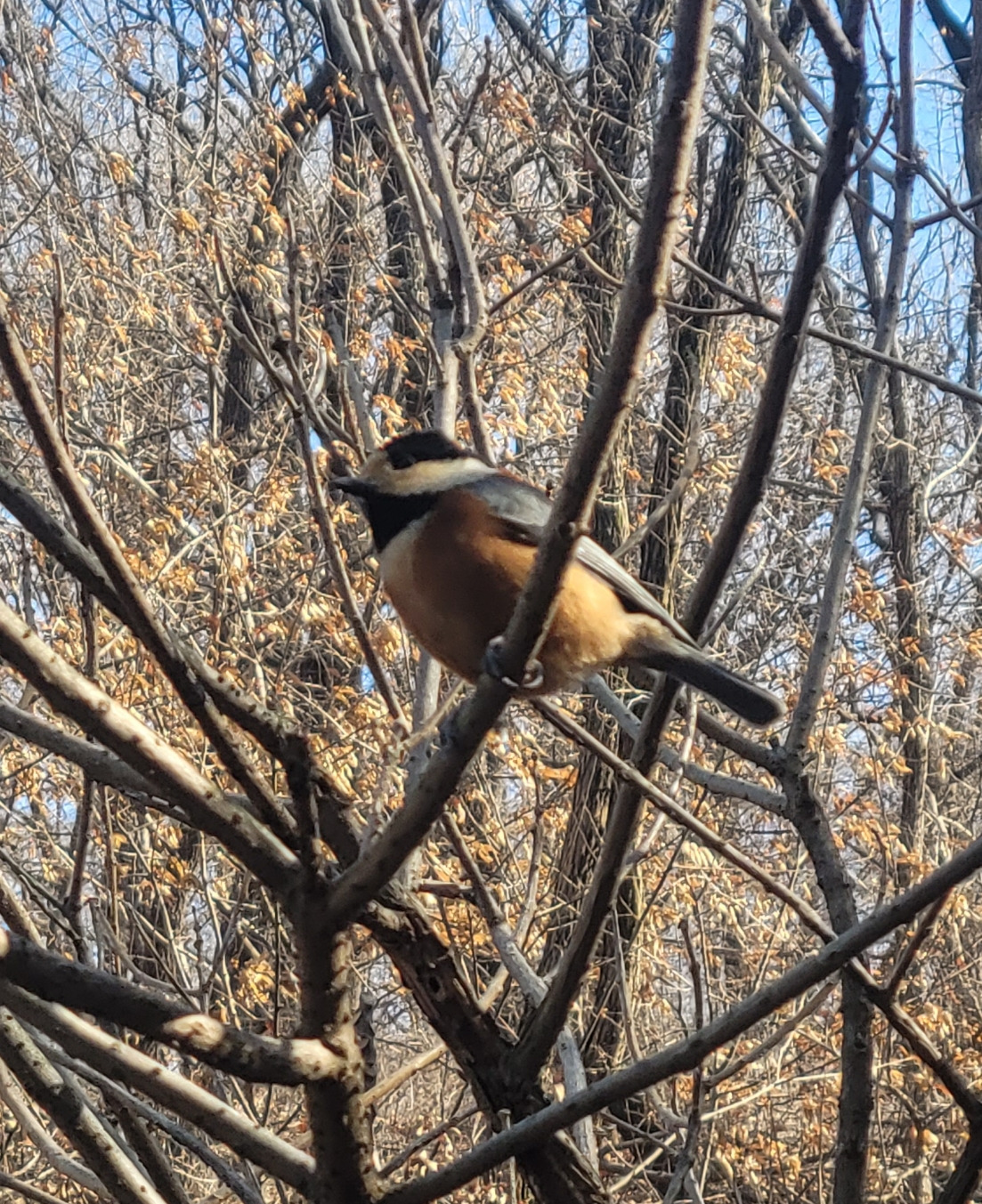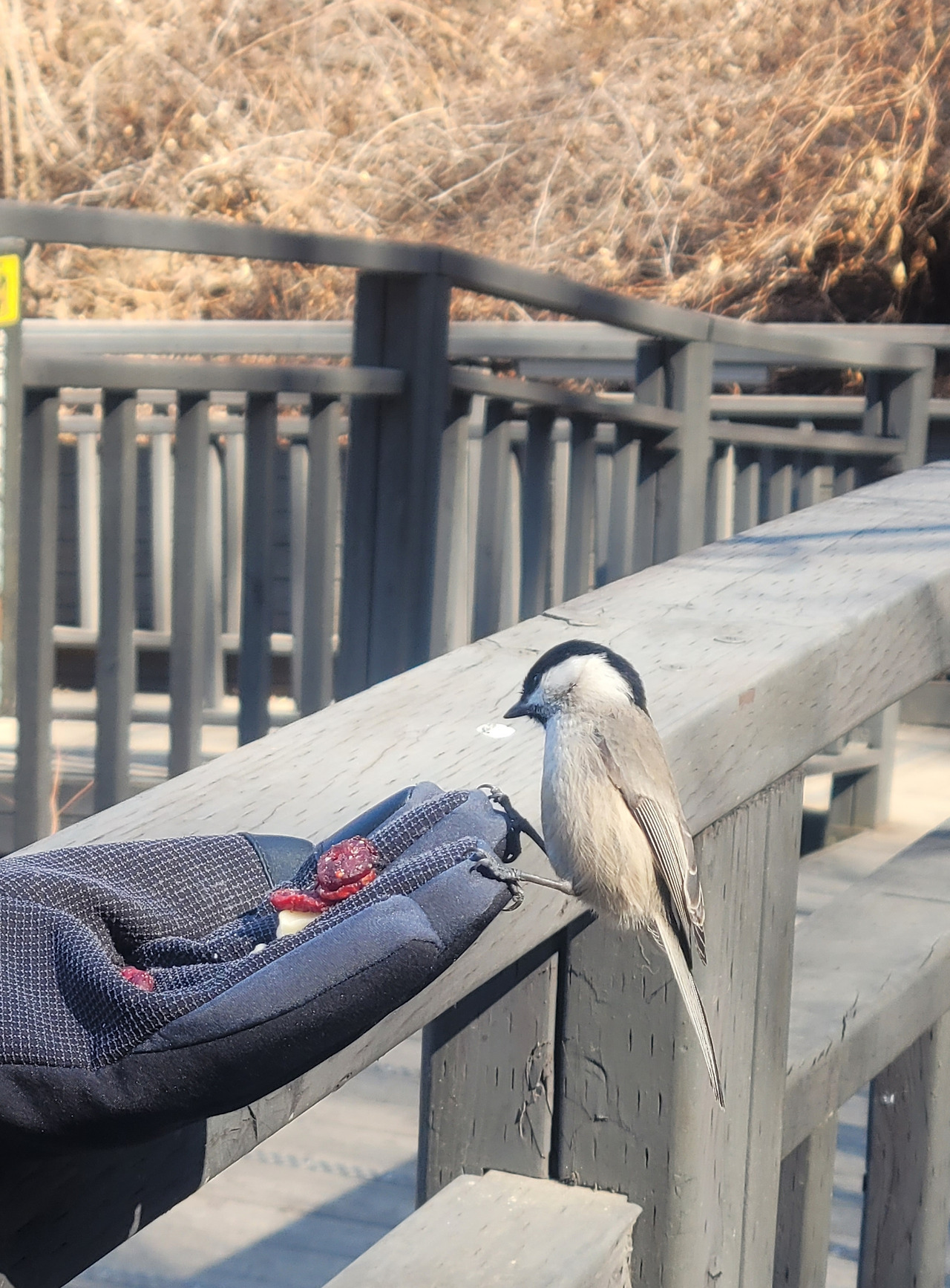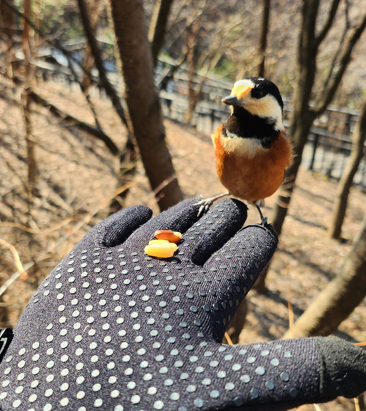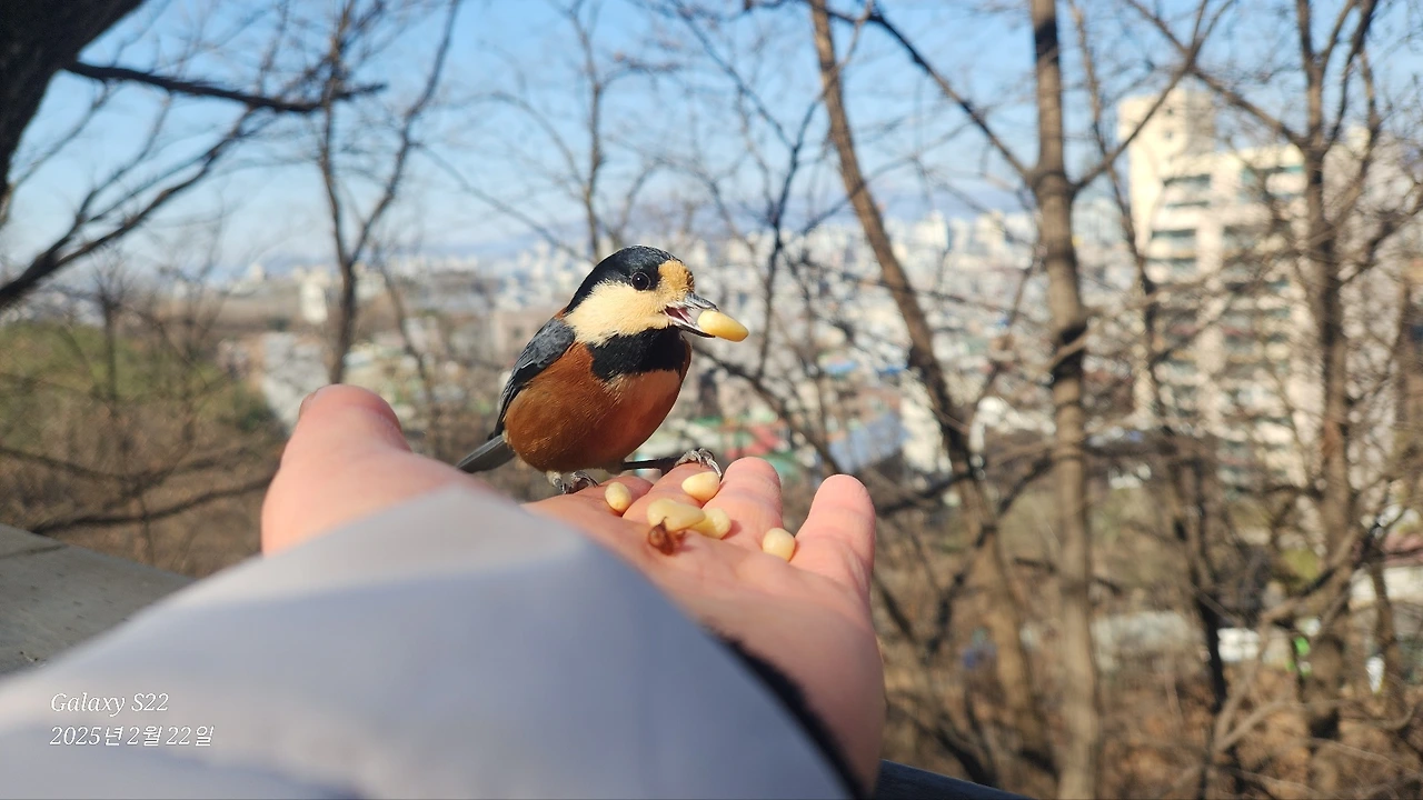얼마 오르지 않아 여기저기 새소리가 난다. 새들과 만남의 시작이다. 새들을 못 보면 어쩌나 하는 걱정이 있었는데 완전히 기우다. 이곳은 사람들이 전해 주는 견과류를 찾는 새들이 많은 곳이다. 모임을 인도하는 리더가 준비한 잣을 각자 받았다. 두렵고 떨리는 마음으로 손바닥에 잣을 올리고 기대하는 마음으로 하늘을 향해 손을 뻗는다. 손이 시릴정도로 추운 날이지만 흥분으로 추운 줄도 모른다. 얼마 되지 않아 새들이 날아든다. 작고 귀엽고 예쁜 새들이 부산스럽게 난다. 자기들끼리 재잘재잘 소란스럽다.