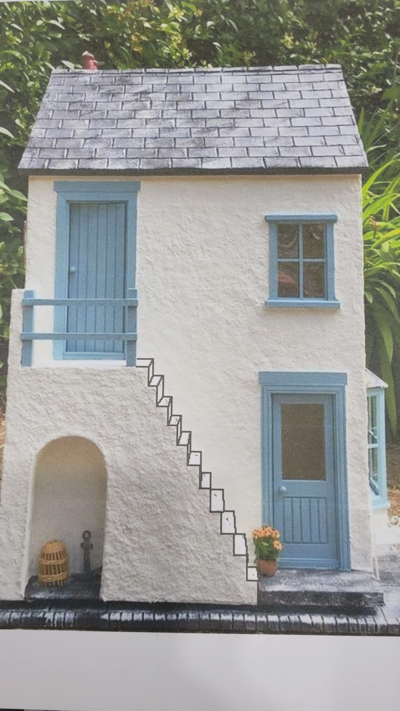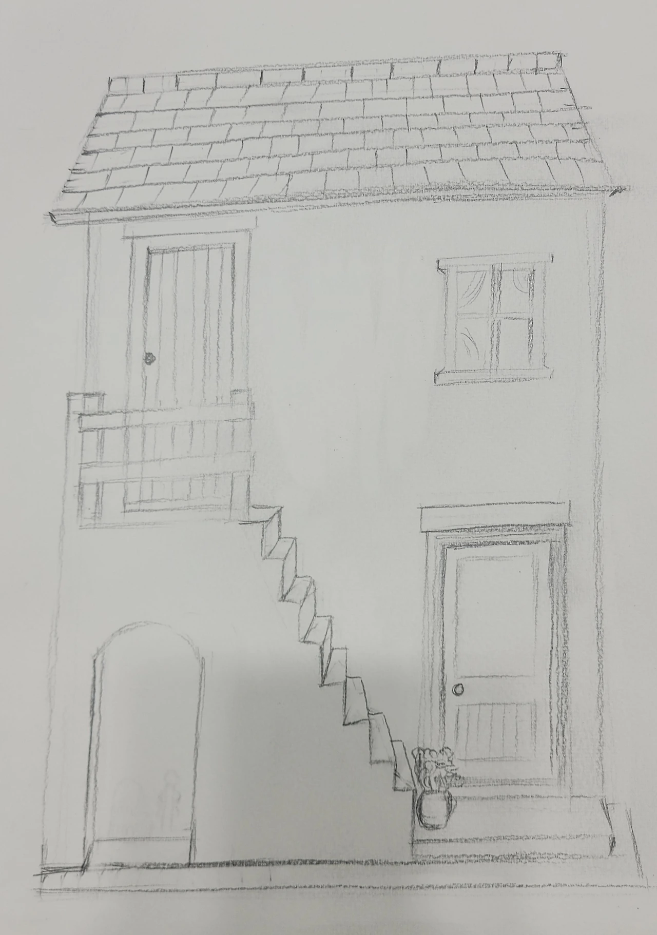 그렇게 기준선을 먼저 잡고 그렸지만 자꾸 균형이 틀어진다. 지붕이 큰 것 같고 문도 그림보다 더 긴 것 같다. 대충 비슷하게 그리긴 했지만 결정적으로 어려운 것은 계단을 그리는 것이었다. 먼저 계단의 기울기가 사진과 같지 않았다. 그런데 손을 보려 해도 그럴 수 없었다. 그림을 처음부터 다시 그려야 하는 상황이다. 하는 수 없이 그대로 둘 수밖에 없었다. 더 어려운 난관이 기다렸다. 계단 하나하나가 위에서 아래로 내려오면 보이는 면이 달라진다. 일단 그리기는 했는데 좀 이상해 보인다. 선생님이 보고는 틀렸다고 수정을 해주셨다.
