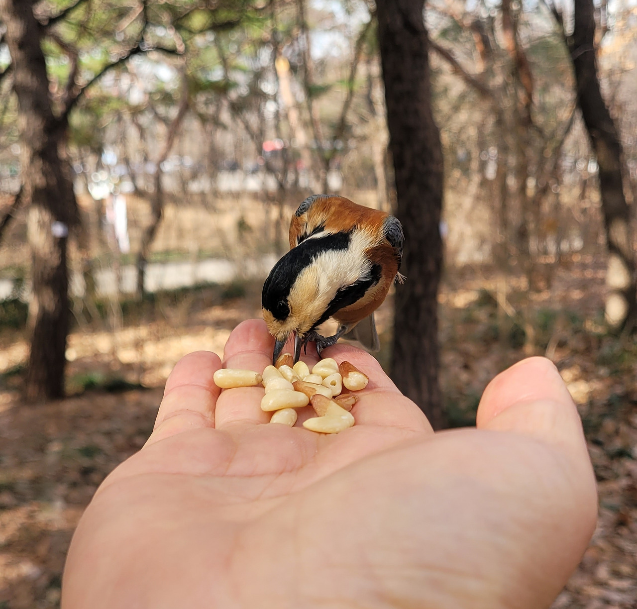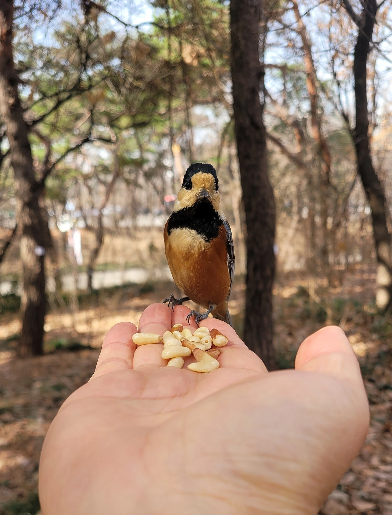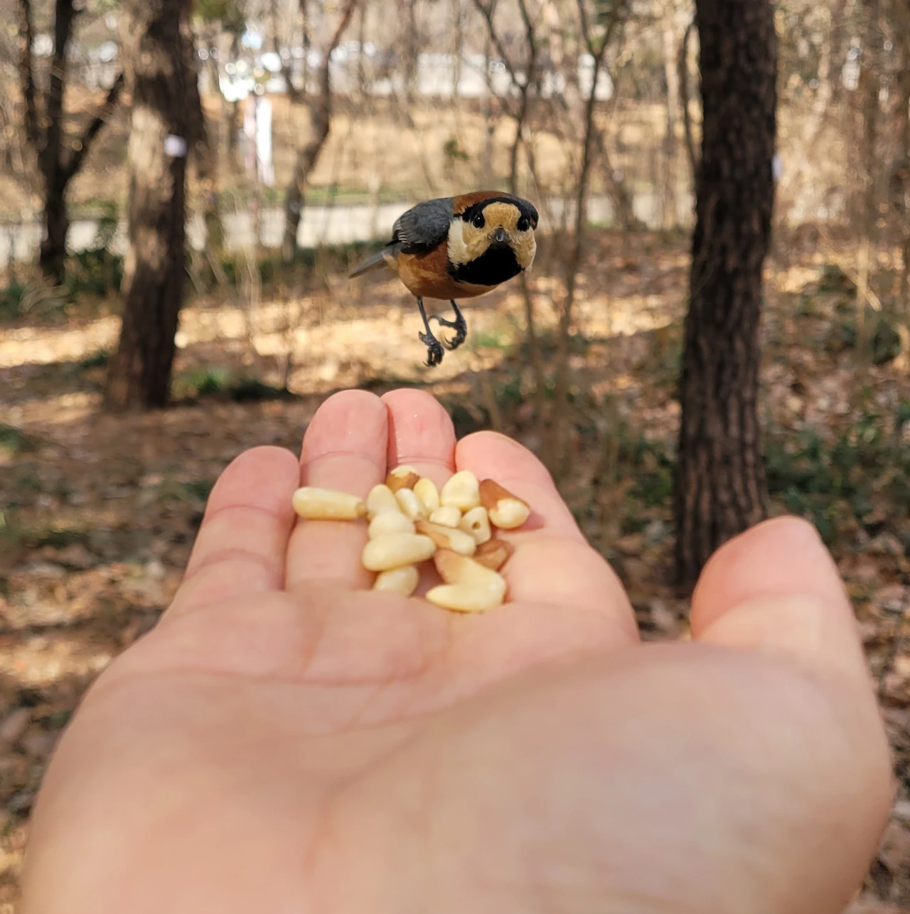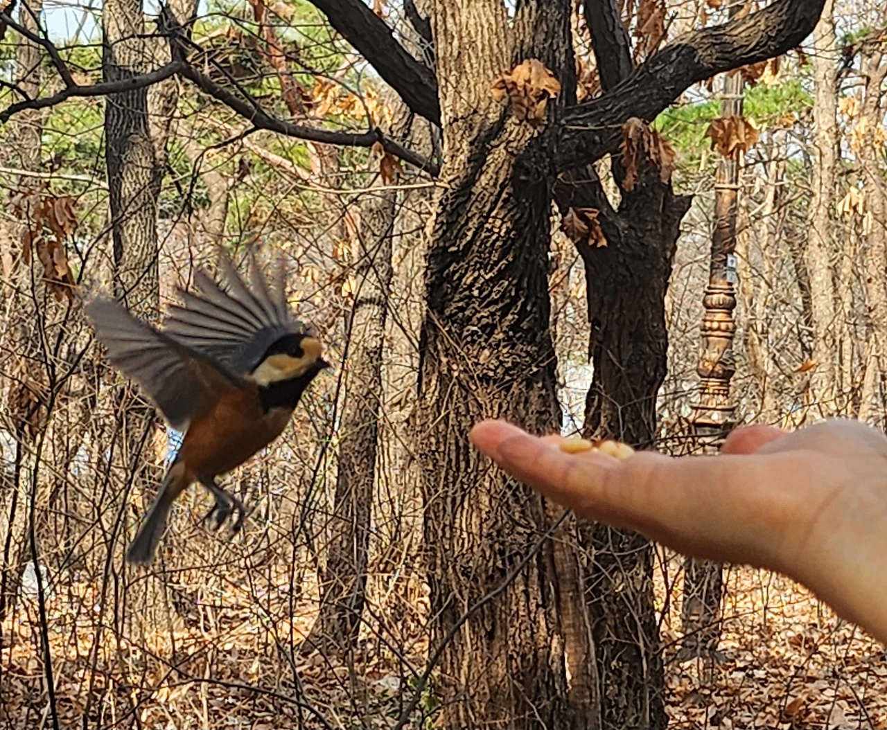 작은 새들이 많이 날아다녀 잣을 손바닥에 올려놓고 새들을 불렀다. 과연 새들이 다가올까 궁금했는데 쇠박새와 곤줄박이가 주위를 맴돈다. 쇠박새는 눈치만 보고 오지 않은 반면, 곤줄박이가 접근해 온다. 아마도 곤줄박이는 새 중에 호기심도 많고 용감한 것 같다. 어디서나 모이를 손에 들면 처음 찾아오는 새는 곤줄박이다. 마침내 곤줄박이 한 마리가 가까이 왔다. 손끝에 앉더니 잣 한 알을 물고 간다. 신기한 것은 손에 앉자마자 곧바로 잣을 물지 않고 잠시 있다가 모이를 문다. 그 짧은 시간이 주는 희열이 굉장하다. 핸드폰에 담느라 셔터를 누르는 찰칵 소리에 놀라기는 했지만 확실히 사람을 덜 두려워는 새다. 야생의 자연과 만남은 언제나 경이롭다.