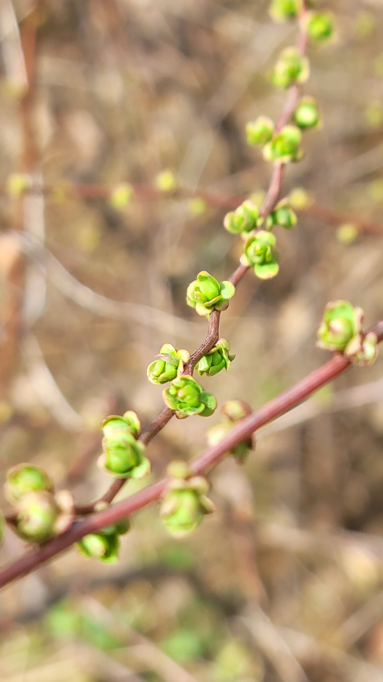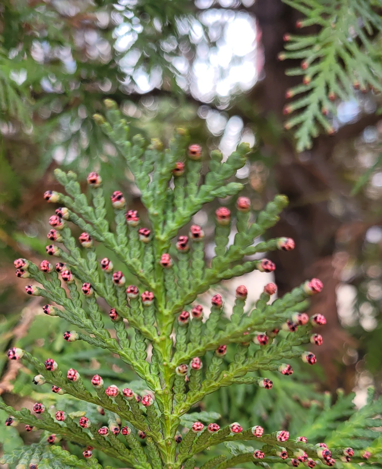 서양측백나무에 핀 꽃도 만났다. 꽃이라고 보기에는 너무 소박하지만 점점이 박힌 붉은 빛이 보석 같아 보인다. 조팝나무도 새순이 돋아나 마치 장미꽃처럼 예쁘다. 확실히 우리 곁에 봄이 왔다.