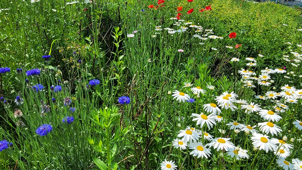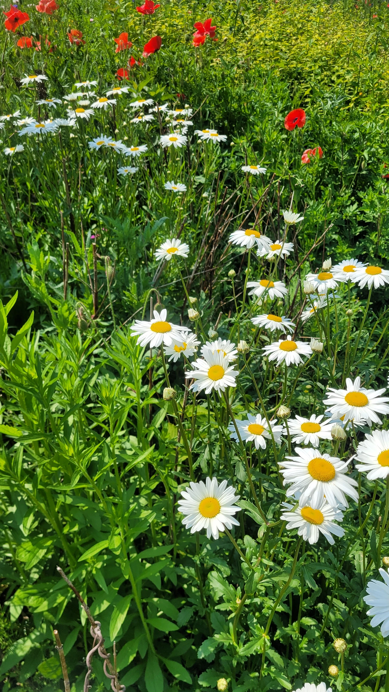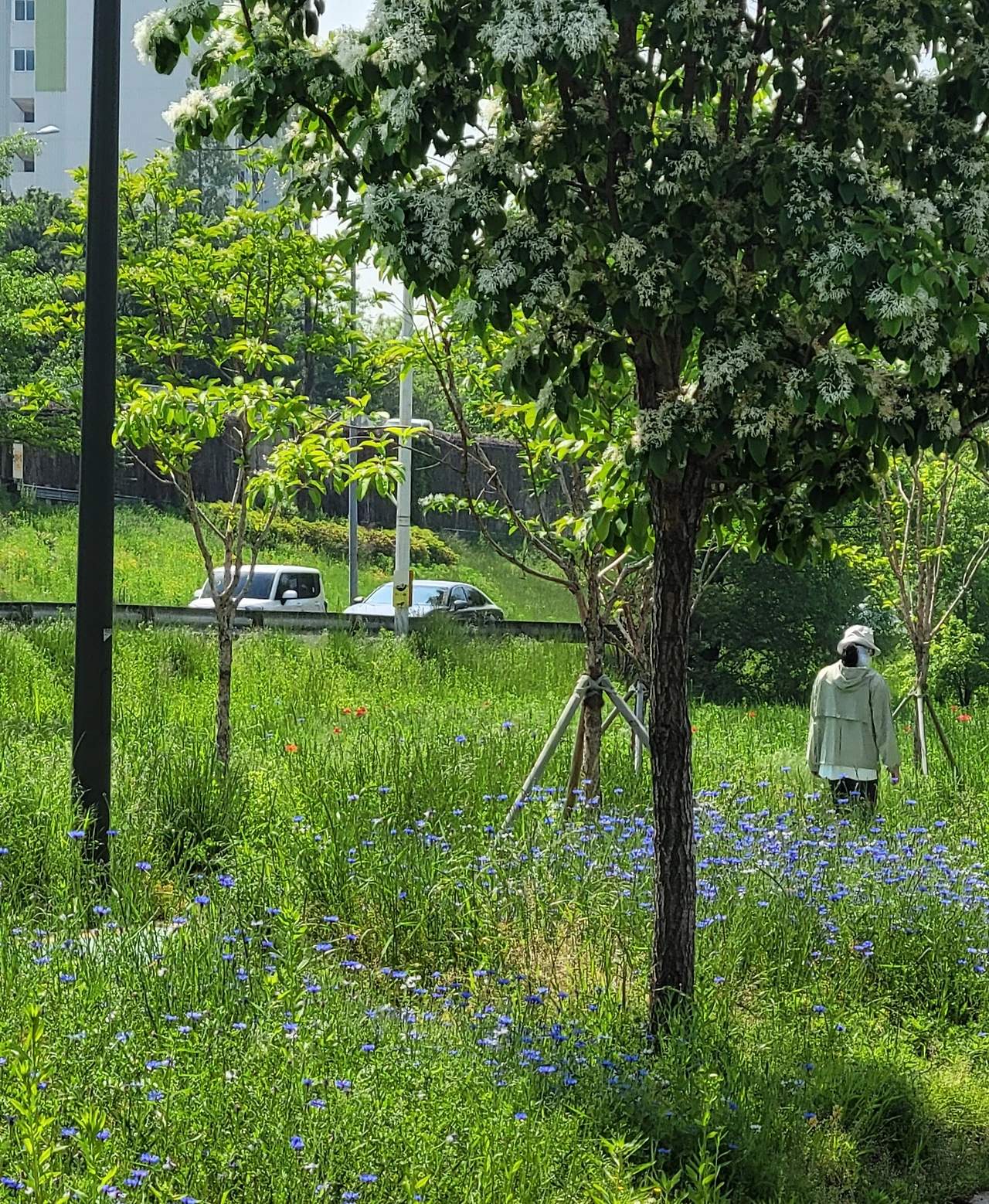 기분 좋음이 마음에서 눈으로 이어진다. 중랑천 가로수로 줄지어 선 느릅나무 잎이 햇살을 받아 반짝인다. 이팝나무도 간간이 꽃을 달고 있다. 풀숲에는 남빛 수레국화가 한창이다. 마치 짝인 양 꽃양귀비도 얼굴을 내밀고 매혹적인 붉은빛을 뿌린다. 서로 경쟁이나 하듯 하얀 마가렛도 무리를 지어 주위를 순백으로 물들이고 있다.