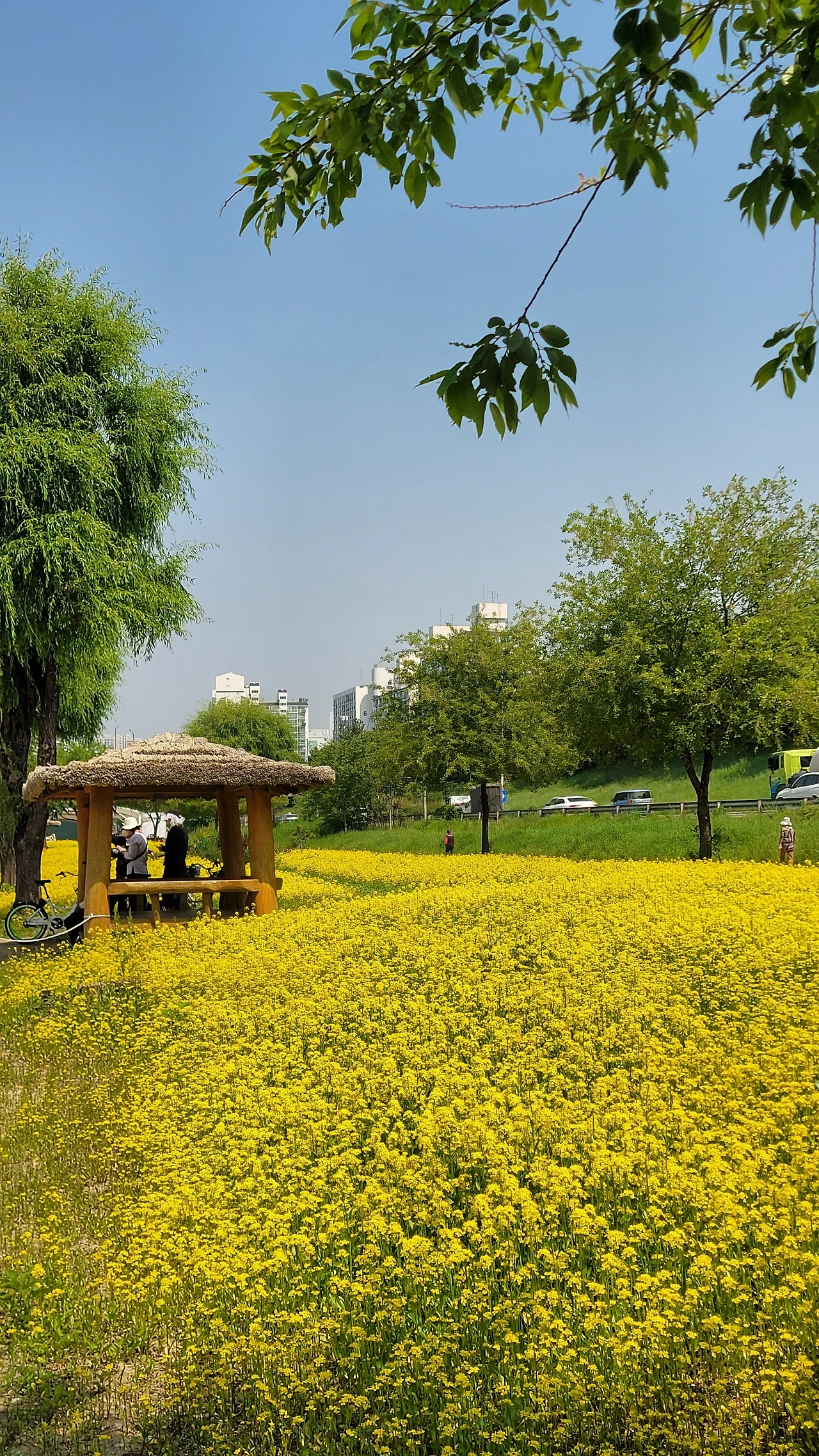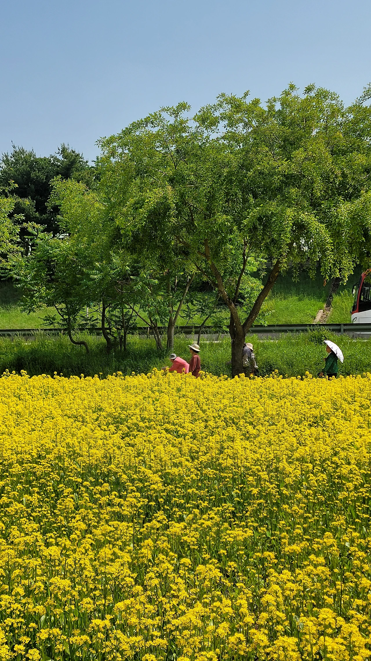 문득 샛노란 물결이 일렁인다. 길 따라 한참을 일제히 꽃을 피운 유채가 물길처럼 이어지며 우리를 반긴다. 노란빛은 푸른 신록과 대조되어 원초적인 원색으로 강렬하다. 자연의 색은 이미 봄을 벗고 완연한 여름을 입었다. 나들이하는 이들의 느긋한 모습이 참 여유롭다.