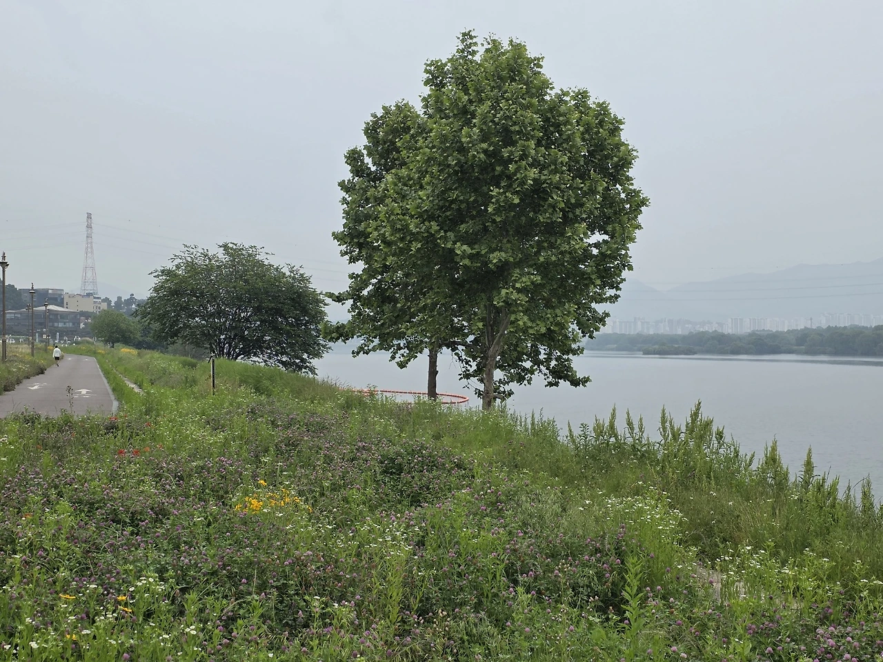 자전거가 달리는 길가 풍경도 기대이상이었다. 운무가 낀 강안 풍경은 신비로웠고 낭만이 흘렀다. 잔잔한 수면 위로 산그림자가 드리웠다. 간간이 작은 섬들도 자리해서 단조로울 수 있는 화폭에 변주를 주었다. 물가에 자라는 나무도 무성한 잎을 달고 물에 비친 제 모습을 조용히 바라보고 있는 모습이 참 평화롭다. 평소 보기 드문 해오라기가 물길을 헤치며 잔잔한 수면에 파문을 일으키고 있다.