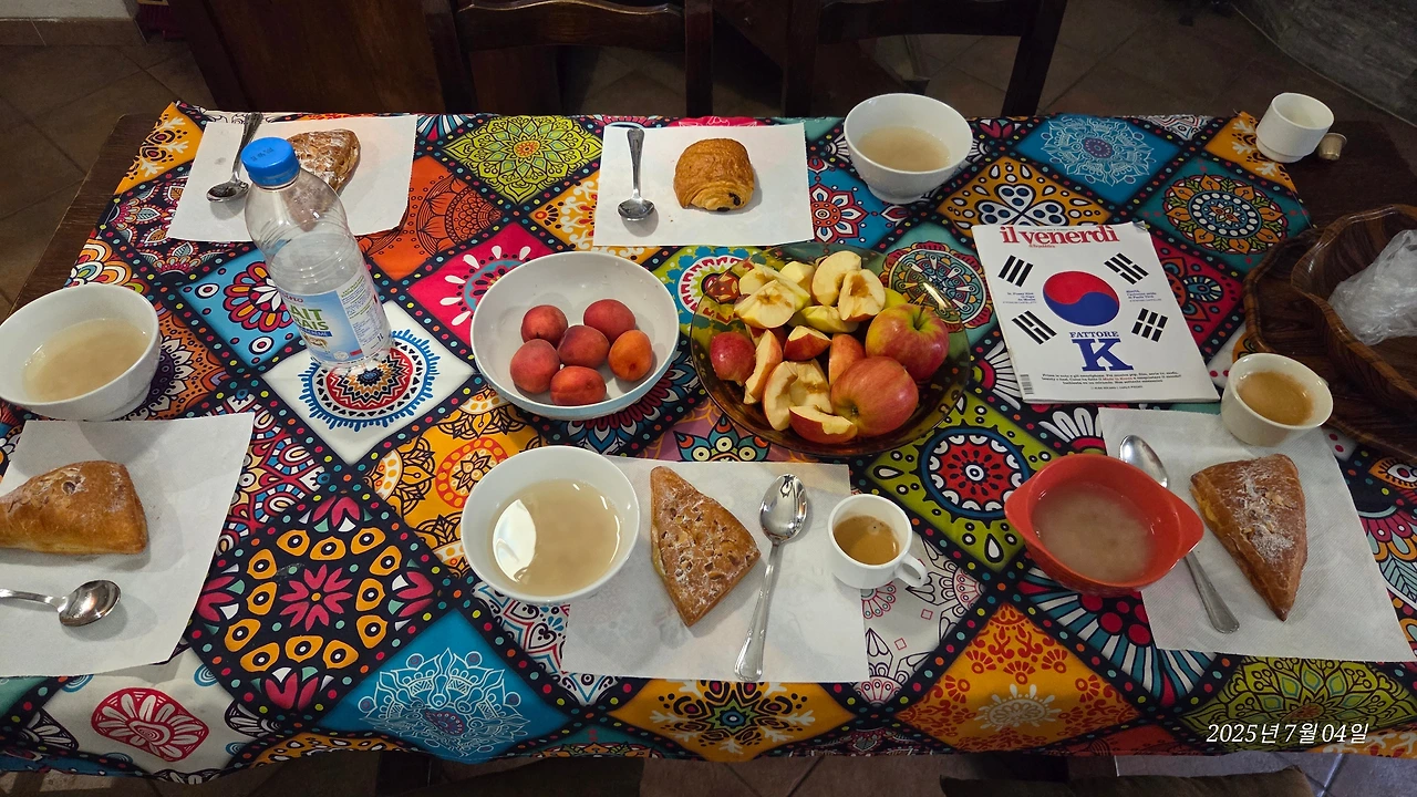 이층으로 된 숙소는 아늑했다. 창을 열고 내다본 풍경은 말할 수 없을 만큼 멋이 있었다. 짐을 풀고 저녁을 간단히 먹고 마을 구경을 나섰다. 산책도 할 겸 식료품점 확인차 나선 것이다. 저녁 9시가 되었는데도 여전히 밝았고 식당은 사람들로 붐볐지만 다른 가게들은 모두 닫은 상태였다. 일행들과 피자집에 들러 현지 음식을 맛보았다. 피자 종류가 너무 많아 우리에게 친숙한 것을 골랐다. 마르게리따 피자와 나폴리 피자로 우리 입맛에 맞았다. 특히 얇고 바삭바삭한 도우가 맛있었다.