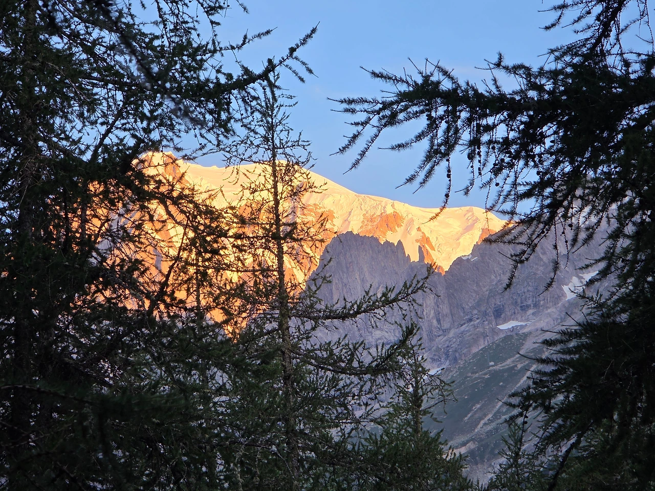 몬테 비앙코가 황금빛으로 물든다. 몽블랑의 이태리어 버전이다. 늘 운무로 가려 보기가 쉽지 않은데 오늘은 맑은 하늘로 선명하게 보인다.