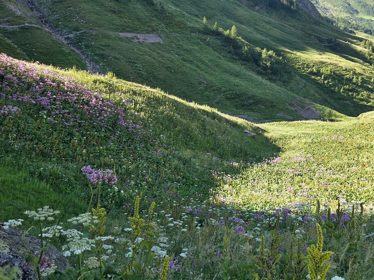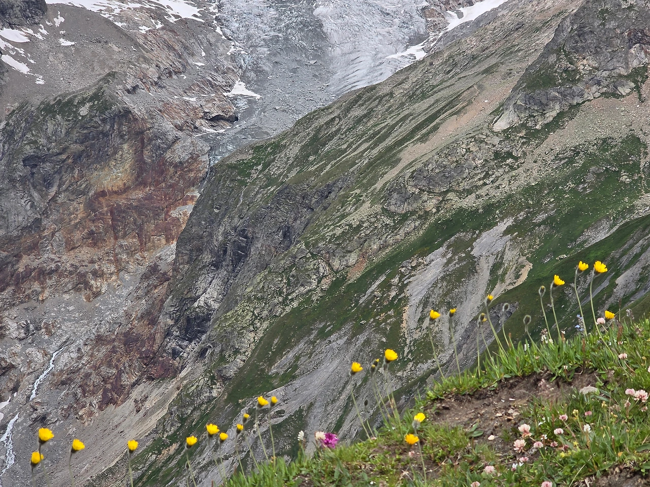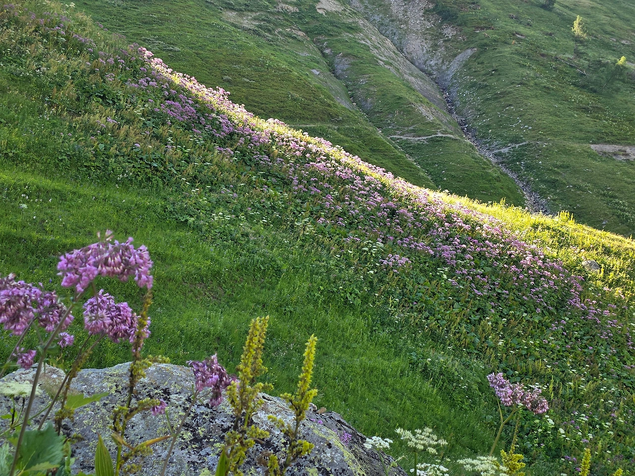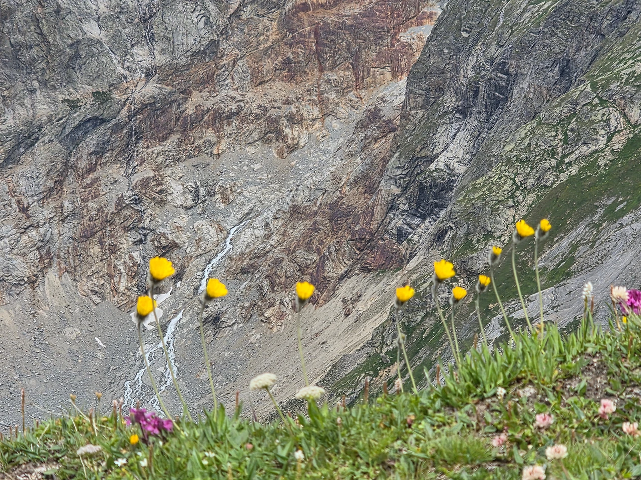 오늘도 먼저 눈길을 끄는 것은 다채로운 야생화들이다. 고지대로 식물들이 살기 쉽지 않은 환경이지만 이에 굴하지 않고 자기 삶을 씩씩하게 이어가는 것을 보면 작은 꽃 하나하나가 대견해 보인다. 몽블랑트레킹은 웅장한 산세도 대단하지만 낮은 곳에서 힘껏 살아가며 지면을 물들이는 꽃들도 대단한 볼거리다. 한 송이로도 충분하지만 다 같이 모여 피면 장관을 이루어 사람들에게 감동을 안긴다.