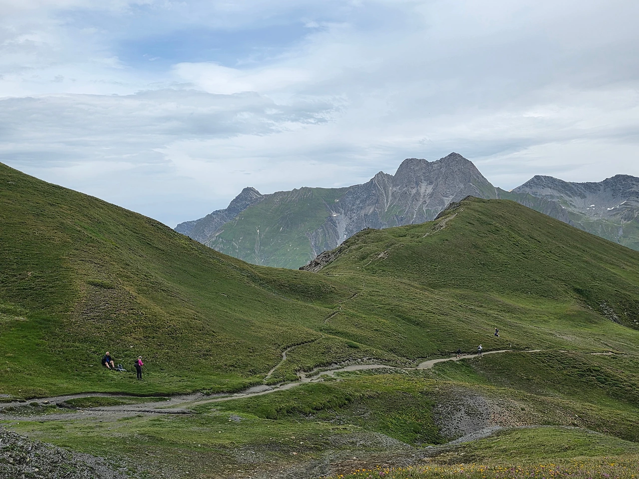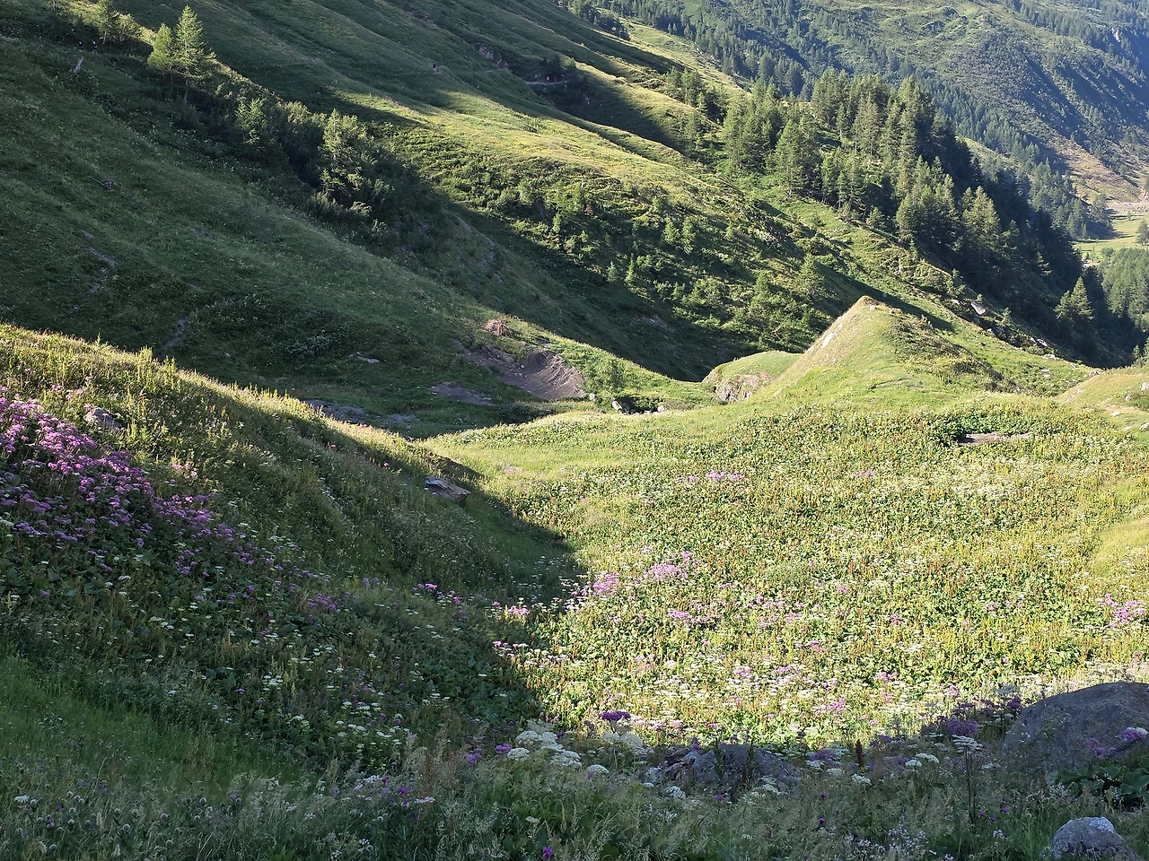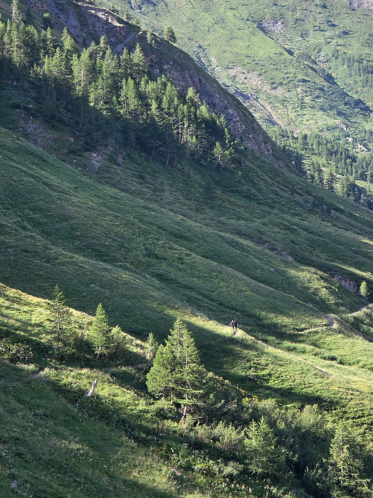 우리 트레킹이 주로 프랑스와 이탈리아 알프스 지역을 도는 것이어서 스위스 알프스 지역은 빠진다. 그래서 잠시나마 스위스 땅을 밟고 싶은 마음이 있었다. 그래서 일행과 헤어져 스위스 알프스 둘레길을 걸았다. 특별히 달라진 풍경은 없지만 스위스 땅이라는 의미가 크게 다가온다. 30분 정도 걸어서 산너머까지 다녀왔다. 그 정도로 충분하다 여겨져 발길을 돌린다. 돌아가는 걸음은 아주 가볍다.