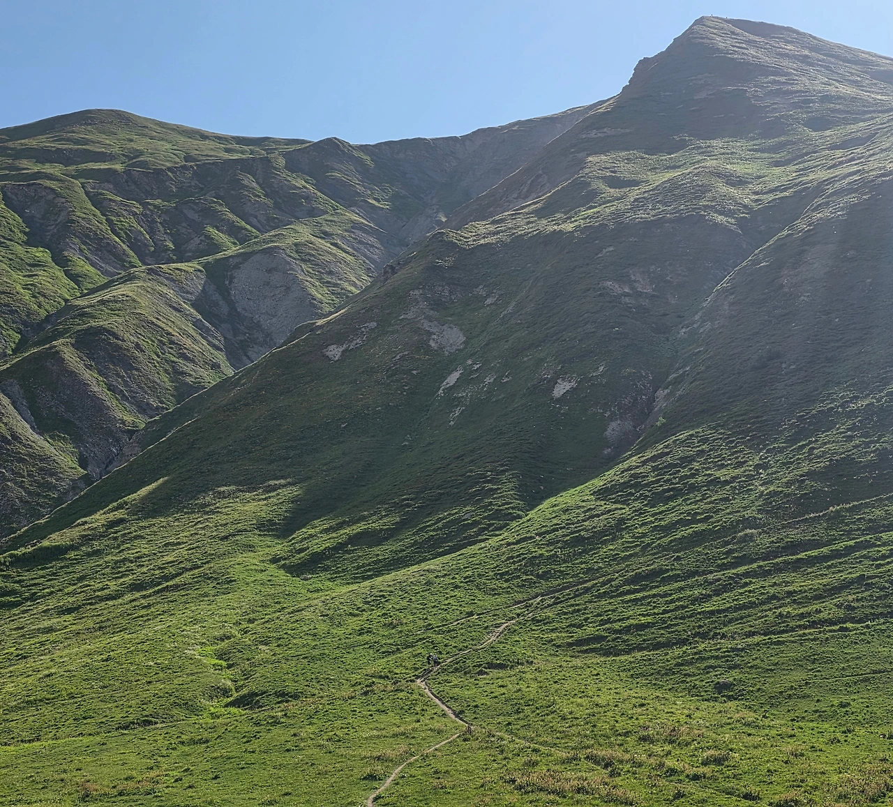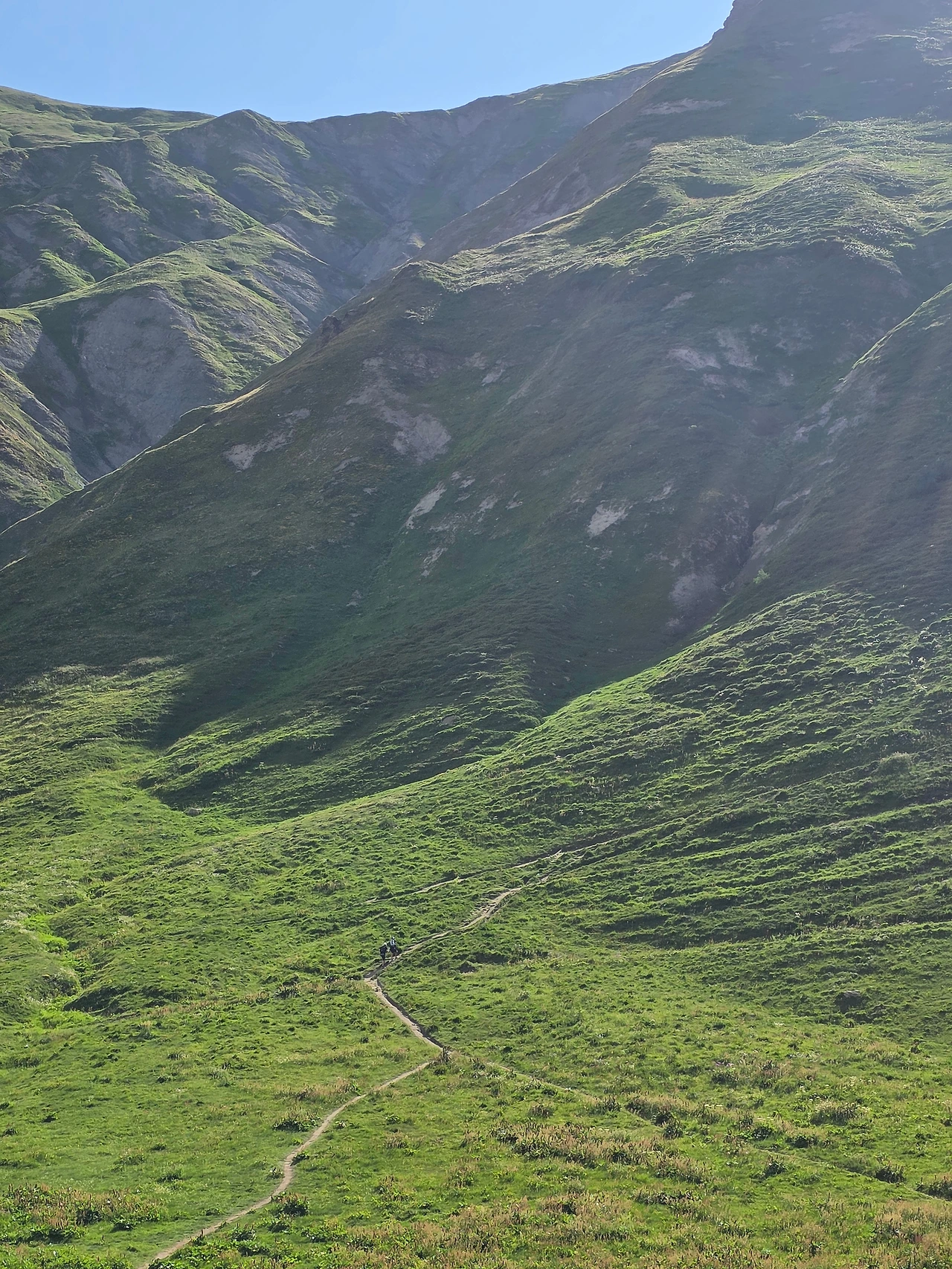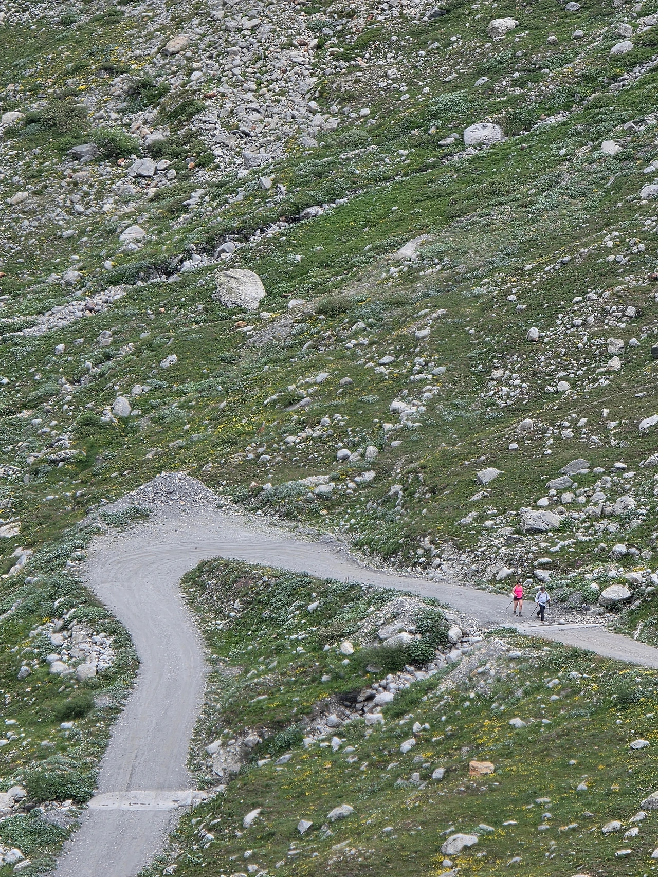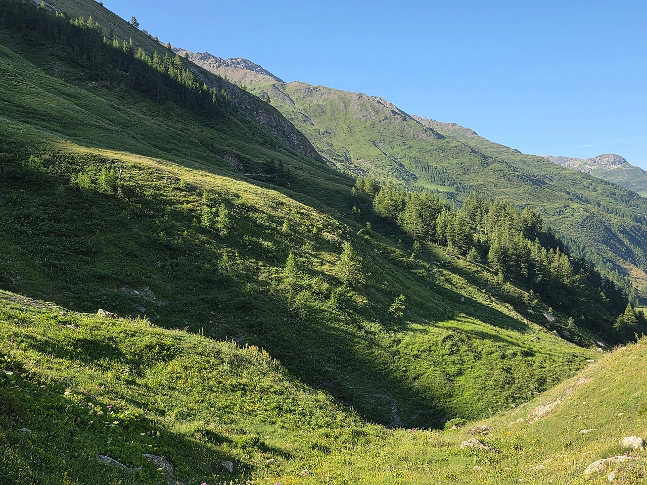 우리 트레킹이 주로 프랑스와 이탈리아 알프스 지역을 도는 것이어서 스위스 알프스 지역은 빠진다. 그래서 잠시나마 스위스 땅을 밟고 싶은 마음이 있었다. 그래서 일행과 헤어져 스위스 알프스 둘레길을 걸았다. 특별히 달라진 풍경은 없지만 스위스 땅이라는 의미가 크게 다가온다. 30분 정도 걸어서 산너머까지 다녀왔다. 그 정도로 충분하다 여겨져 발길을 돌린다. 돌아가는 걸음은 아주 가볍다.