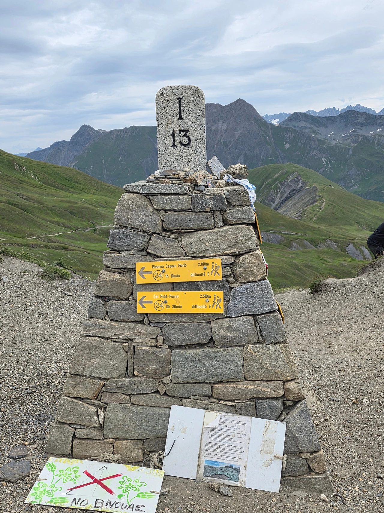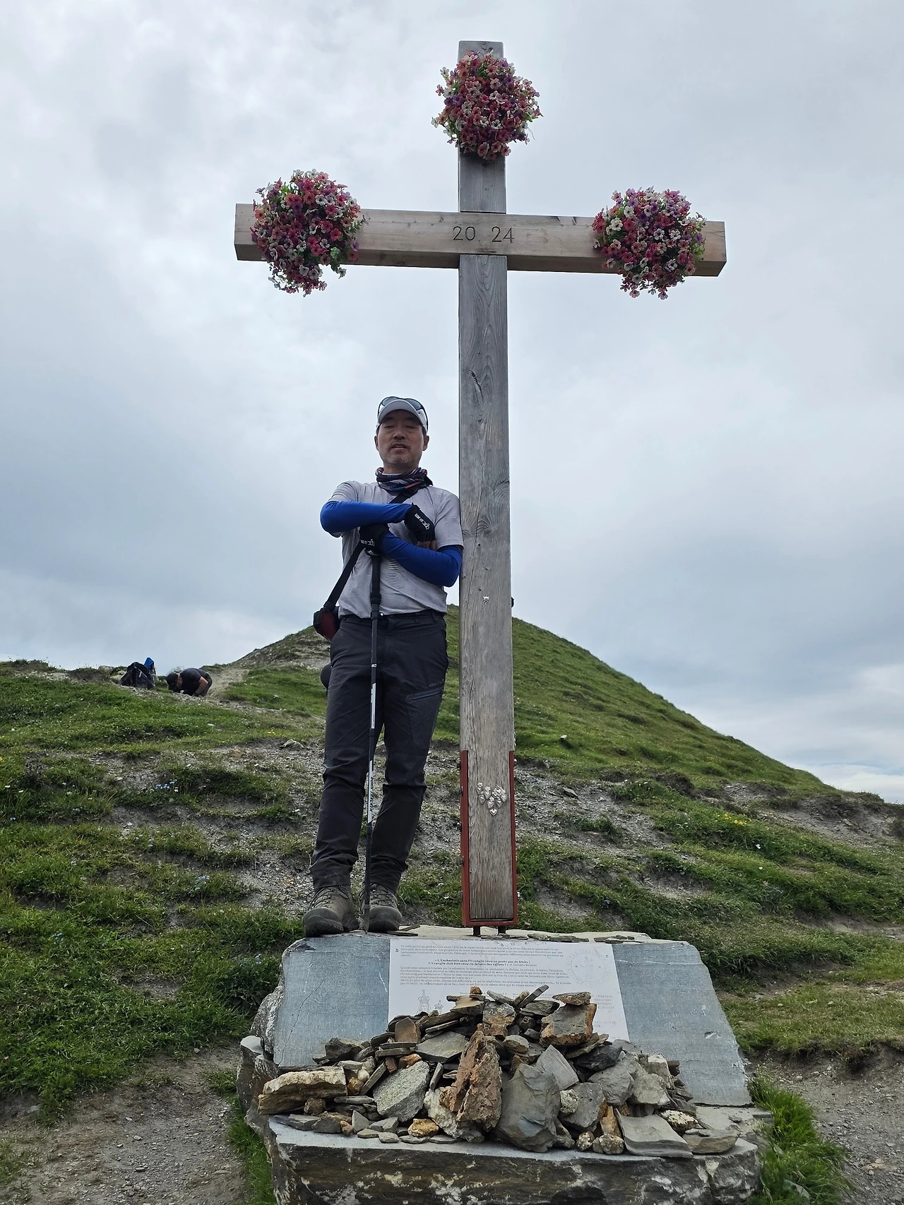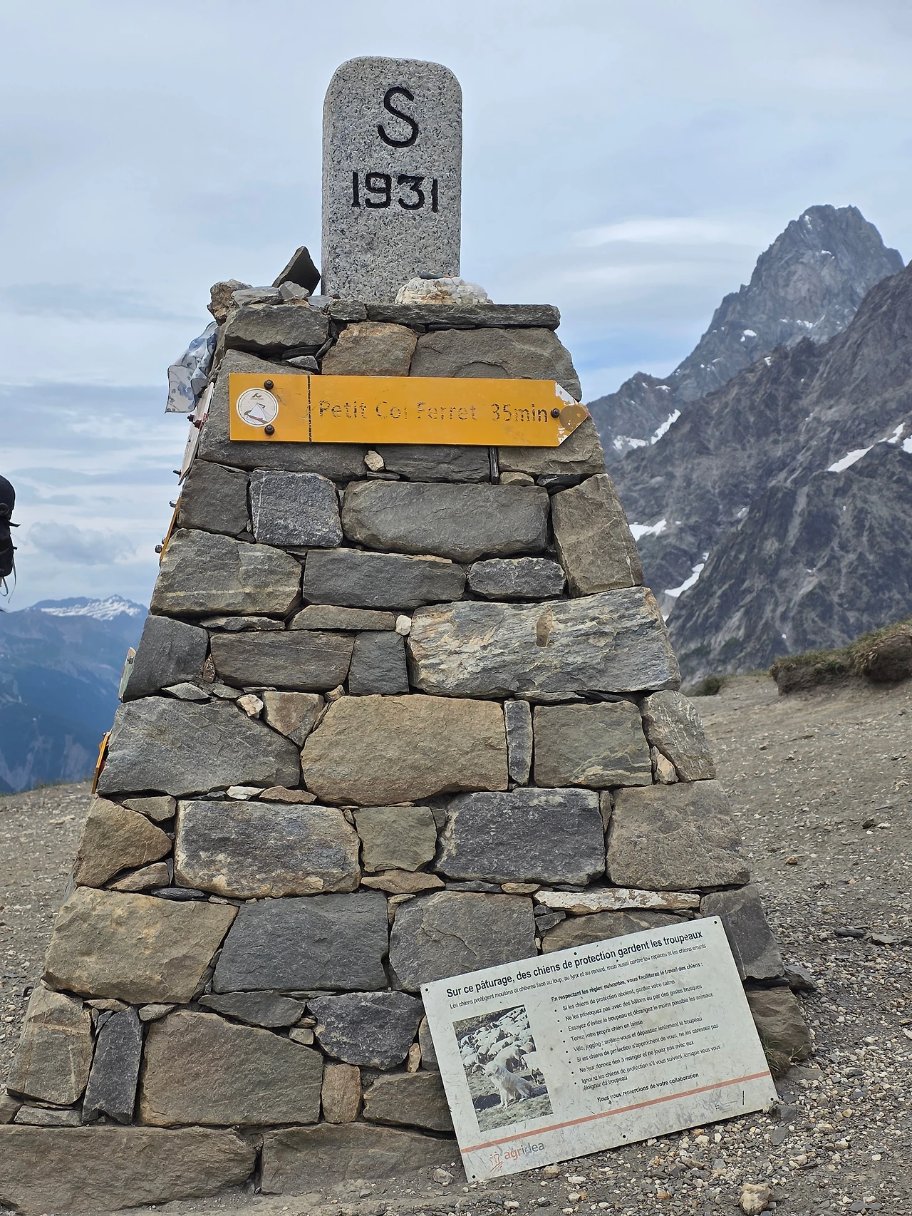 마침내 목적지에 올랐다. 많은 이들이 휴식 중이다. 우리도 자리를 잡고 목적지에 도달한 뿌듯함을 안고 휴식을 즐긴다. 건너편 산자락이 스위스 알프스라는 사실이 경이롭다. 그랑 페레 언덕에는 소박한 탑이 있다. 이태리와 스위스의 경계를 알리는 표석이다. 돌에 새겨진 I 는 이태리 S 는 스위스 땅을 알려준다. 커다란 십자가도 서 있다. 화환을 두른 모습이 인상적이다.